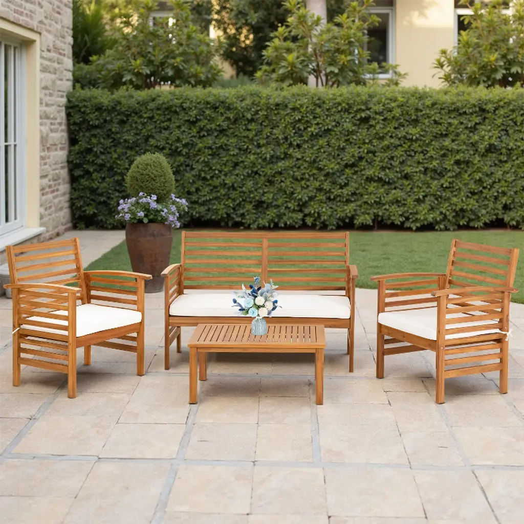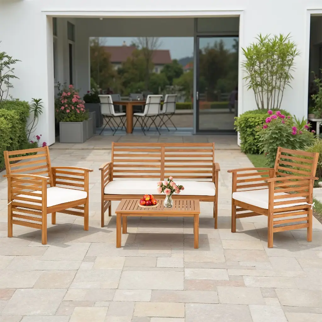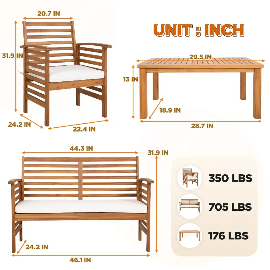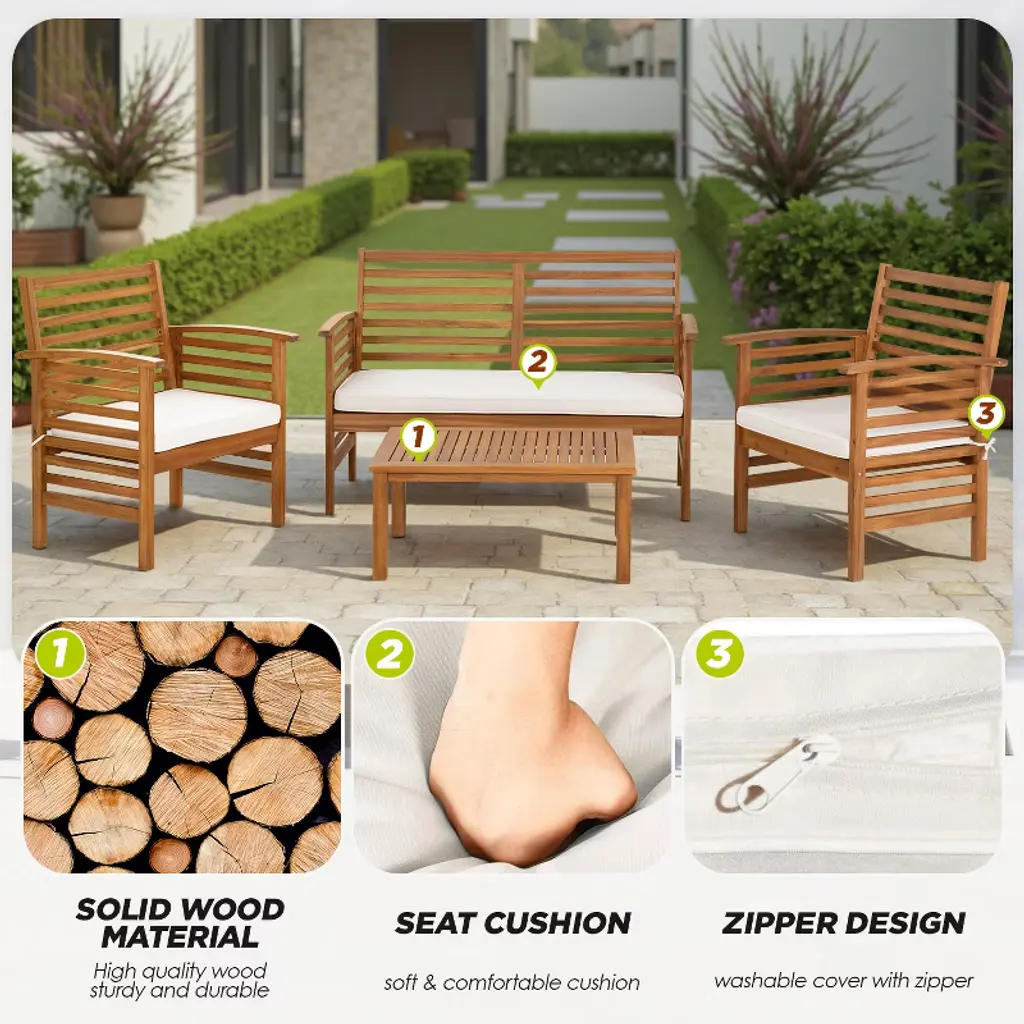 BestMassage Acacia wood outdoor sofa set combines durability, comfort, and style, making it an ideal choice for patios, gardens, and balconies. Crafted from high-quality natural Acacia wood, known for its strength and resistance to cracking, this set features thick, soft cushions with removable, washable covers for easy maintenance. The sturdy design includes secure slats and sloping backrests for added stability and comfort. With simple assembly and space for 4-5 people, it's perfect for outdoor gatherings, providing a cozy spot to relax, drink tea, or enjoy meals with family and friends.