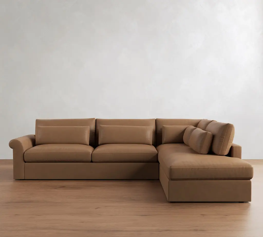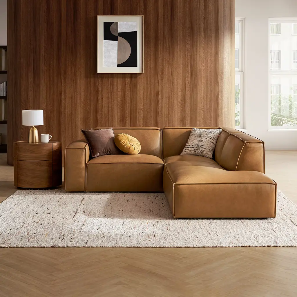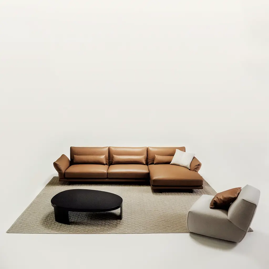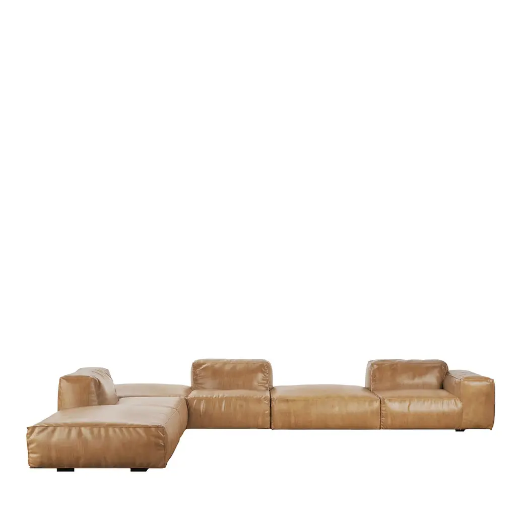 The pleasure of a fine leather stroke meets the sink-in comfort of plush volumes in this superb modular sofa with an incorporated chaise longue. Elevated atop slim metal feet, the frame has its generous padding enveloped in first-rate brown leather (ref. Silk 30237), for a sublime tactile feel that heightens the tailored comfort offered by the armrests' adjustable quality. Decorative cushions are included.