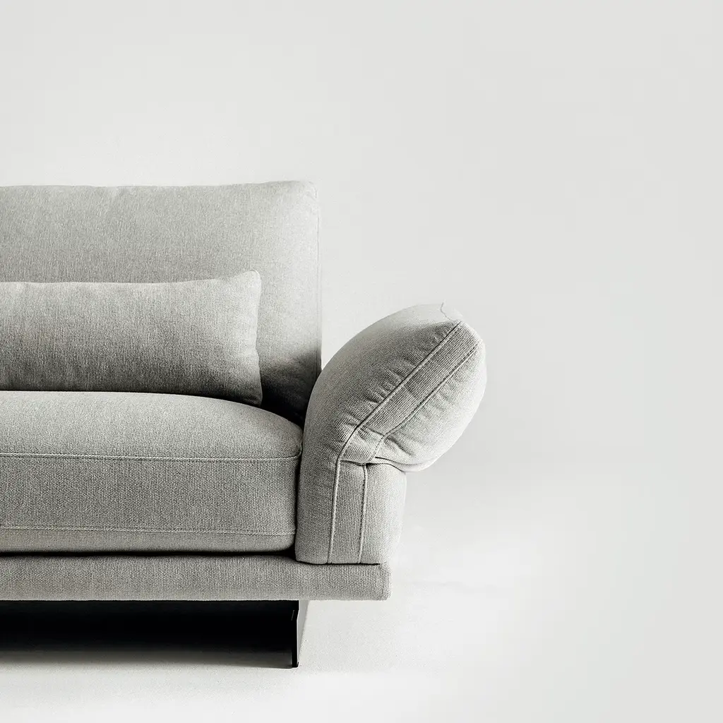 A three-seater version of a modular design that allows for countless original arrangements, this sofa promises flawless comfort at first glance. Raised on thin metal feet, its structure nestles in a generous amount of padding and soft gray fabric upholstery (ref. M163/5). Adjustable as desired, the armrests allow for a customized seating experience capable of following one's mood. Decorative cushions are included.