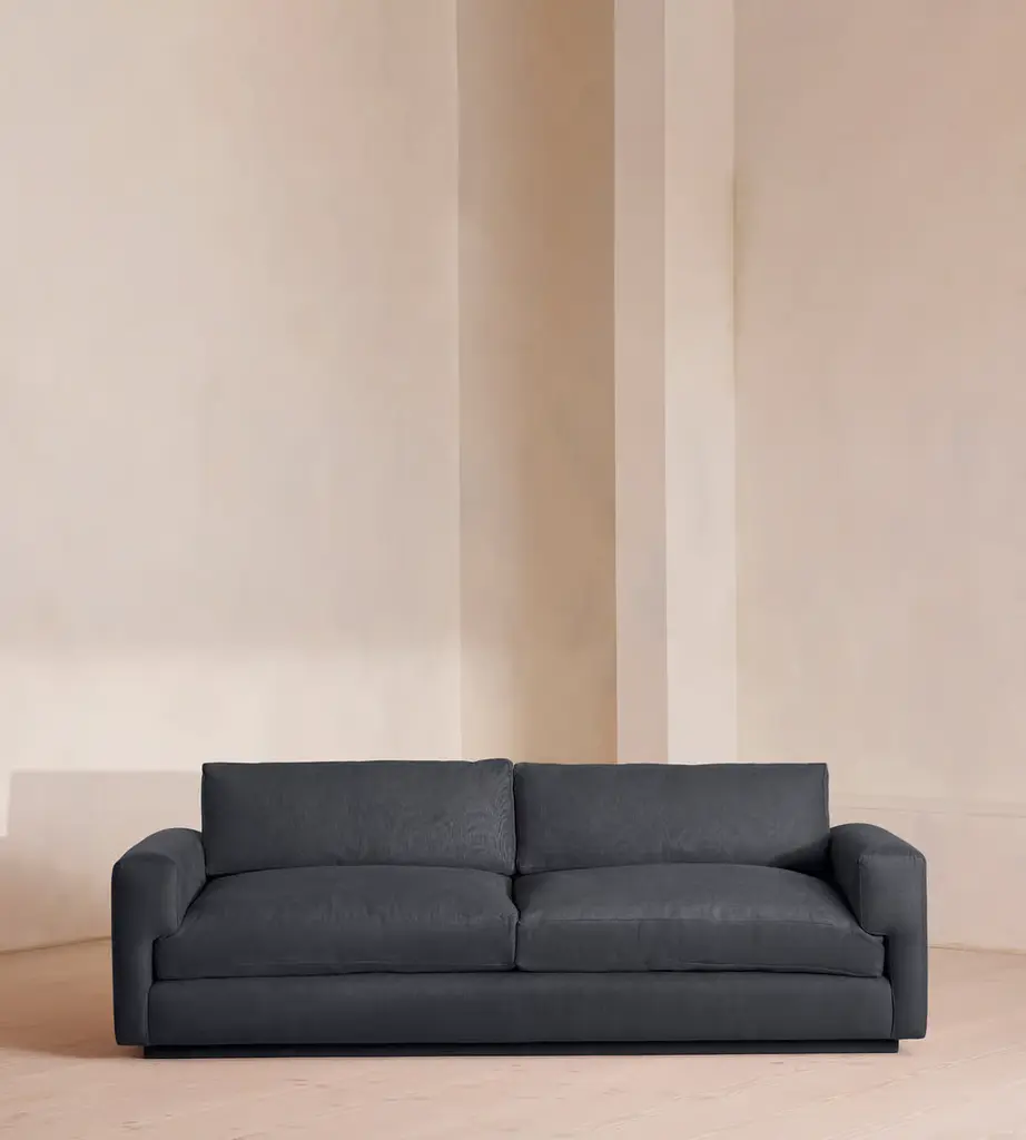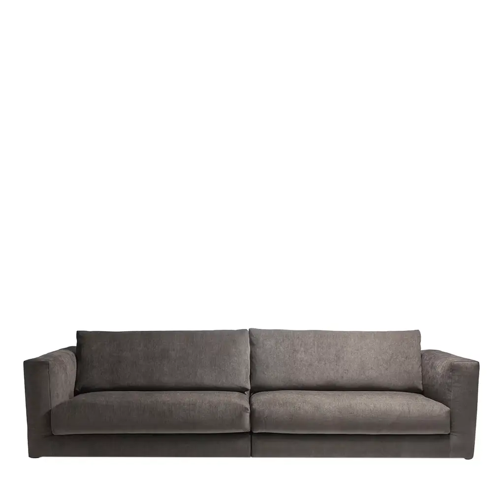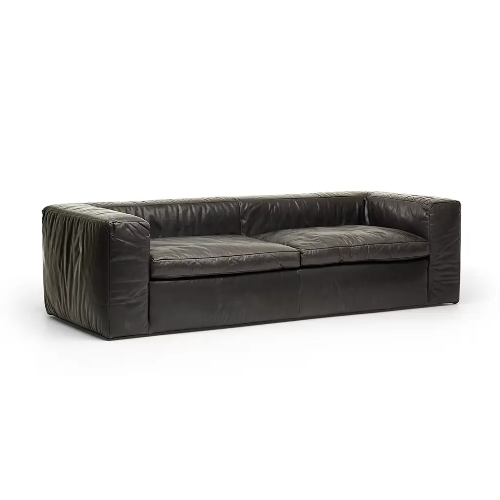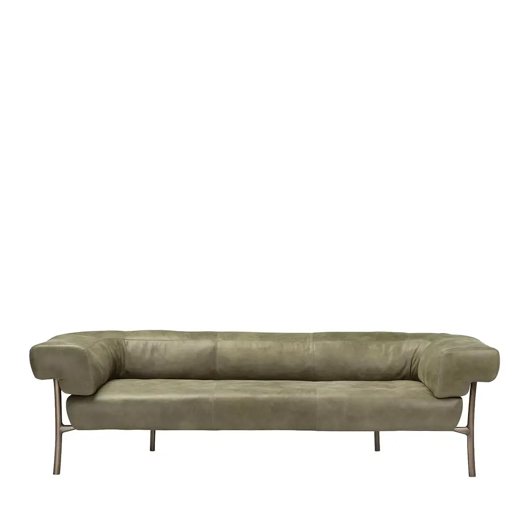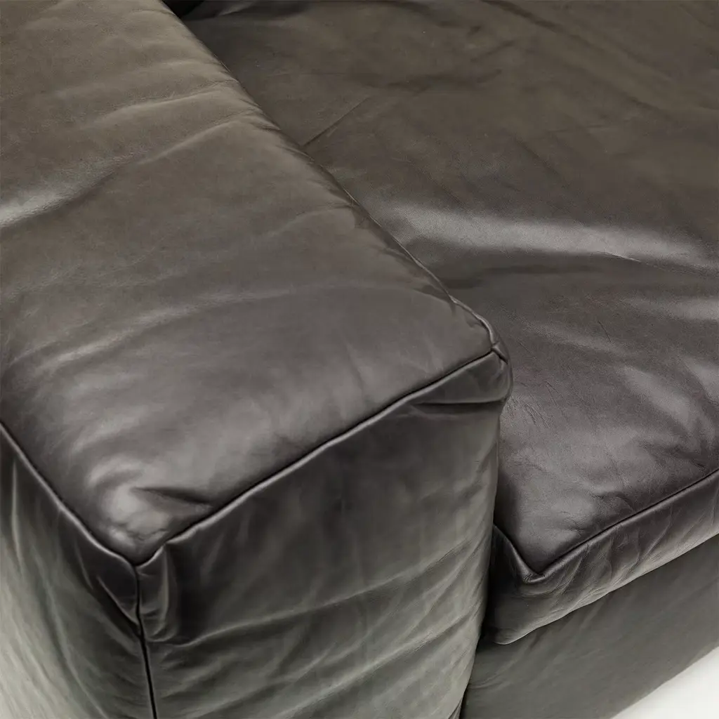 The essential silhouette of this sofa and its comfortable, plush cushions make it a sumptuous piece that will enliven the look of an industrial-style or contemporary living room. This superb piece was designed by Alberto Colzani in 2013. Its structure in poplar, birch, and poplar plywood supports a polyurethane core with dacron lining and elastic straps combined with down filling to create the generous softness of the seat cushions. The leather upholstery gives elegance and comfort to the piece. Fabric upholstery is also available - please ask the concierge for details.