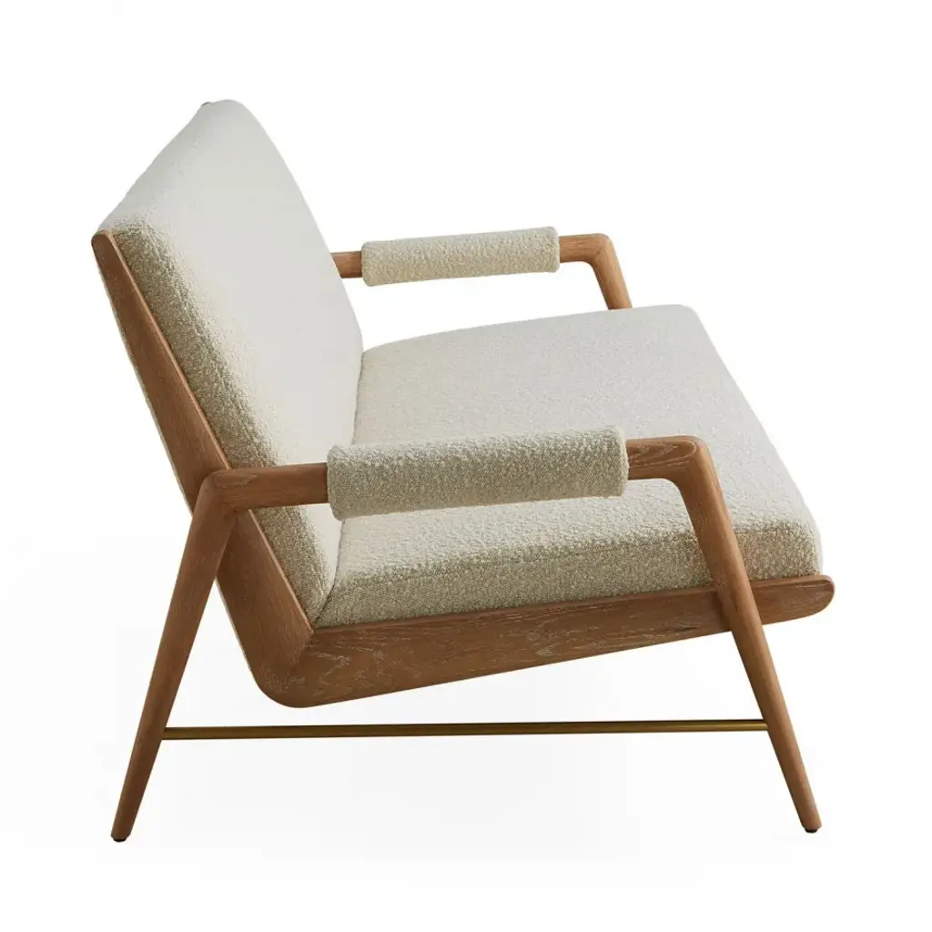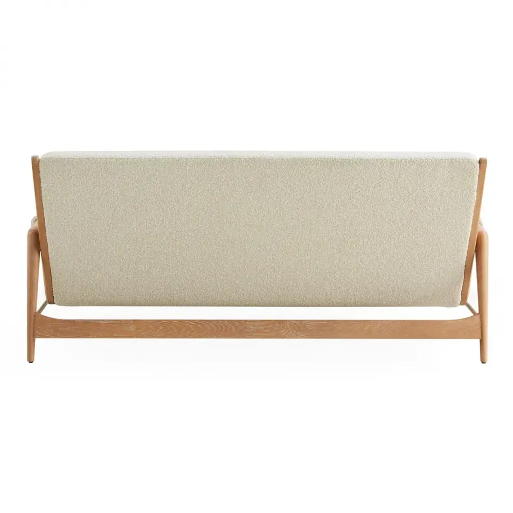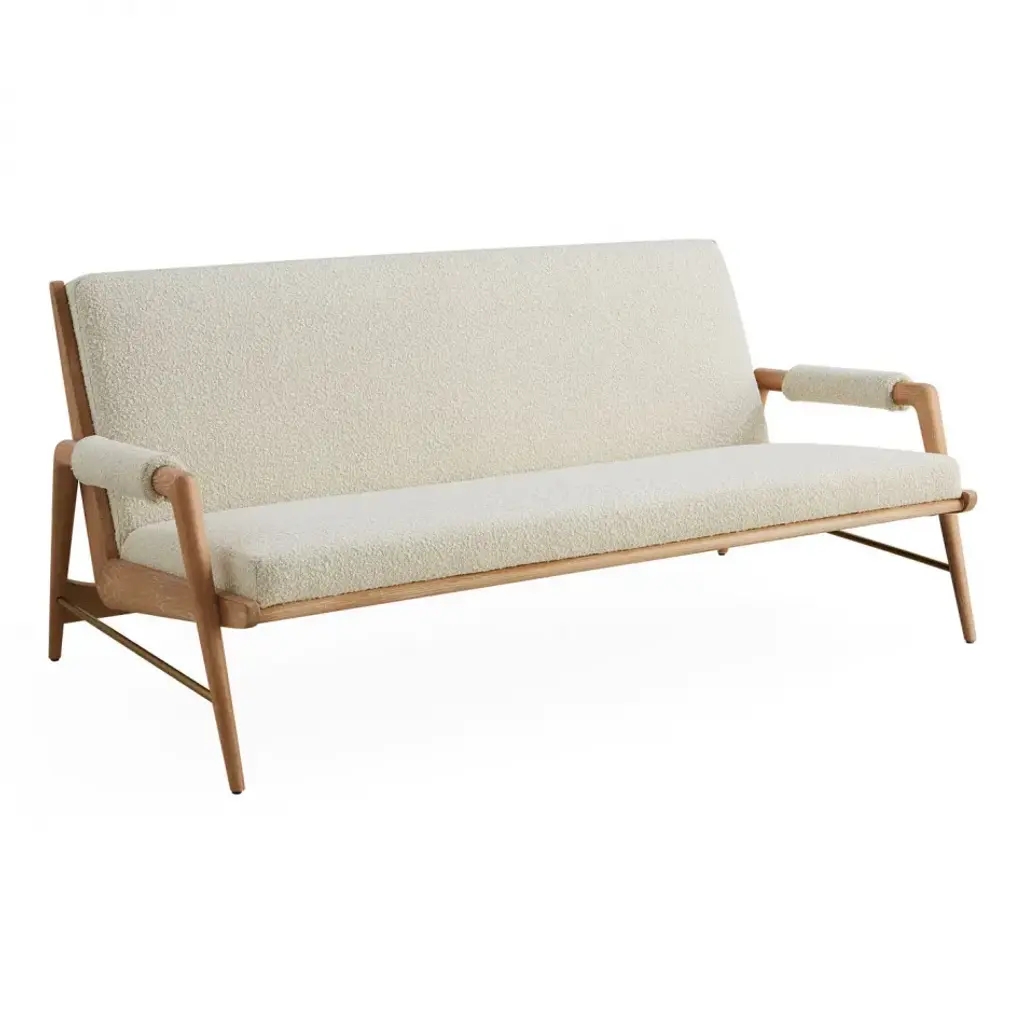 Surfside Lounge.Featuring a solid wire-brushed oak frame fitted with an antique brass stretcher, our Big Sur Apartment Sofa is a little midcentury and a lot modern. Perfectly pitched and with a natural satin finish that accentuates the wood grain, Big Sur’s thick and comfy back, seat, and armrest cushions are clad in ultra-cozy Teddy upholstery (faux shearling made of cut pile bouclé yarns). Chic and soulful in your Brooklyn Brownstone study, and a breezy beaut in your West Coast abode. Sized to suit all spaces.Our collection of artisan crafted solid oak furniture is as mighty as its source. Wire-brushing exposes the natural wood grain and our liming technique accentuates each solid piece of wood's unique pattern. A nod to French 50s cool, a dash of Milanese moxie, and a whisper of Scandinavian soulfulness.