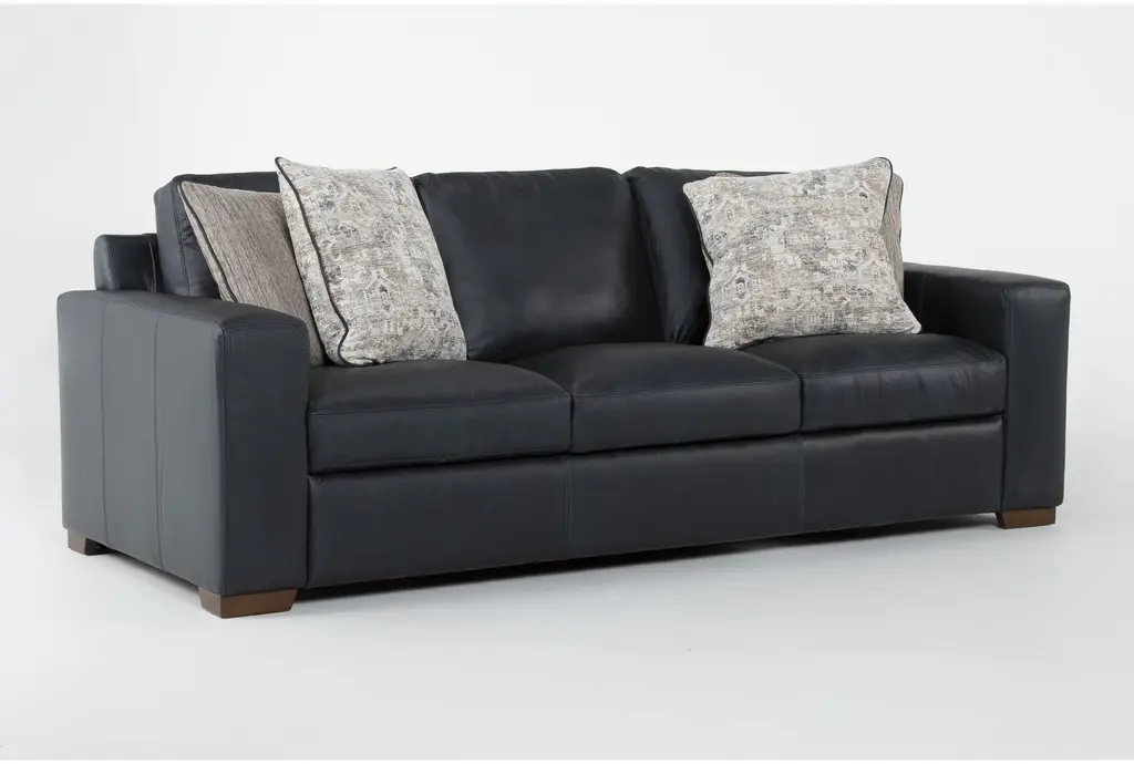 The Big Sur Navy Blue Leather 99" Sofa is a perfect addition to your living room, offering both comfort and style. Its casual design and soft comfort level make it an inviting place to relax. The rich volcano blue leather upholstery adds a sophisticated touch to any space.