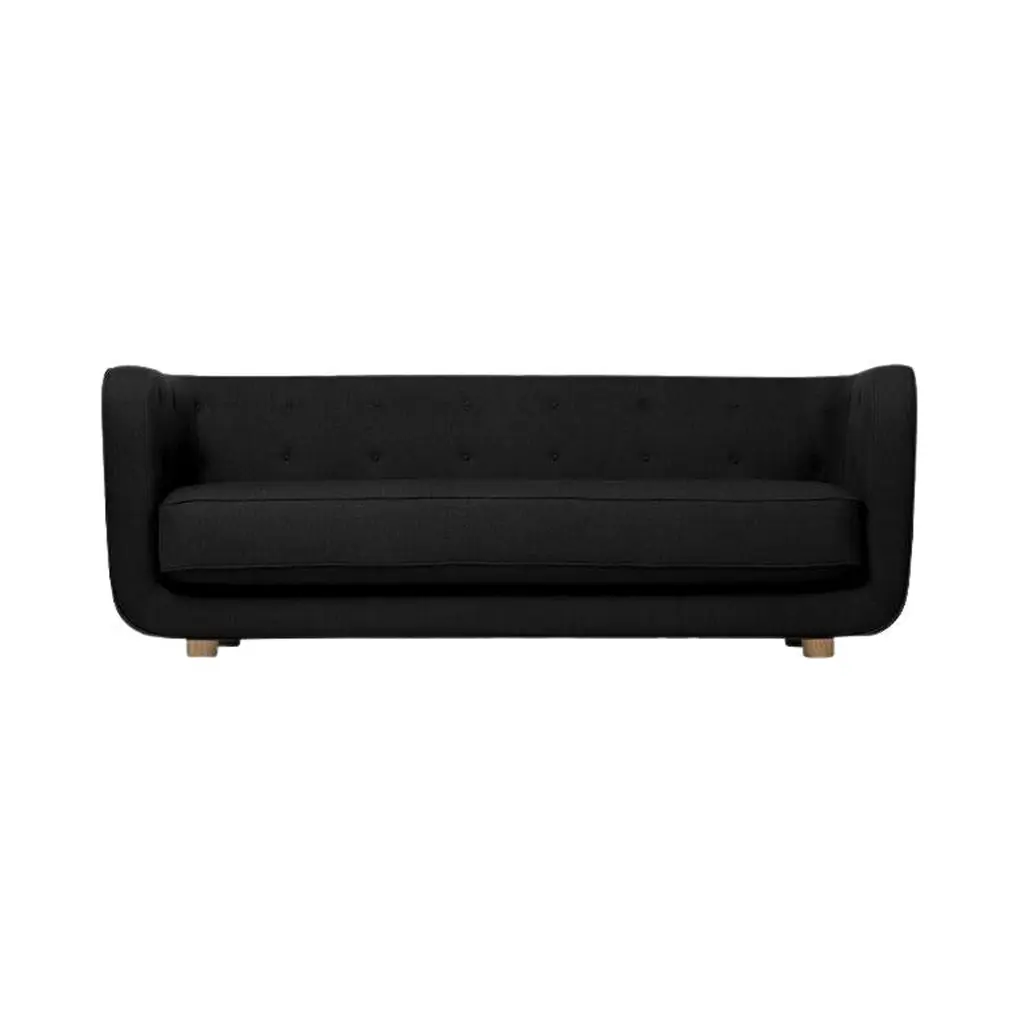 Black and natural oak Raf Simons Vidar 3 Vilhelm sofa by Lassen.Dimensions: W 217 x D 88 x H 80 cm. Materials: Textile, Oak.Vilhelm is a beautiful padded three-seater sofa designed by Flemming Lassen in 1935. A sofa must be able to function in several ways. It should invite calm and contemplation. Create a private space you can hide in and at the same time invite to life and play. It must be able to withstand sitting on the backrest or on the armrests and then it must be able to stand in the middle of the room if you want to.In addition to being aesthetically beautiful and harmonious, the design makes absolute sense in relation to these parameters.By Lassen is a Danish design brand focused on iconic designs created by Mogens and Flemming Lassen, founded by Lassens’ relatives in 2008. Brothers Mogens (1901-1987) and Flemming (1902-1984) Lassen are known as two of Denmark’s greatest architects and designers. Both were renowned pioneers of Danish functionalism and modernist architecture, honoured with numerous prestigious medals and awards. Headed by Mogens Lassen’s grandson Søren Lassen, By Lassen carries on the brothers’ design philosophy by manufacturing their iconic designs as well as products by other designers that complement the Lassen’s functionalist style. The company’s mission is to continue the tradition of timelessness, functionality and quality, and to introduce the Lassen’s design heritage to new generations.