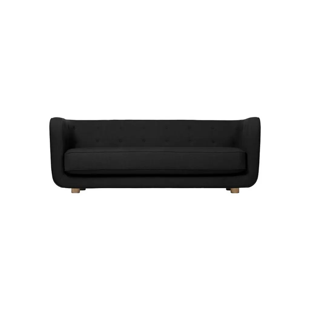Black and smoked oak raf simons vidar 3 vilhelm sofa by Lassen.Dimensions: W 217 x D 88 x H 80 cm Materials: Textile, oak.Vilhelm is a beautiful padded three-seater sofa designed by Flemming Lassen in 1935. A sofa must be able to function in several ways. It should invite calm and contemplation. Create a private space you can hide in and at the same time invite to life and play. It must be able to withstand sitting on the backrest or on the armrests and then it must be able to stand in the middle of the room if you want to.In addition to being aesthetically beautiful and harmonious, the design makes absolute sense in relation to these parameters.By Lassen is a Danish design brand focused on iconic designs created by Mogens and Flemming Lassen, founded by Lassens’ relatives in 2008. Brothers Mogens (1901-1987) and Flemming (1902-1984) Lassen are known as two of Denmark’s greatest architects and designers. Both were renowned pioneers of Danish functionalism and modernist architecture, honoured with numerous prestigious medals and awards. Headed by Mogens Lassen’s grandson Søren Lassen, By Lassen carries on the brothers’ design philosophy by manufacturing their iconic designs as well as products by other designers that complement the Lassen’s functionalist style. The company’s mission is to continue the tradition of timelessness, functionality and quality, and to introduce the Lassen’s design heritage to new generations.
