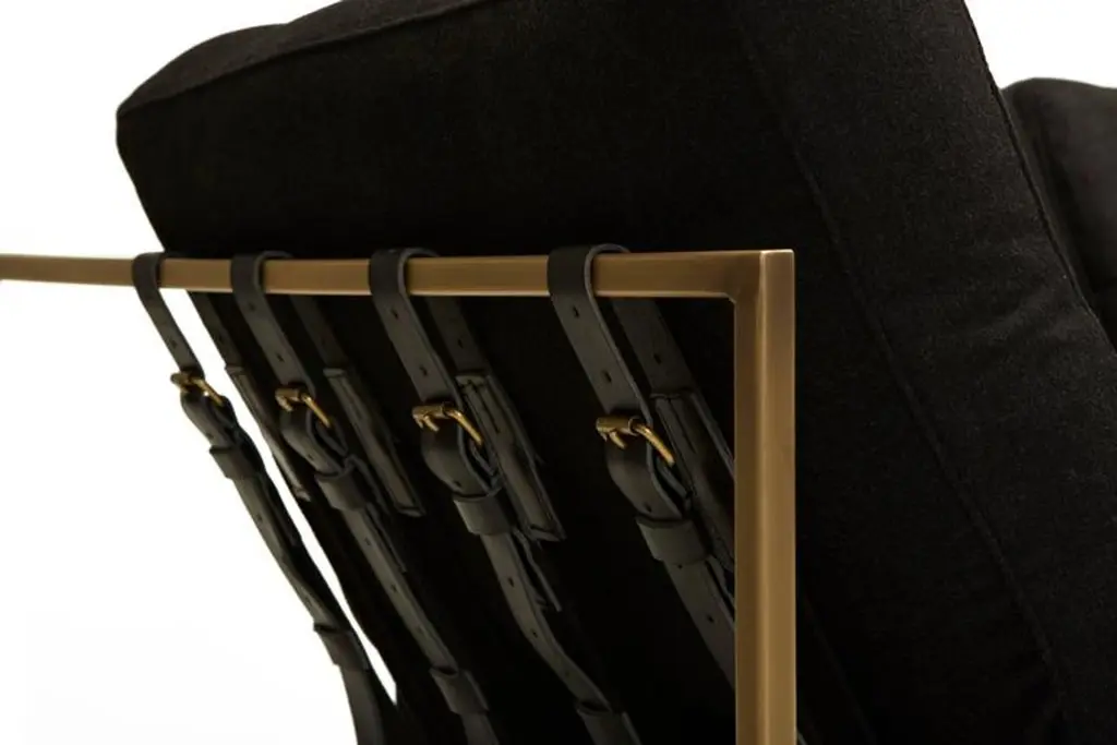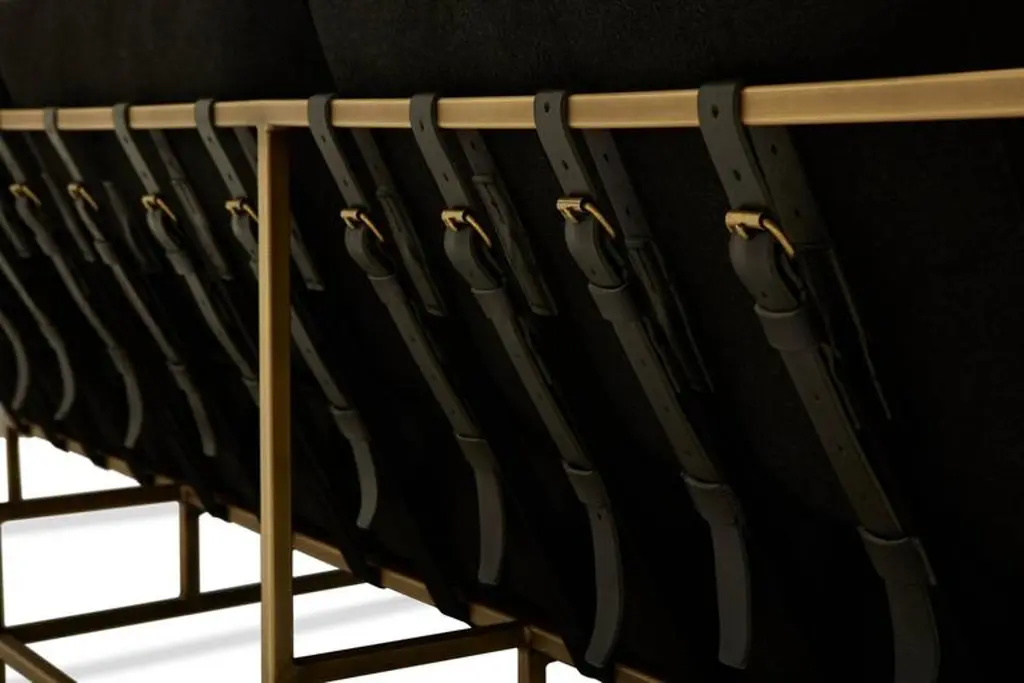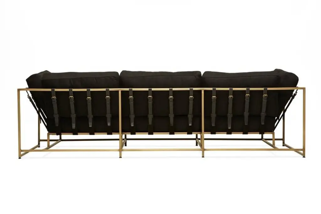 The Inheritance Sofa by Stephen Kenn is as comfortable as it is unique. The design features an exposed construction composed of three elements - a steel frame, plush upholstery, and supportive belts. The deep seating area is perfect for a relaxing lounge experience. This sofa comes with removable cushion covers to allow for easy cleaning should the need arise. Every Stephen Kenn piece is made to order through our Los Angeles studio in partnership with a number of small businesses and fabricators in the LA area. With this highly customizable sofa you can select from a wide range of finishes and materials to complement your home and lifestyle - please message us to see our Customization Guide with all available options.This version of our Inheritance Sofa is upholstered in black wool. The foam seat cushions have been wrapped in polyfiber for added softness and comfort. Sitting atop an antique brass plated frame, the sofa is strapped with support belts featuring black cotton webbing, black leather, and antique brass buckles.
