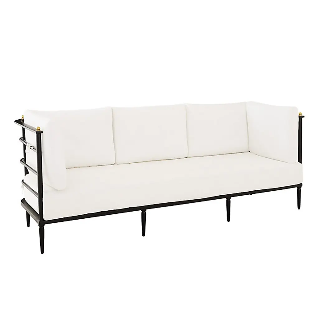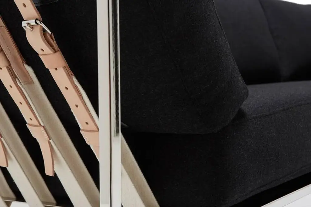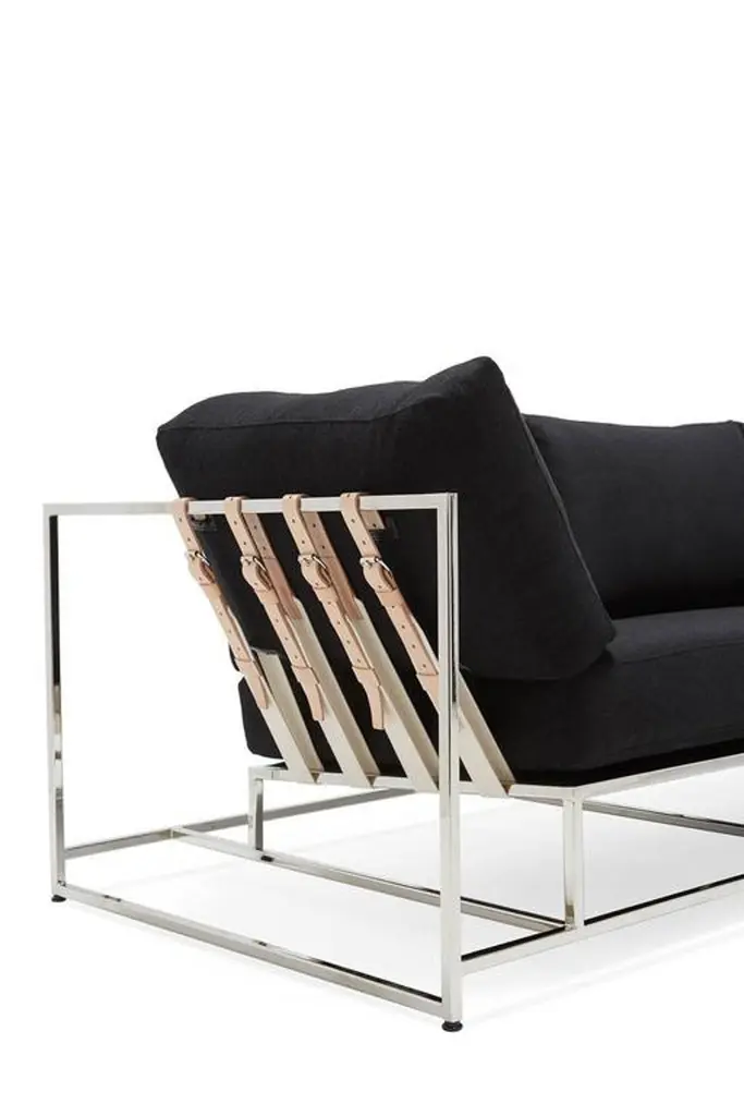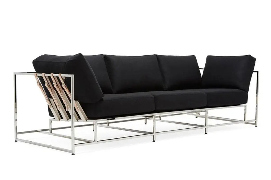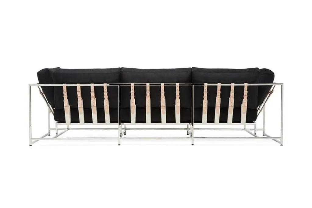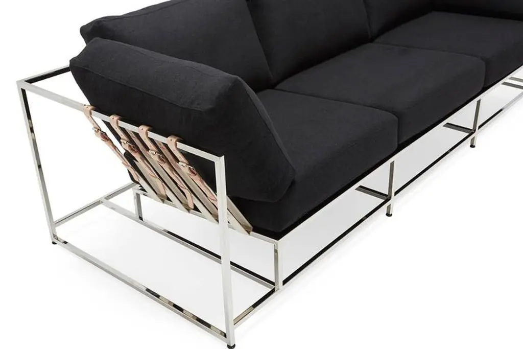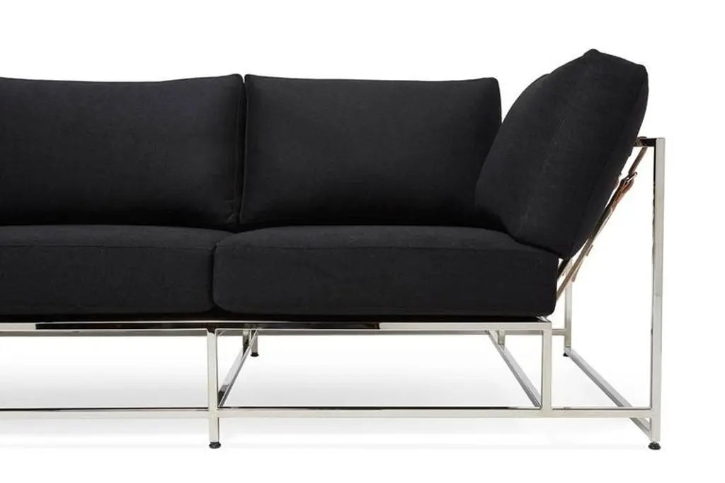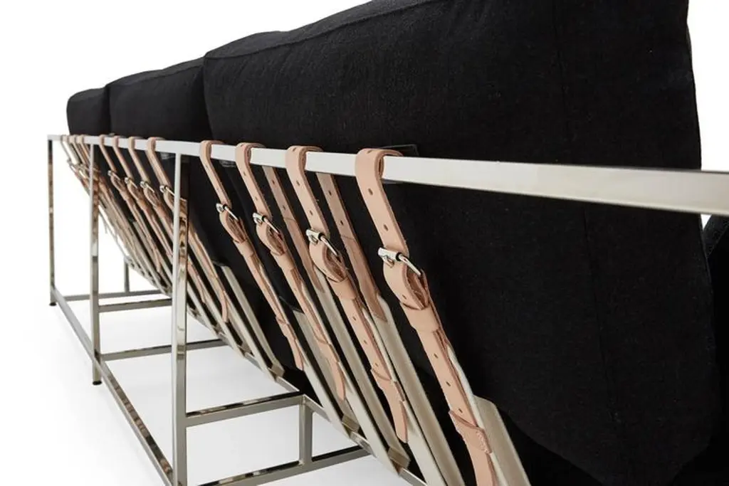 The Inheritance Sofa by Stephen Kenn is as comfortable as it is unique. The design features an exposed construction composed of three elements - a steel frame, plush upholstery, and supportive belts. The deep seating area is perfect for a relaxing lounge experience. This sofa comes with removable cushion covers to allow for easy cleaning should the need arise. Every Stephen Kenn piece is made to order through our Los Angeles studio in partnership with a number of small businesses and fabricators in the LA area. With this highly customizable sofa you can select from a wide range of finishes and materials to complement your home and lifestyle - please message us to see our Customization Guide with all available options.This version of our Inheritance Sofa is upholstered in black wool. The foam seat cushions have been wrapped in polyfiber for added softness and comfort. Sitting atop a polished nickel plated frame, the sofa is strapped with support belts featuring natural cotton webbing, natural veg tan leather, and polished nickel buckles.