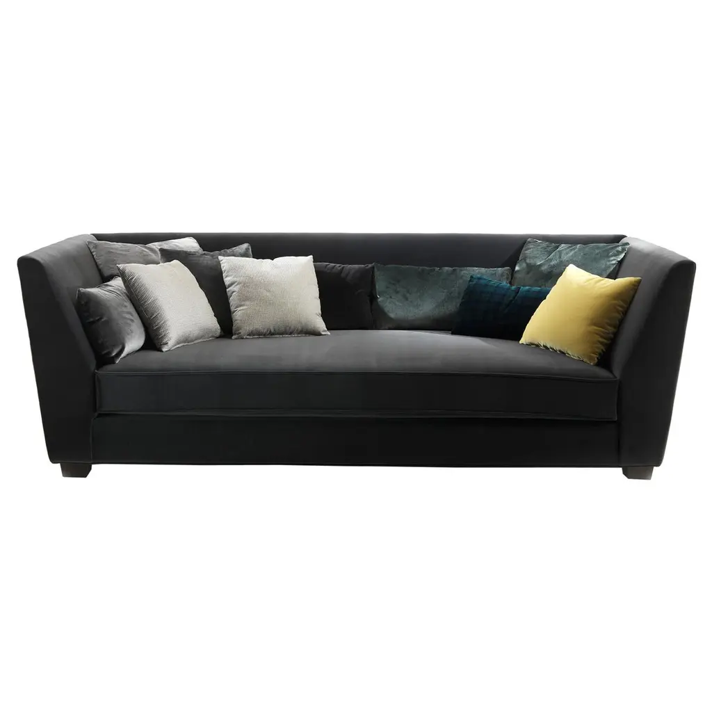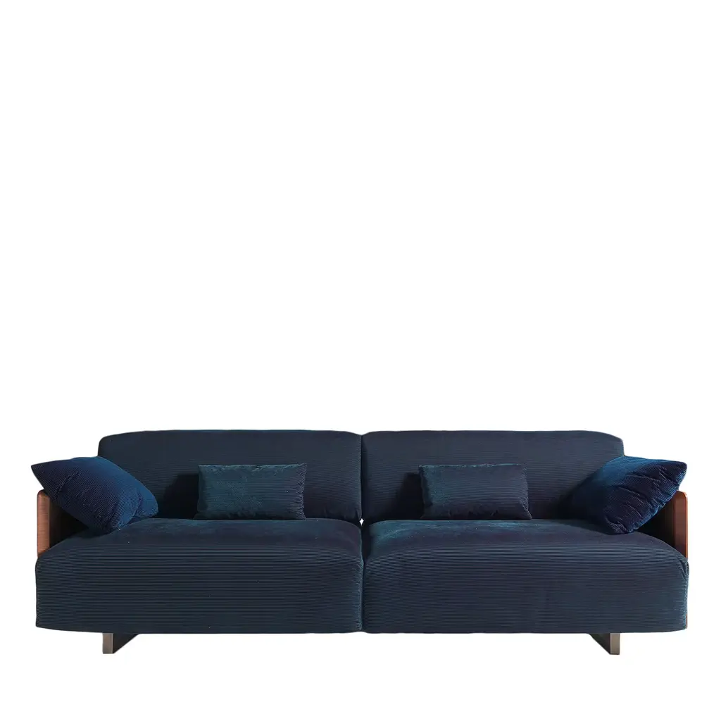 Timelessly sophisticated, this sofa is made of multilayered poplar plywood with a front metal frame and elastic straps and features a padded backrest and a softly padded seat filled with double-density polyurethane foam, covered with a memory foam sheet and an acrylic layer. Upholstered with a velvety blue fabric, it features a plywood base on lacquered feet and is decorated in an exquisite pattern, also available in leather upholstery, ask the Concierge for details. Cushions are not included.