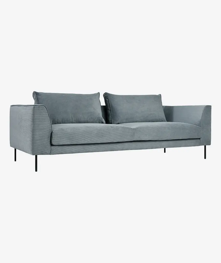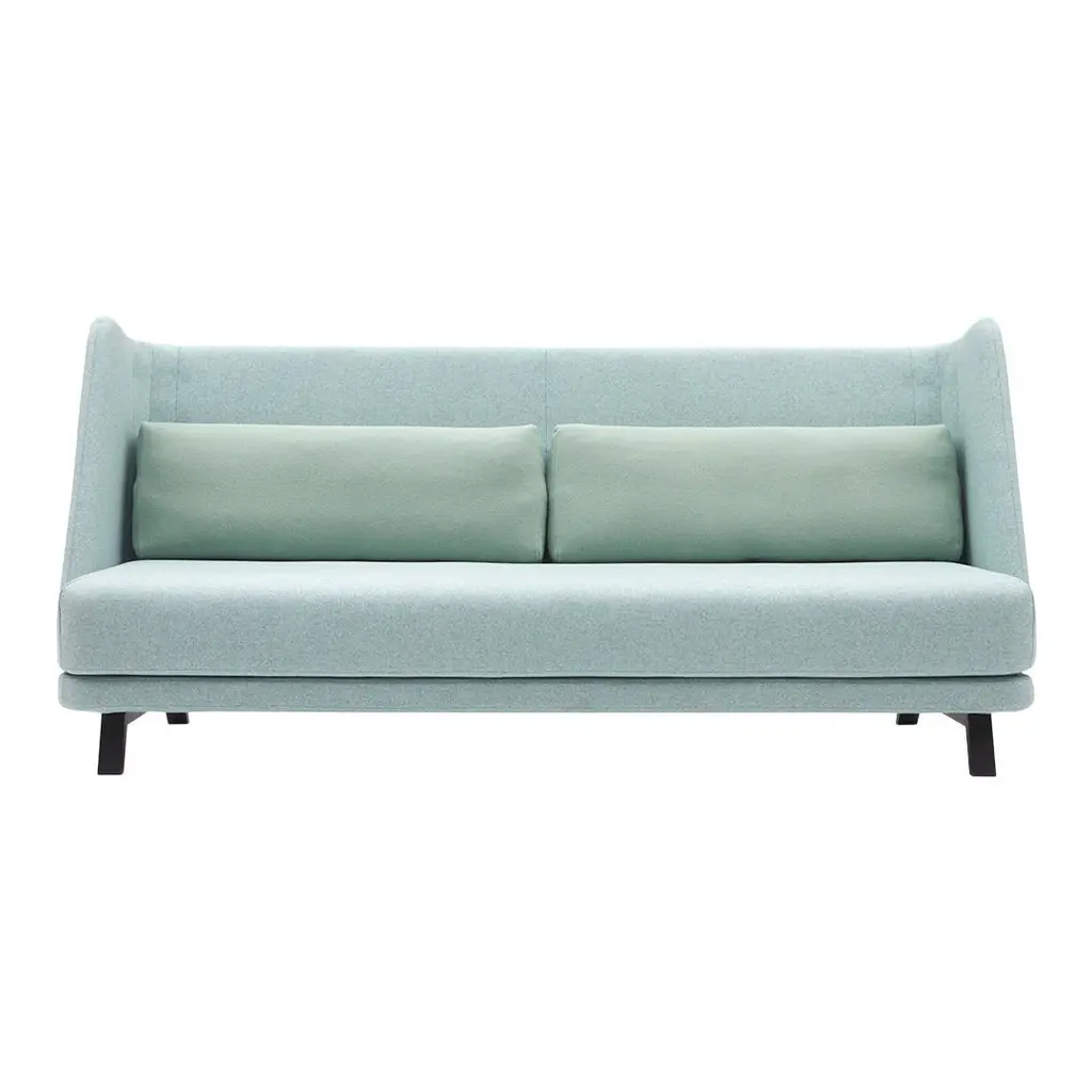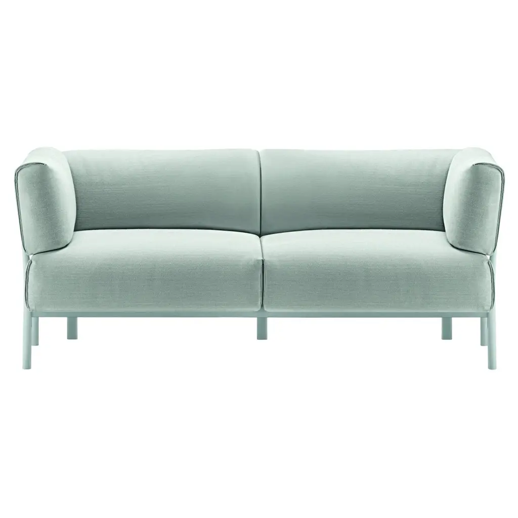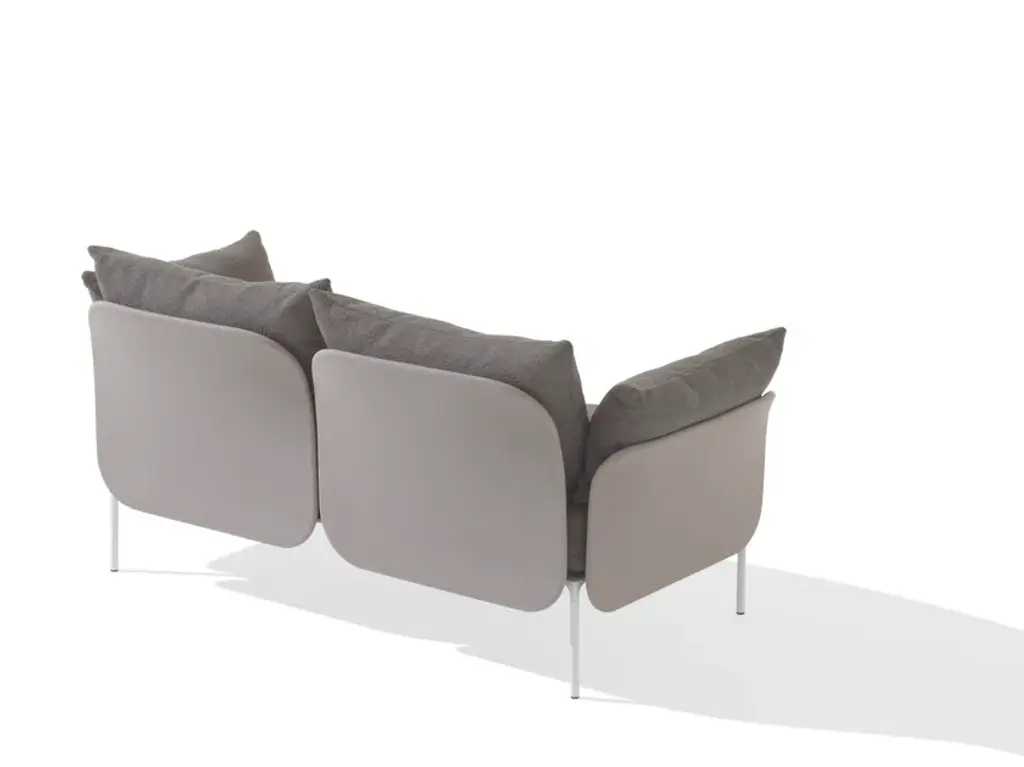 Bloom is a two seater sofa with aluminium frame and fabric seat. The collection includes poufs, sofas, small sofas and different armchairs, designed to create a seating system.