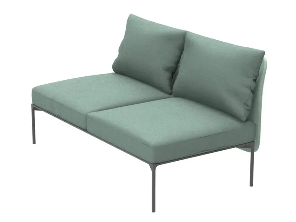 Bloom is a three seater sofa without armrest, characterized by the aluminium frame and covered fabric. The collection includes poufs, sofas, small sofas and different armchairs, designed to create a seating system.