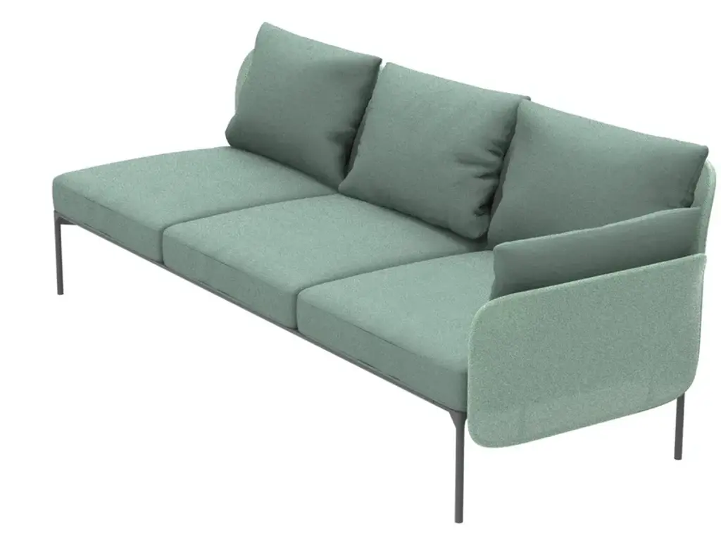 Bloom is a three seater sofa with aluminium frame, and covered in fabric. The collection includes poufs, sofas, small sofas and different armchairs, designed to create a seating system.