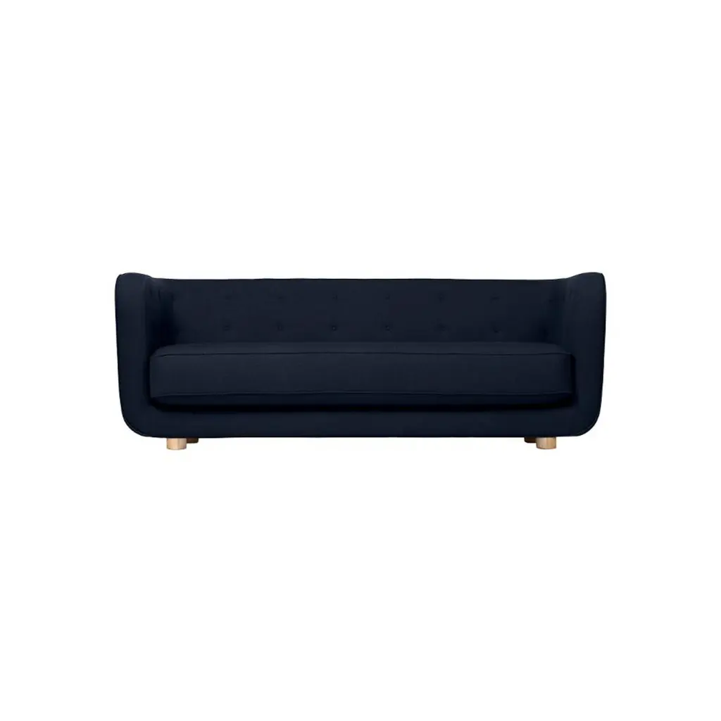 Blue and natural oak Raf Simons Vidar 3 Vilhelm sofa by LassenDimensions: W 217 x D 88 x H 80 cm Materials: textile, oak.Vilhelm is a beautiful padded 3-seater sofa designed by Flemming Lassen in 1935. A sofa must be able to function in several ways. It should invite calm and contemplation. Create a private space you can hide in and at the same time invite to life and play. It must be able to withstand sitting on the backrest or on the armrests and then it must be able to stand in the middle of the room if you want to.In addition to being aesthetically beautiful and harmonious, the design makes absolute sense in relation to these parameters.By Lassen is a Danish design brand focused on iconic designs created by Mogens and Flemming Lassen, founded by Lassens’ relatives in 2008. Brothers Mogens (1901-1987) and Flemming (1902-1984) Lassen are known as two of Denmark’s greatest architects and designers. Both were renowned pioneers of Danish functionalism and modernist architecture, honoured with numerous prestigious medals and awards. Headed by Mogens Lassen’s grandson Søren Lassen, By Lassen carries on the brothers’ design philosophy by manufacturing their iconic designs as well as products by other designers that complement the Lassen’s functionalist style. The company’s mission is to continue the tradition of timelessness, functionality and quality, and to introduce the Lassen’s design heritage to new generations.