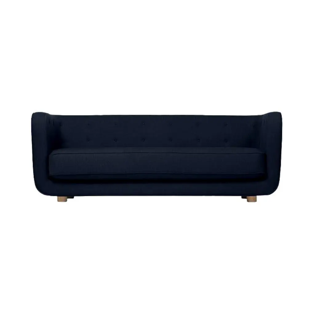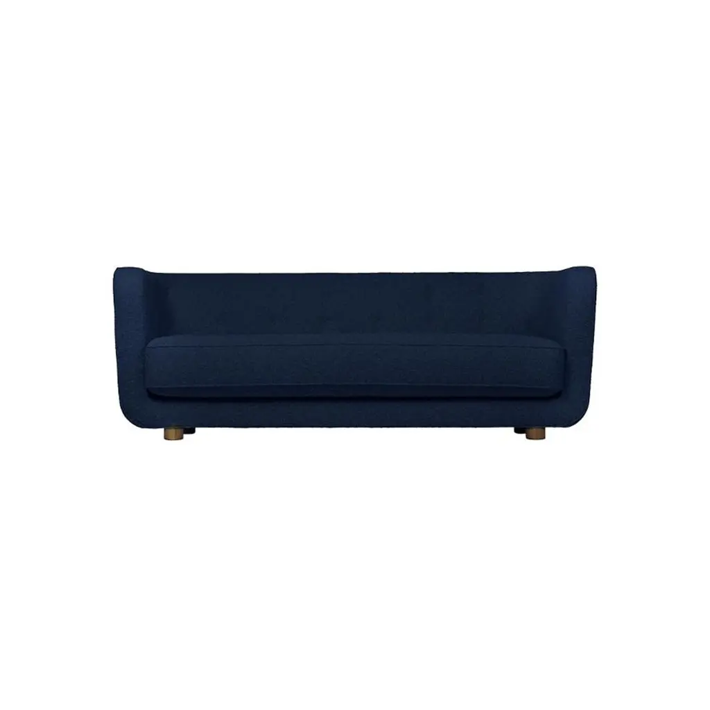 Blue and smoked oak Hallingdal Vilhelm sofa by Lassen.Dimensions: W 217 x D 88 x H 80 cm.Materials: textile, oak.Vilhelm is a beautiful padded 3-seater sofa designed by Flemming Lassen in 1935. A sofa must be able to function in several ways. It should invite calm and contemplation. Create a private space you can hide in and at the same time invite to life and play. It must be able to withstand sitting on the backrest or on the armrests and then it must be able to stand in the middle of the room if you want to.In addition to being aesthetically beautiful and harmonious, the design makes absolute sense in relation to these parameters.By Lassen is a Danish design brand focused on iconic designs created by Mogens and Flemming Lassen, founded by Lassens’ relatives in 2008. Brothers Mogens (1901-1987) and Flemming (1902-1984) Lassen are known as two of Denmark’s greatest architects and designers. Both were renowned pioneers of Danish functionalism and modernist architecture, honoured with numerous prestigious medals and awards. Headed by Mogens Lassen’s grandson Søren Lassen, By Lassen carries on the brothers’ design philosophy by manufacturing their iconic designs as well as products by other designers that complement the Lassen’s functionalist style. The company’s mission is to continue the tradition of timelessness, functionality and quality, and to introduce the Lassen’s design heritage to new generations.