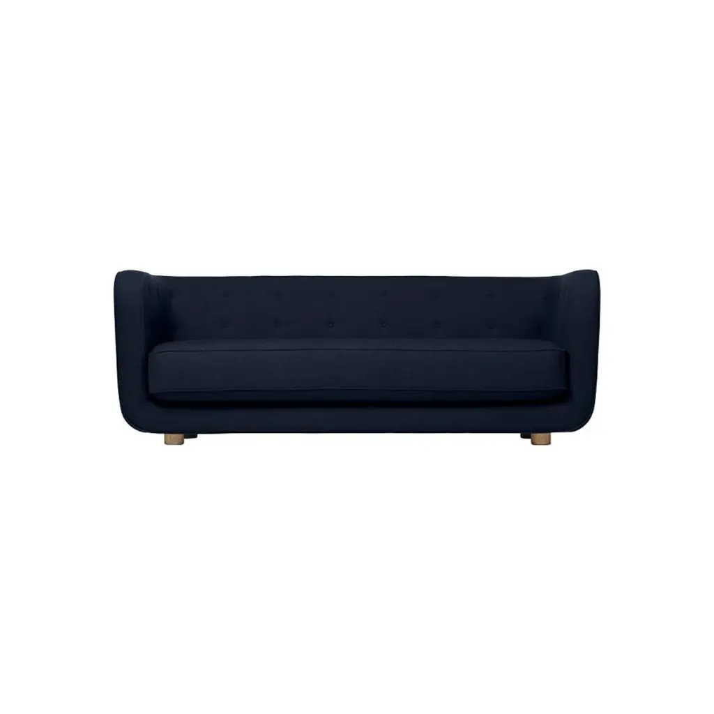 Blue and smoked oak Raf Simons Vidar 3 Vilhelm sofa by Lassen.Dimensions: W 217 x D 88 x H 80 cm. Materials: Textile, Oak.Vilhelm is a beautiful padded three-seater sofa designed by Flemming Lassen in 1935. A sofa must be able to function in several ways. It should invite calm and contemplation. Create a private space you can hide in and at the same time invite to life and play. It must be able to withstand sitting on the backrest or on the armrests and then it must be able to stand in the middle of the room if you want to.In addition to being aesthetically beautiful and harmonious, the design makes absolute sense in relation to these parameters.By Lassen is a Danish design brand focused on iconic designs created by Mogens and Flemming Lassen, founded by Lassens’ relatives in 2008. Brothers Mogens (1901-1987) and Flemming (1902-1984) Lassen are known as two of Denmark’s greatest architects and designers. Both were renowned pioneers of Danish functionalism and modernist architecture, honoured with numerous prestigious medals and awards. Headed by Mogens Lassen’s grandson Søren Lassen, By Lassen carries on the brothers’ design philosophy by manufacturing their iconic designs as well as products by other designers that complement the Lassen’s functionalist style. The company’s mission is to continue the tradition of timelessness, functionality and quality, and to introduce the Lassen’s design heritage to new generations.