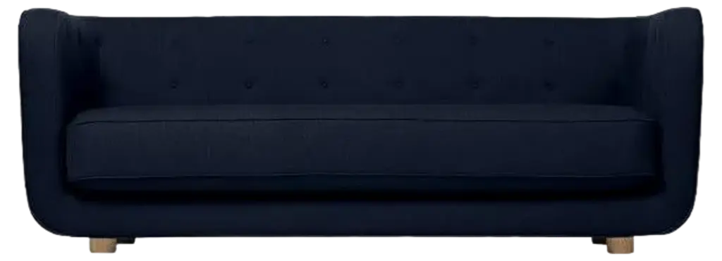 Blue and smoked oak sahco zero Vilhelm sofa by LassenDimensions: W 217 x D 88 x H 80 cm Materials: textile, oak.Vilhelm is a beautiful padded 3-seater sofa designed by Flemming Lassen in 1935. A sofa must be able to function in several ways. It should invite calm and contemplation. Create a private space you can hide in and at the same time invite to life and play. It must be able to withstand sitting on the backrest or on the armrests and then it must be able to stand in the middle of the room if you want to.In addition to being aesthetically beautiful and harmonious, the design makes absolute sense in relation to these parameters.By Lassen is a Danish design brand focused on iconic designs created by Mogens and Flemming Lassen, founded by Lassens’ relatives in 2008. Brothers Mogens (1901-1987) and Flemming (1902-1984) Lassen are known as two of Denmark’s greatest architects and designers. Both were renowned pioneers of Danish functionalism and modernist architecture, honoured with numerous prestigious medals and awards. Headed by Mogens Lassen’s grandson Søren Lassen, By Lassen carries on the brothers’ design philosophy by manufacturing their iconic designs as well as products by other designers that complement the Lassen’s functionalist style. The company’s mission is to continue the tradition of timelessness, functionality and quality, and to introduce the Lassen’s design heritage to new generations.