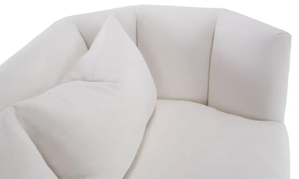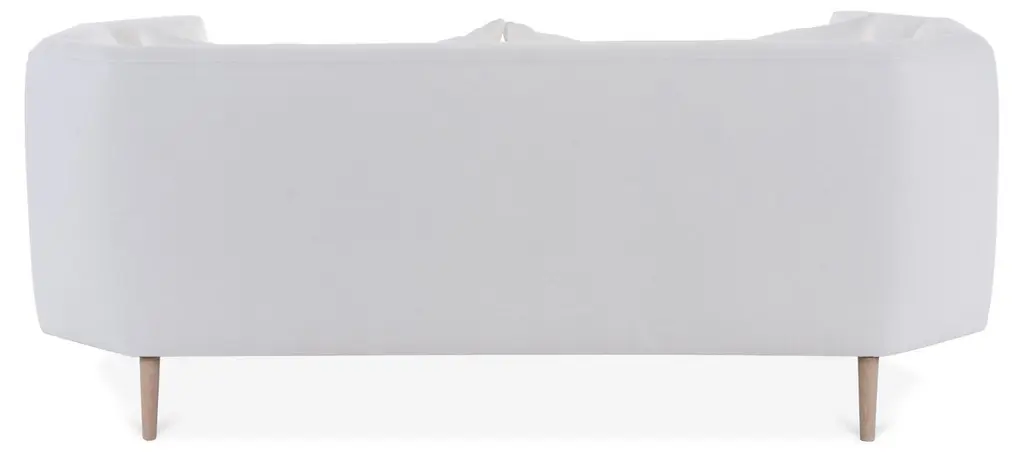 Designed by us and only available at One Kings Lane: Enveloping guests in style and comfort from all angles, this gemstone-inspired sofa boasts a modified tuxedo silhouette with perfectly proportioned shelter arms, clean white linen upholstery with interior channel tufting, and a generous feather-and-down fill. Set in an alder frame with contrasting cone legs. Made in the USA.