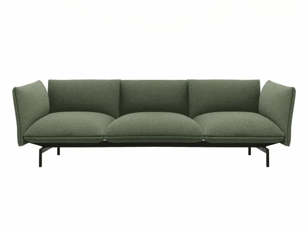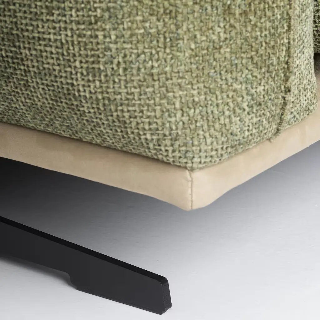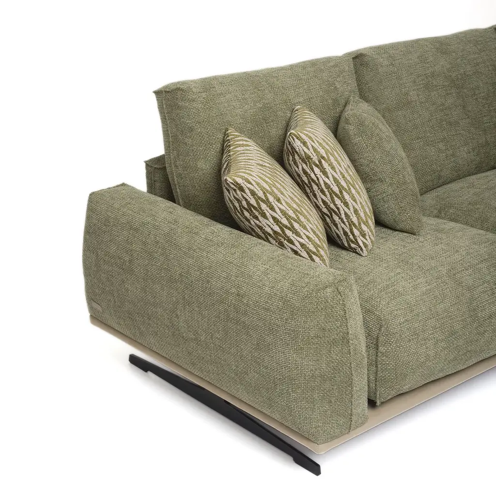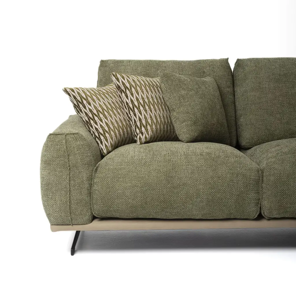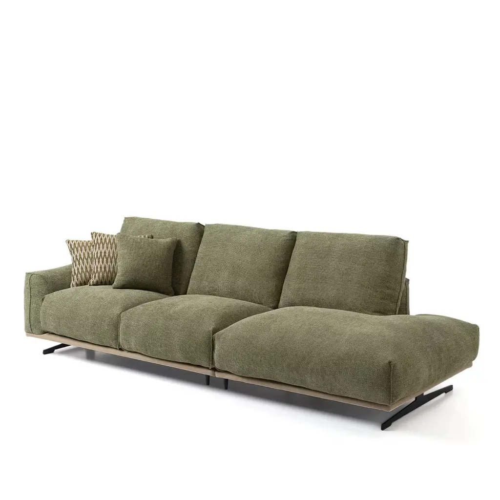 This sofa offers exceptional comfort with soft, inviting lines and flexible configurations. This three-seater combines a two-seater terminal with an armrest and the Free Side seat, featuring an open platform and hammerhead end for extra lounging space. The seats and armrests feature layered polyurethanes and certified goose down for a cozy feel. Eco-friendly, stain-resistant fabrics and customizable details are available. Decorative cushions not included.