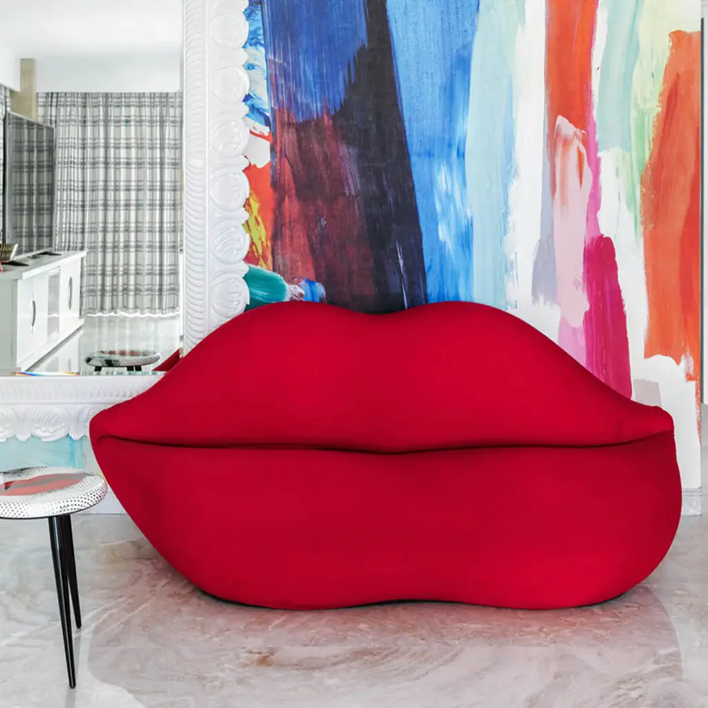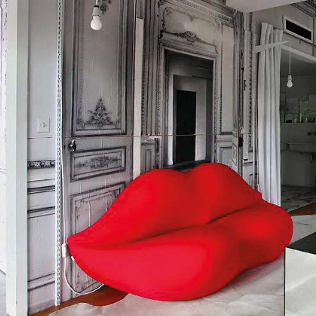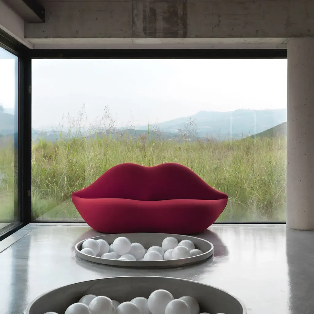 Couch in soft polyurethane upholstered with fabric. Getting their inspiration from the 1935 Portrait of Mae West by surreal artist Dalì, as well as from the hot red lips of Hollywood stars, Studio 65 architects achieved a masterpiece destined to become an object of cult. Pop DNA, a sensual and provocative soul, feminine and elegant aspect. Bocca is among the most sought-after, loved, and imitated products of home furniture.