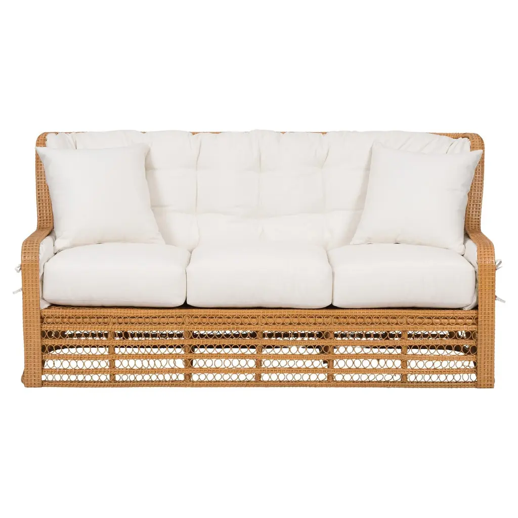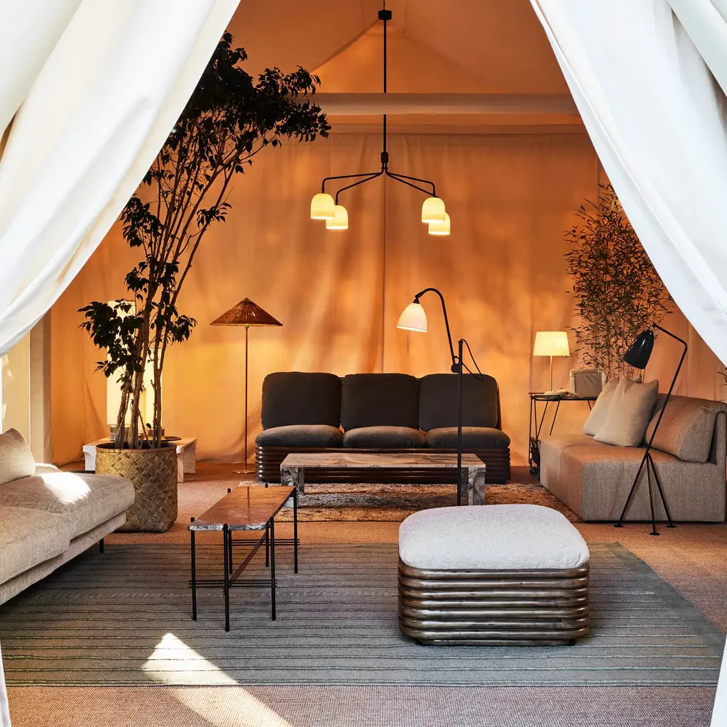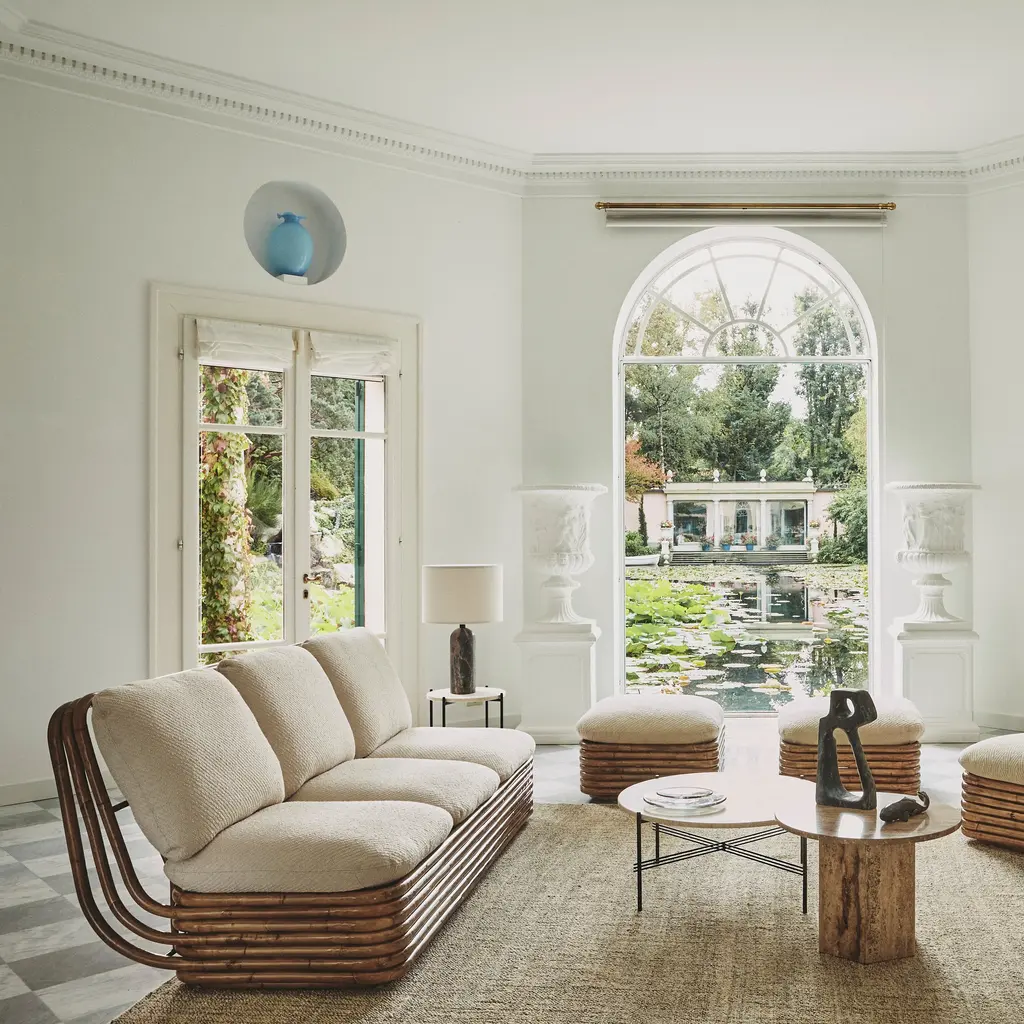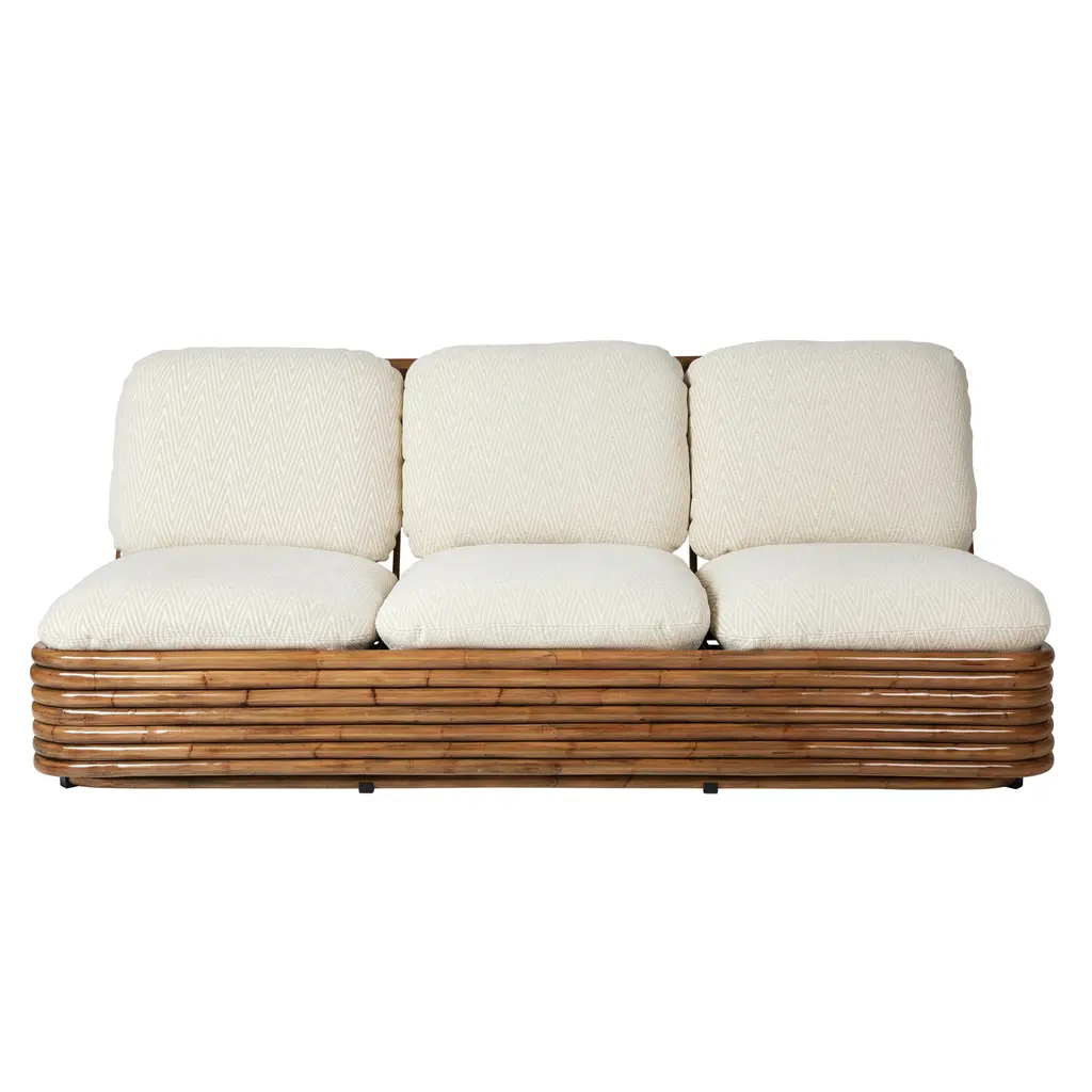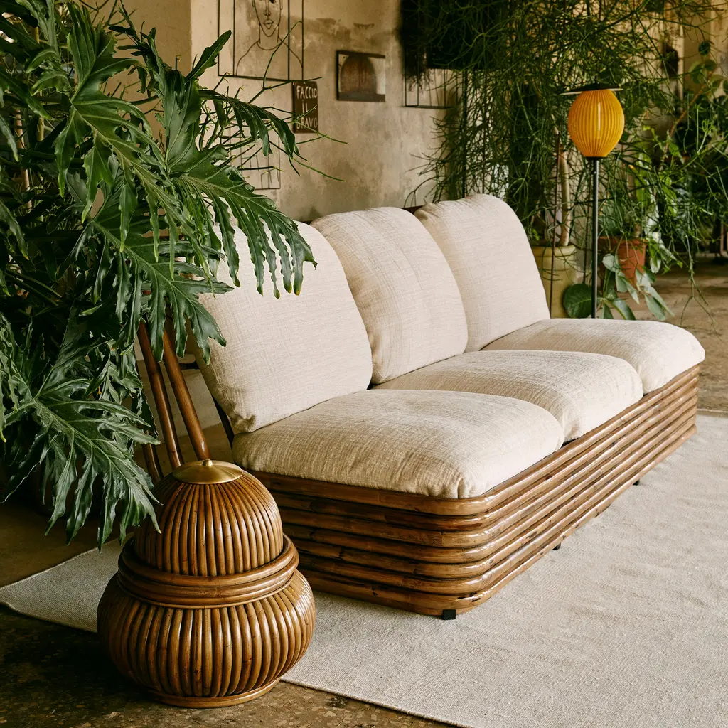 Layers of cane form the base of this 3-seater topped with lavishly plumped cushions by jet-set era designer Gabriella Crespi. Bohemian 72 reflects her interest in natural materials, fascination with stacked forms and tilt toward Eastern cultures. Originally conceived for her own indoor-outdoor "house of the sun" in Milan, Gubi recreates Crespi’s originals with a high level of craftsmanship — the rattan lengths first steamed and then bent by hand around a die, stained with antique color and finished with a gloss coating.