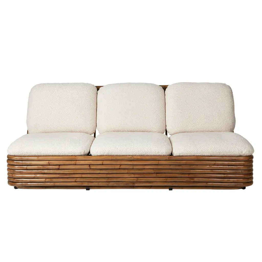 Layers of cane form the base of this 3-seater topped with lavishly plumped cushions by jet-set era designer Gabriella Crespi. Bohemian 72 reflects her interest in natural materials, fascination with stacked forms and tilt toward Eastern cultures. Originally conceived for her own indoor-outdoor "house of the sun" in Milan, Gubi recreates Crespi’s originals with a high level of craftsmanship — the rattan lengths first steamed and then bent by hand around a die, stained with antique color and finished with a gloss coating.