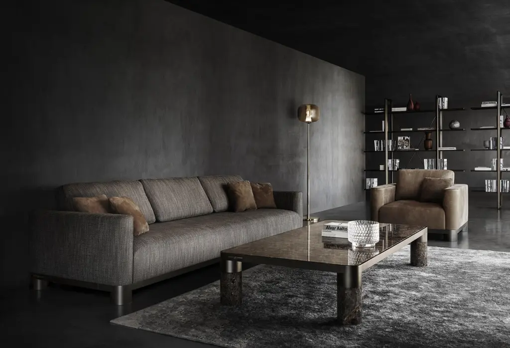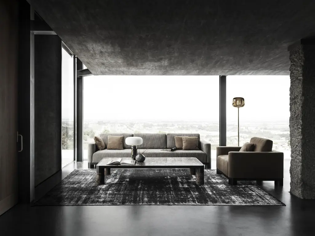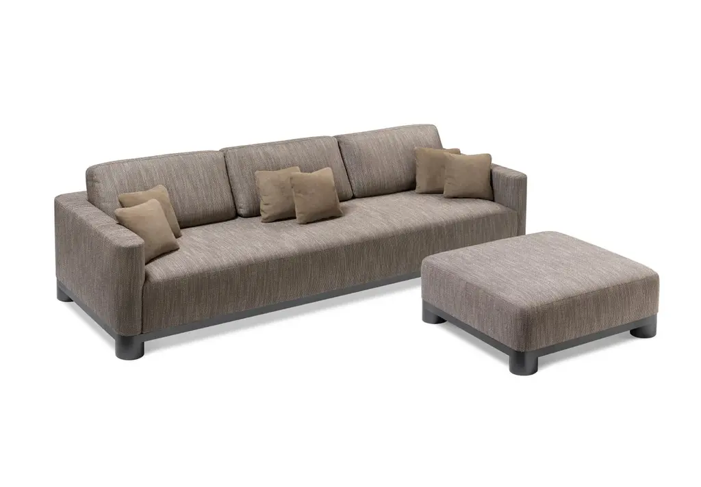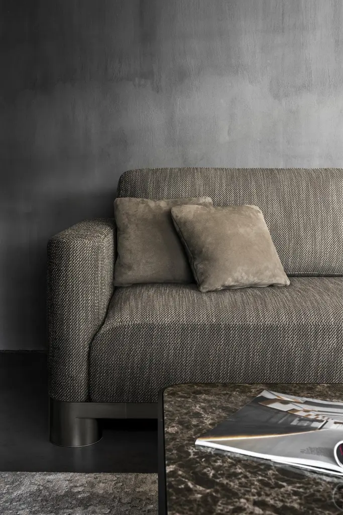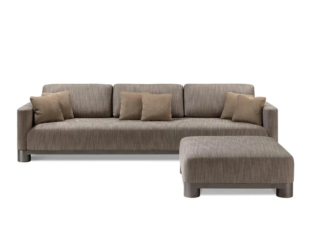 This family of products makes a bold statement with its generous cylindrical foot, connecting its structural perimeter while delimiting the objects that compose it. The distinctive metal rim that supports the seats, the tables, the cabinets, graphically encompasses the material with which they are made. This is beautifully portrayed in the tables, where the marble tabletop matches with the legs in turned marble, or with the armchairs featuring leather seats and legs of the same color. With the massive dimensions and the softness of the fittings, the materials are enhanced in their characteristics creating a sculptural effect and giving a distinct personality to each element of the collection.Structure: Die casted aluminum on the angular elements and extruded aluminum for the supporting structure on the perimeter. Internal structure in wood with metal supporting frame. Cushions: Back cushions in high grammage wadding with internal rubber insert. Seat cushions in polyurethane rubber of different densities. Covers: Back covers are completely removable for both fabric and leather versions. Base: The sofa, armchair and ottoman are based on the Bold family of castings. The Bold castings are made of Italian aluminum, die casted inhouse at Ghidini1961. Polished manually, and lacquered with a transparent finish to guarantee a long lasting durability.Additional Information:Materials: Brass, fabric Legs Finish: Black goldDimensions: W 270 x D 100 x H 79 cmAvailable in other upholstery options: Nabuk leather, nappa leather, natural leather, velvetAvailable in other finish option: Brown burnished brass, polished brass, satin brass, light burnished brass, dark burnished brassAvailable in 2-seater sofa version