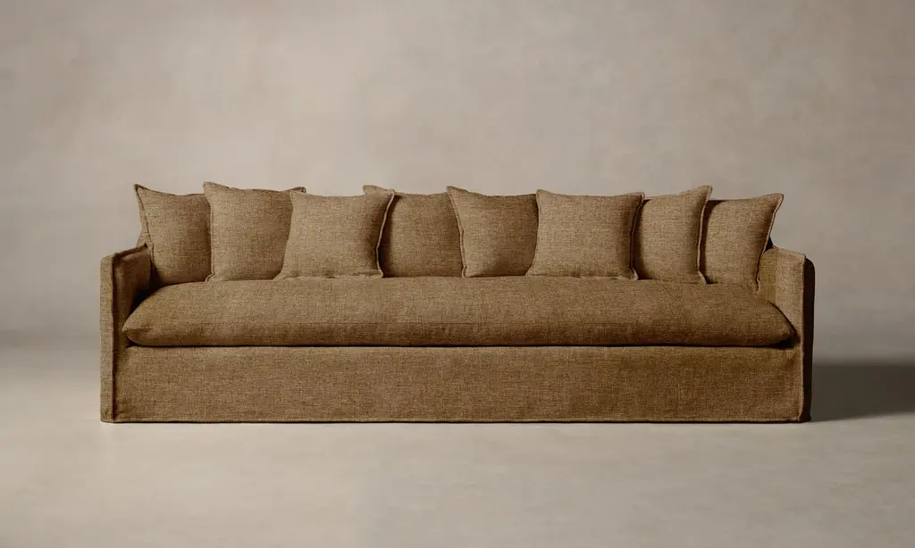 Elegant in its simplicity, this three-seat sofa will make a sophisticated statement in both a modern or contemporary interior. Marked by clean and minimalist lines, it rests on short, cylindrical-shaped feet in black satin-finished brass, and features a softly padded classic silhouette entirely upholstered with a shaded brown fabric that will elegantly match the Bold Coffee Table in Emperador marble. Please refer to the Concierge for customization options.