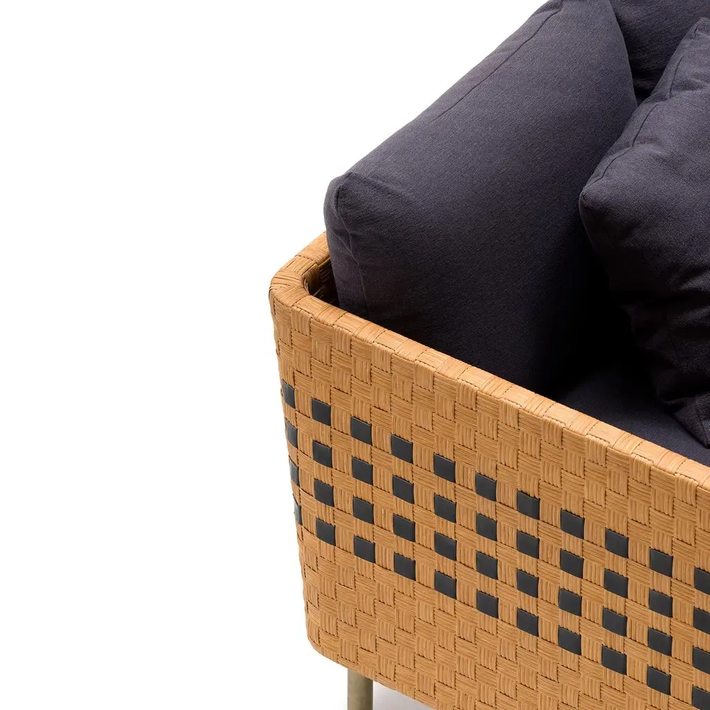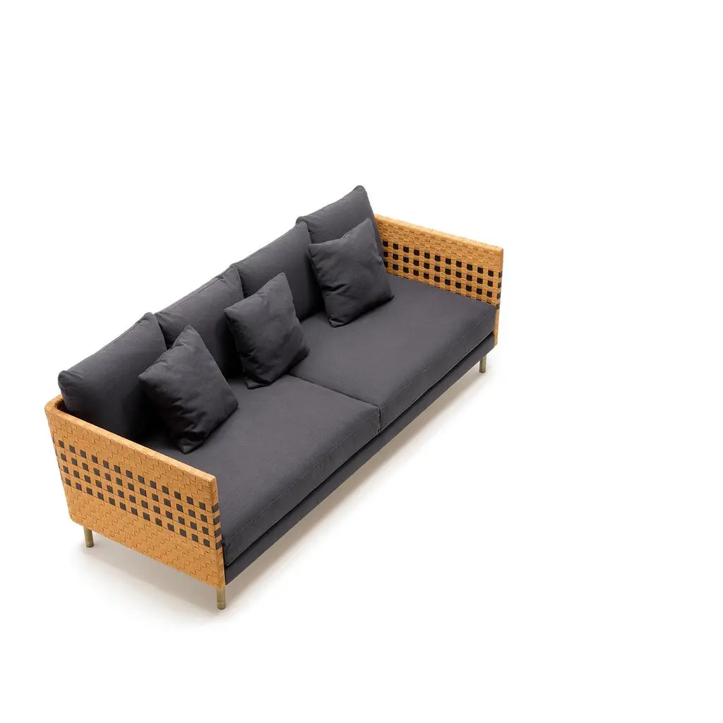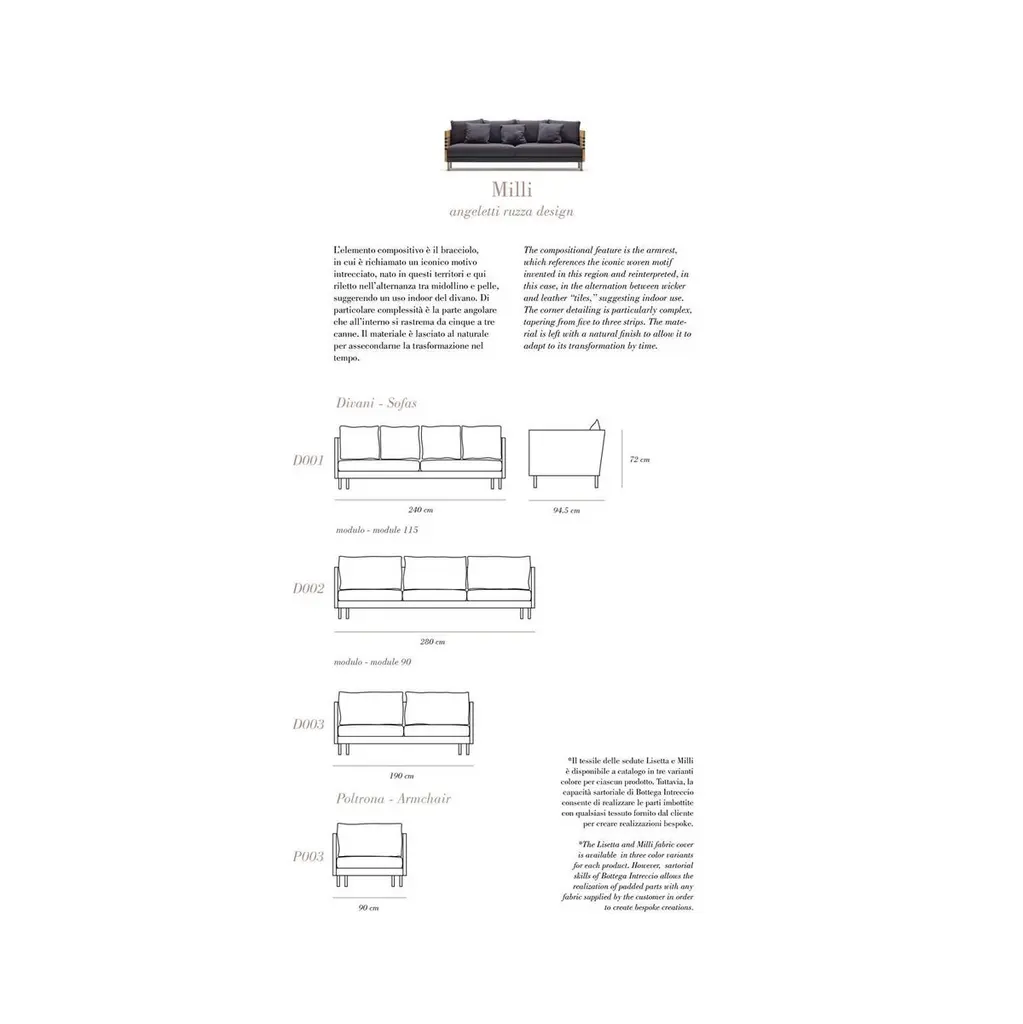 Milli 240 two extra seats sofa - Module 115The compositional feature is the armrest, which references the iconic woven motif invented in this region and reinterpreted, in this case, in the alternation between wicker and leather “tiles,” suggesting indoor use. The corner detailing is particularly complex, tapering from five to three strips. The material is left with a natural finish to allow it to adapt to its transformation by time.“We have reduced the form to a minimum to reveal the know-how and intelligence of hands that move on their own, weaving melodies of sounds in the air. We have tried to express the essence of waving through the absence of form. In pursuit of authenticity, substance and beauty.”Use and maintenanceAll the items are made with raw materials and are guaranteed for interiors.If it is necessary, they can also be installed outdoors as long as they aresufficiently protected from atmospheric agents and not directly exposedto the sunlight or water, in spaces like verandas, gazebos,arcades or protected spaces.The raw materials used for weavings could be not extremelyhomogeneous due to different physical properties and the items couldhave dimensions a bit different from descriptions listed in this document.The colors could change for the same reasons. Those features arethe demonstration of authenticity of each product that is unique andhandcrafted in Italy by Mogliano’s masters.Woven wicker is extremely resistant over the years, if it is stored in a dryplace and without excessive temperature changes, and it could also change color or nuances due to its sunlight exposure based-on nature. The weavingby the craftsman is performed with soft and wet material, an the material dries naturally with the passage of time losing its elasticity.For this reason, avoid excessive pressures, overloads of heavy weights or impacts. The bases or wooden parts are entirely in solid wood: with the aging they could change in size and present natural micro-cracks. Avoid direct and long exposure to the sun, completely avoid wetting.About the lamp usage, in normal condition the items don’t require special maintenance.TechnicalsAbout item technical details and bulbs specifications, pleaserefer to the technical data sheets.CleaningUse a soft cloth for cleaning. Don’t use any chemicals, acids, scourers or steel brushes.The base in natural wood must be cleaned and dusted using a soft cloth,even slightly damp. Immediately wipe again with a soft, dry cloth.For lamps cleaning, unplug the appliance from electric power before to proceed.Never immerse the device in water. Wicker is a natural material, so cleaning the wicker lampshade don’t get it wet nor use chemicals. Use compressed air to remove dust.