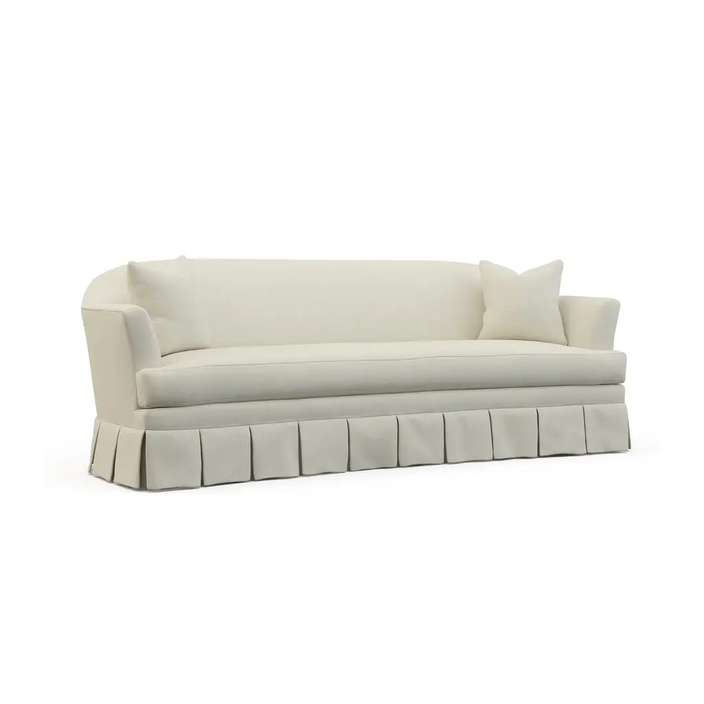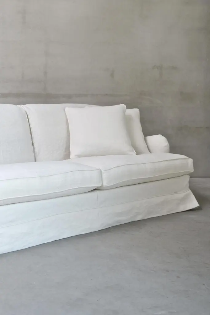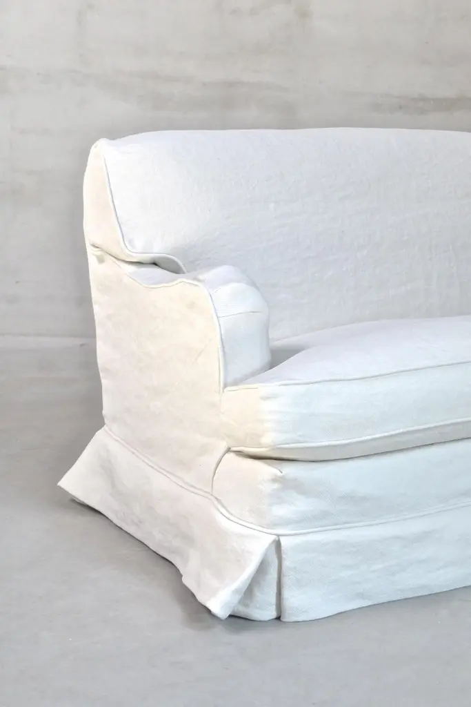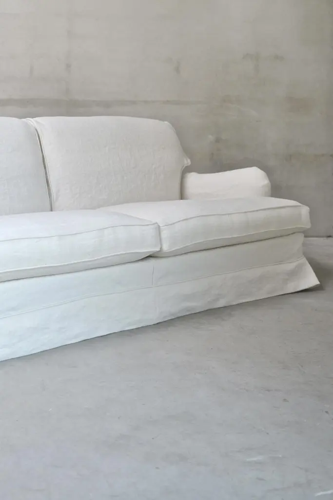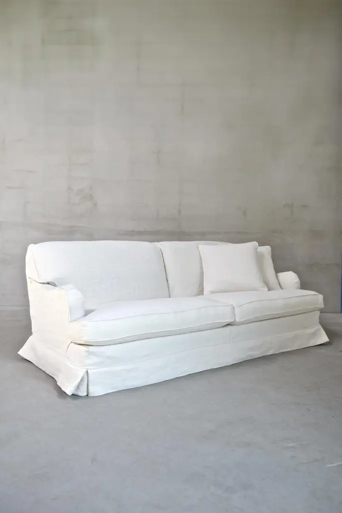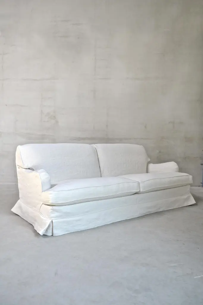The Boulbon Sofa by am designs combines relaxed elegance with practical versatility. Handmade in Belgium with a solid wooden frame, it features a durable construction and plush seat and back cushions for exceptional comfort. The fully removable slipcover offers a tailored yet casual look, enhanced by customizable stitching options. Available in a range of fabrics, colors, and sizes—with fabric included and cushions ordered separately—the sofa can be personalized to suit your space and style. Shown here in Dune Optical White fabric, the Boulbon Sofa adapts beautifully to both contemporary and classic interiors. A timeless, understated piece reflecting am designs’ commitment to quality craftsmanship and thoughtful design. Made to order.