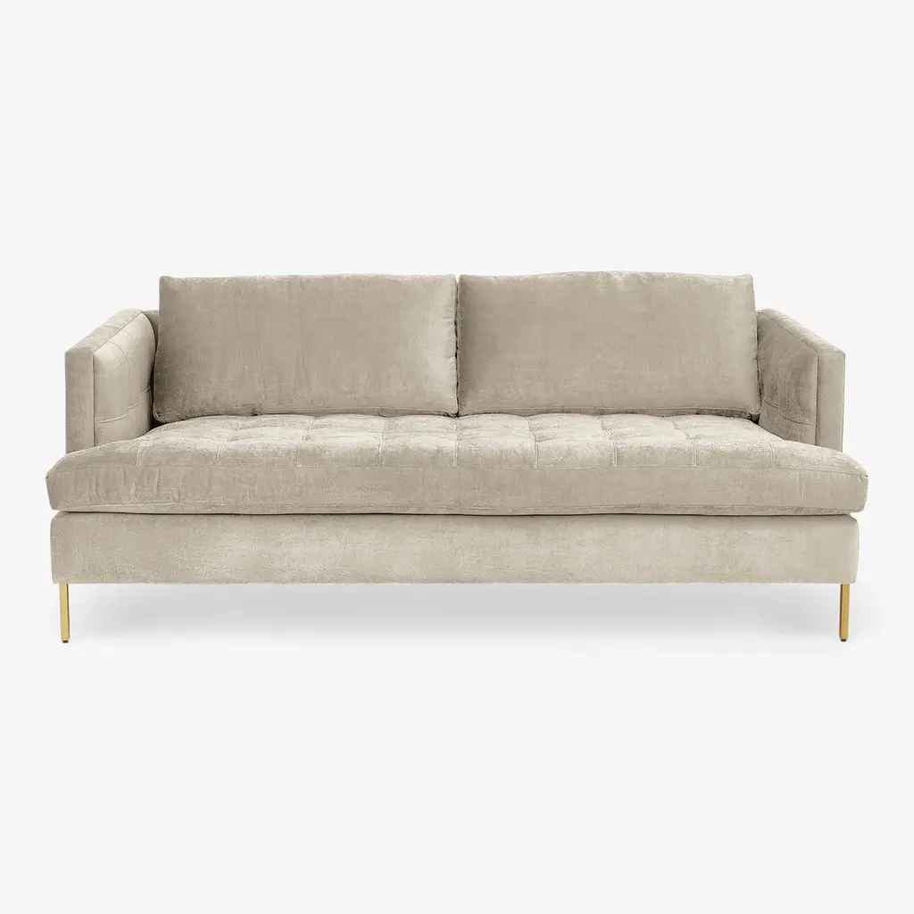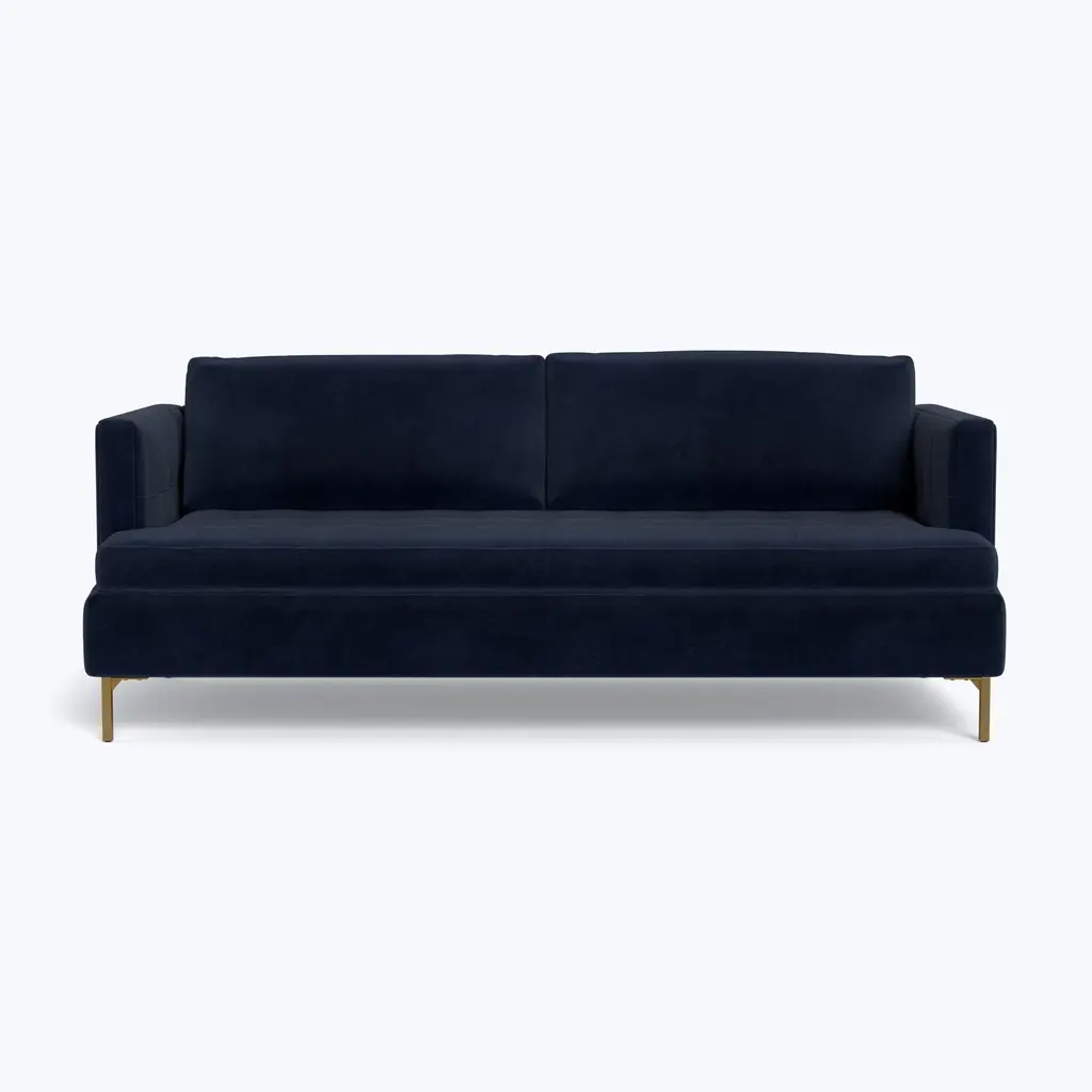 Exclusive to ABC Carpet & Home, the Boutique Apartment Sofa is the epitome of timeless grace combined with luxurious comfort. Designed to transform any space into a serene and sophisticated haven, its refined silhouette and brass legs serve as the perfect focal point, effortlessly elevating your home décor. Whether placed in a cozy apartment or a chic urban loft, this sofa offers a touch of understated elegance that enhances any living space. The Boutique Apartment Sofa’s striking design is accentuated by its biscuit-tufted bench seat, offering an indulgent seating experience. The unique reversible cushions provide a delightful twist, featuring biscuit tufts on one side and button-tufted detailing on the other. This dual design allows you to refresh your aesthetic with ease, adapting the look of your living space whenever desired. The combination of thoughtful design and ultimate comfort makes this sofa not only a visual centerpiece but also a functional one. To further elevate your living room, the Boutique collection offers a complementary chair and ottoman that beautifully pair with the 78-inch Apartment Sofa. Together, these pieces create a curated ensemble that brings both charm and relaxation to your home. Ideal for a serene modern retreat or a lively urban setting, the Boutique collection is designed with both comfort and style in mind. Each piece showcases artistic craftsmanship and inviting elegance, offering a space where relaxation and sophistication coexist. Hand-crafted from sustainably sourced wood, the Boutique Apartment Sofa adheres to ABC’s Goodwood Standards, reflecting a commitment to ethical and eco-friendly manufacturing practices. Made in the USA as part of the Cobble Hill Collection, this sofa represents quality craftsmanship and a dedication to sustainability. Its construction not only ensures durability but also aligns with values of environmental consciousness, making it a timeless and responsible addition to your home. Customization is key with the Boutique Apartment Sofa. With over 80 fabric options to choose from, including rich velvets, breezy linens, soft cottons, durable polyester blends, and high-performance fabrics, you can tailor the sofa to perfectly match your personal style. Each fabric is designed to withstand the demands of everyday life while maintaining an air of sophistication. Handcrafted to order, your Boutique Sofa will be delivered within 8-10 weeks, offering a bespoke touch of refined luxury and lasting comfort to your living space.