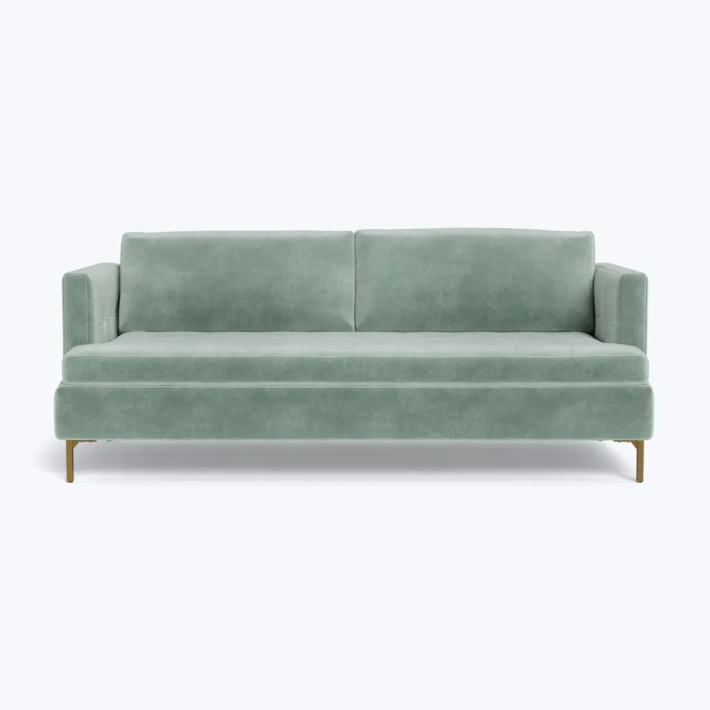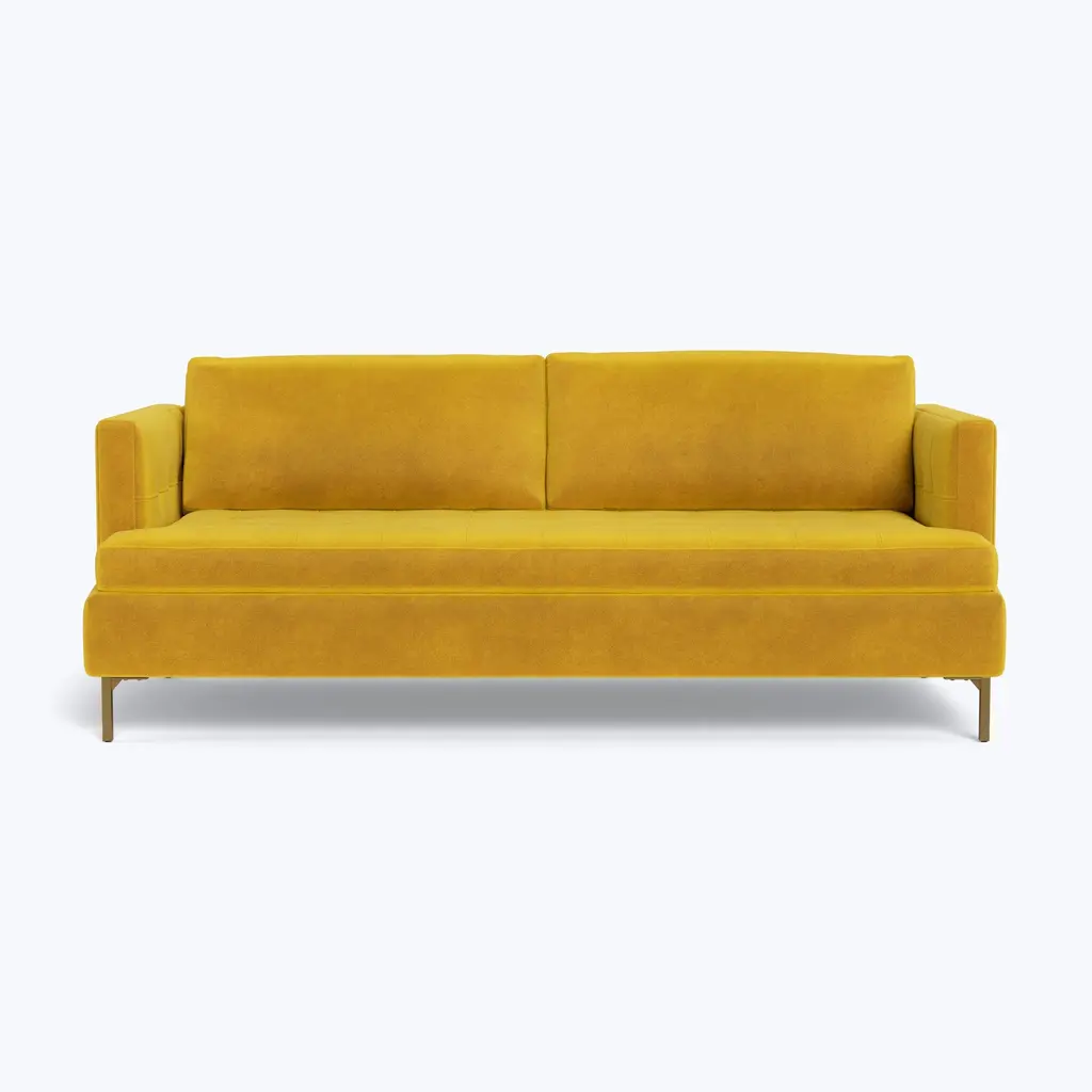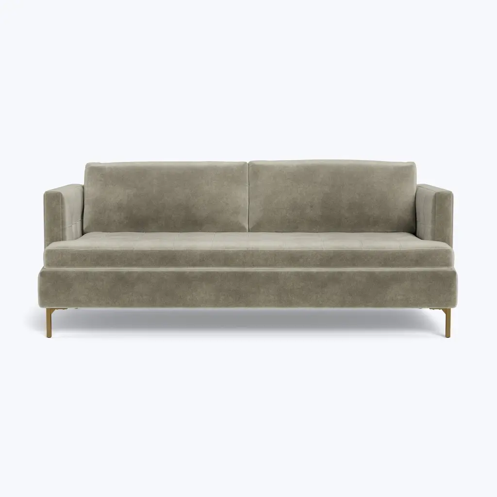 Exclusive to ABC Carpet & Home, the Boutique Apartment Sofa is the epitome of timeless grace combined with luxurious comfort. Designed to transform any space into a serene and sophisticated haven, its refined silhouette and brass legs serve as the perfect focal point, effortlessly elevating your home décor. Whether placed in a cozy apartment or a chic urban loft, this sofa offers a touch of understated elegance that enhances any living space. The Boutique Apartment Sofa’s striking design is accentuated by its biscuit-tufted bench seat, offering an indulgent seating experience. The unique reversible cushions provide a delightful twist, featuring biscuit tufts on one side and button-tufted detailing on the other. This dual design allows you to refresh your aesthetic with ease, adapting the look of your living space whenever desired. The combination of thoughtful design and ultimate comfort makes this sofa not only a visual centerpiece but also a functional one. To further elevate your living room, the Boutique collection offers a complementary chair and ottoman that beautifully pair with the 78-inch Apartment Sofa. Together, these pieces create a curated ensemble that brings both charm and relaxation to your home. Ideal for a serene modern retreat or a lively urban setting, the Boutique collection is designed with both comfort and style in mind. Each piece showcases artistic craftsmanship and inviting elegance, offering a space where relaxation and sophistication coexist. Hand-crafted from sustainably sourced wood, the Boutique Apartment Sofa adheres to ABC’s Goodwood Standards, reflecting a commitment to ethical and eco-friendly manufacturing practices. Made in the USA as part of the Cobble Hill Collection, this sofa represents quality craftsmanship and a dedication to sustainability. Its construction not only ensures durability but also aligns with values of environmental consciousness, making it a timeless and responsible addition to your home. Customization is key with the Boutique Apartment Sofa. With over 80 fabric options to choose from, including rich velvets, breezy linens, soft cottons, durable polyester blends, and high-performance fabrics, you can tailor the sofa to perfectly match your personal style. Each fabric is designed to withstand the demands of everyday life while maintaining an air of sophistication. Handcrafted to order, your Boutique Sofa will be delivered within 8-10 weeks, offering a bespoke touch of refined luxury and lasting comfort to your living space.