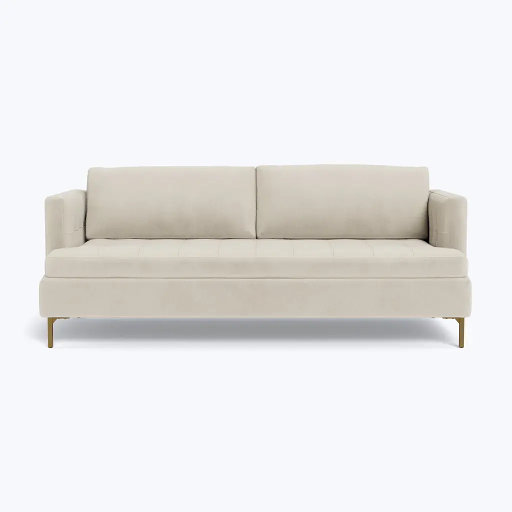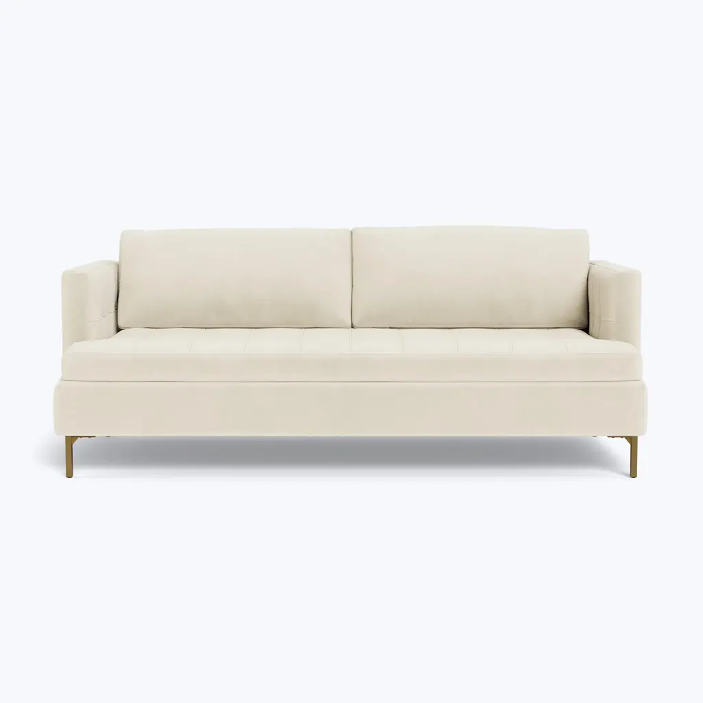 Exclusive to ABC Carpet & Home, the Boutique Apartment Sofa is the epitome of timeless grace combined with luxurious comfort. Designed to transform any space into a serene and sophisticated haven, its refined silhouette and brass legs serve as the perfect focal point, effortlessly elevating your home décor. Whether placed in a cozy apartment or a chic urban loft, this sofa offers a touch of understated elegance that enhances any living space. The Boutique Apartment Sofa’s striking design is accentuated by its biscuit-tufted bench seat, offering an indulgent seating experience. The unique reversible cushions provide a delightful twist, featuring biscuit tufts on one side and button-tufted detailing on the other. This dual design allows you to refresh your aesthetic with ease, adapting the look of your living space whenever desired. The combination of thoughtful design and ultimate comfort makes this sofa not only a visual centerpiece but also a functional one. To further elevate your living room, the Boutique collection offers a complementary chair and ottoman that beautifully pair with the 78-inch Apartment Sofa. Together, these pieces create a curated ensemble that brings both charm and relaxation to your home. Ideal for a serene modern retreat or a lively urban setting, the Boutique collection is designed with both comfort and style in mind. Each piece showcases artistic craftsmanship and inviting elegance, offering a space where relaxation and sophistication coexist. Hand-crafted from sustainably sourced wood, the Boutique Apartment Sofa adheres to ABC’s Goodwood Standards, reflecting a commitment to ethical and eco-friendly manufacturing practices. Made in the USA as part of the Cobble Hill Collection, this sofa represents quality craftsmanship and a dedication to sustainability. Its construction not only ensures durability but also aligns with values of environmental consciousness, making it a timeless and responsible addition to your home. Customization is key with the Boutique Apartment Sofa. With over 80 fabric options to choose from, including rich velvets, breezy linens, soft cottons, durable polyester blends, and high-performance fabrics, you can tailor the sofa to perfectly match your personal style. Each fabric is designed to withstand the demands of everyday life while maintaining an air of sophistication. Handcrafted to order, your Boutique Sofa will be delivered within 8-10 weeks, offering a bespoke touch of refined luxury and lasting comfort to your living space.