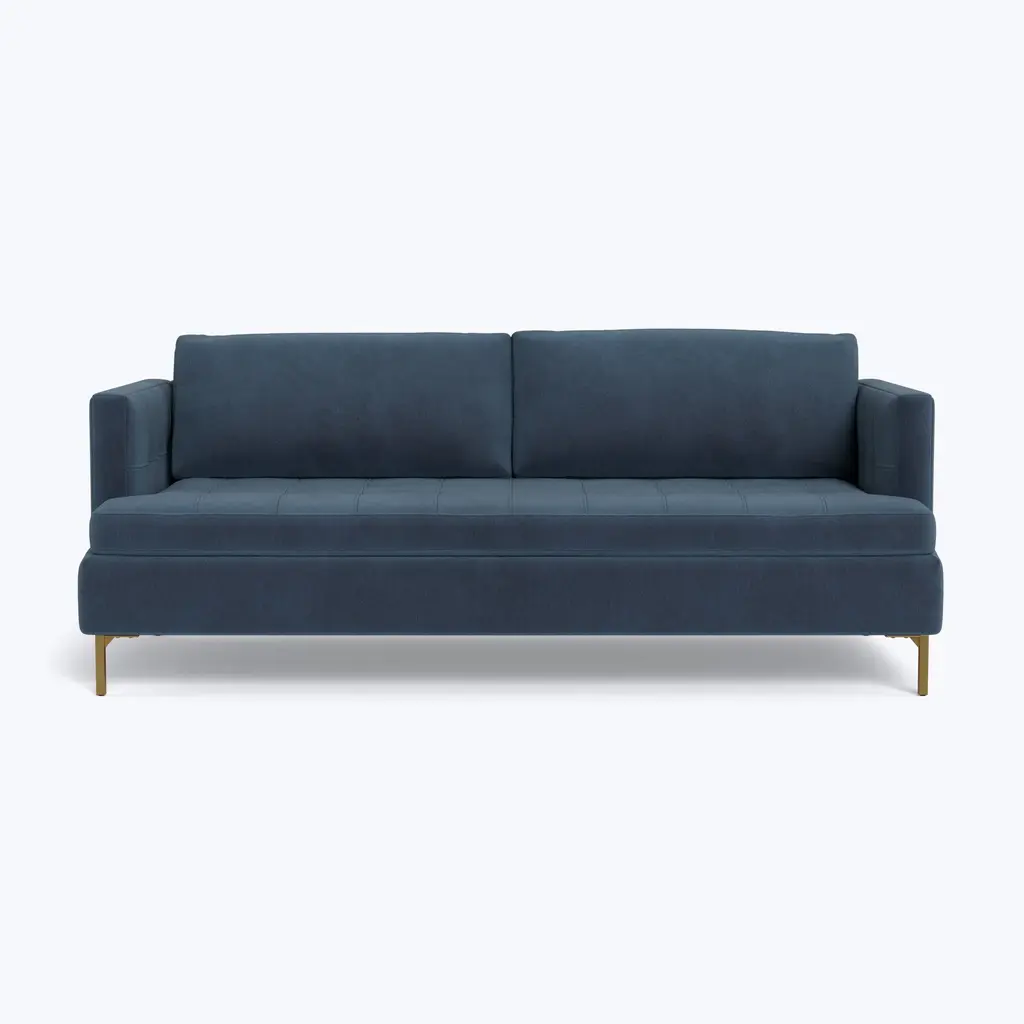 Exclusive to ABC Carpet & Home, the Boutique Apartment Sofa is the epitome of timeless grace combined with luxurious comfort. Designed to transform any space into a serene and sophisticated haven, its refined silhouette and brass legs serve as the perfect focal point, effortlessly elevating your home décor. Whether placed in a cozy apartment or a chic urban loft, this sofa offers a touch of understated elegance that enhances any living space. The Boutique Apartment Sofa’s striking design is accentuated by its biscuit-tufted bench seat, offering an indulgent seating experience. The unique reversible cushions provide a delightful twist, featuring biscuit tufts on one side and button-tufted detailing on the other. This dual design allows you to refresh your aesthetic with ease, adapting the look of your living space whenever desired. The combination of thoughtful design and ultimate comfort makes this sofa not only a visual centerpiece but also a functional one. To further elevate your living room, the Boutique collection offers a complementary chair and ottoman that beautifully pair with the 78-inch Apartment Sofa. Together, these pieces create a curated ensemble that brings both charm and relaxation to your home. Ideal for a serene modern retreat or a lively urban setting, the Boutique collection is designed with both comfort and style in mind. Each piece showcases artistic craftsmanship and inviting elegance, offering a space where relaxation and sophistication coexist. Hand-crafted from sustainably sourced wood, the Boutique Apartment Sofa adheres to ABC’s Goodwood Standards, reflecting a commitment to ethical and eco-friendly manufacturing practices. Made in the USA as part of the Cobble Hill Collection, this sofa represents quality craftsmanship and a dedication to sustainability. Its construction not only ensures durability but also aligns with values of environmental consciousness, making it a timeless and responsible addition to your home. Customization is key with the Boutique Apartment Sofa. With over 80 fabric options to choose from, including rich velvets, breezy linens, soft cottons, durable polyester blends, and high-performance fabrics, you can tailor the sofa to perfectly match your personal style. Each fabric is designed to withstand the demands of everyday life while maintaining an air of sophistication. Handcrafted to order, your Boutique Sofa will be delivered within 8-10 weeks, offering a bespoke touch of refined luxury and lasting comfort to your living space.