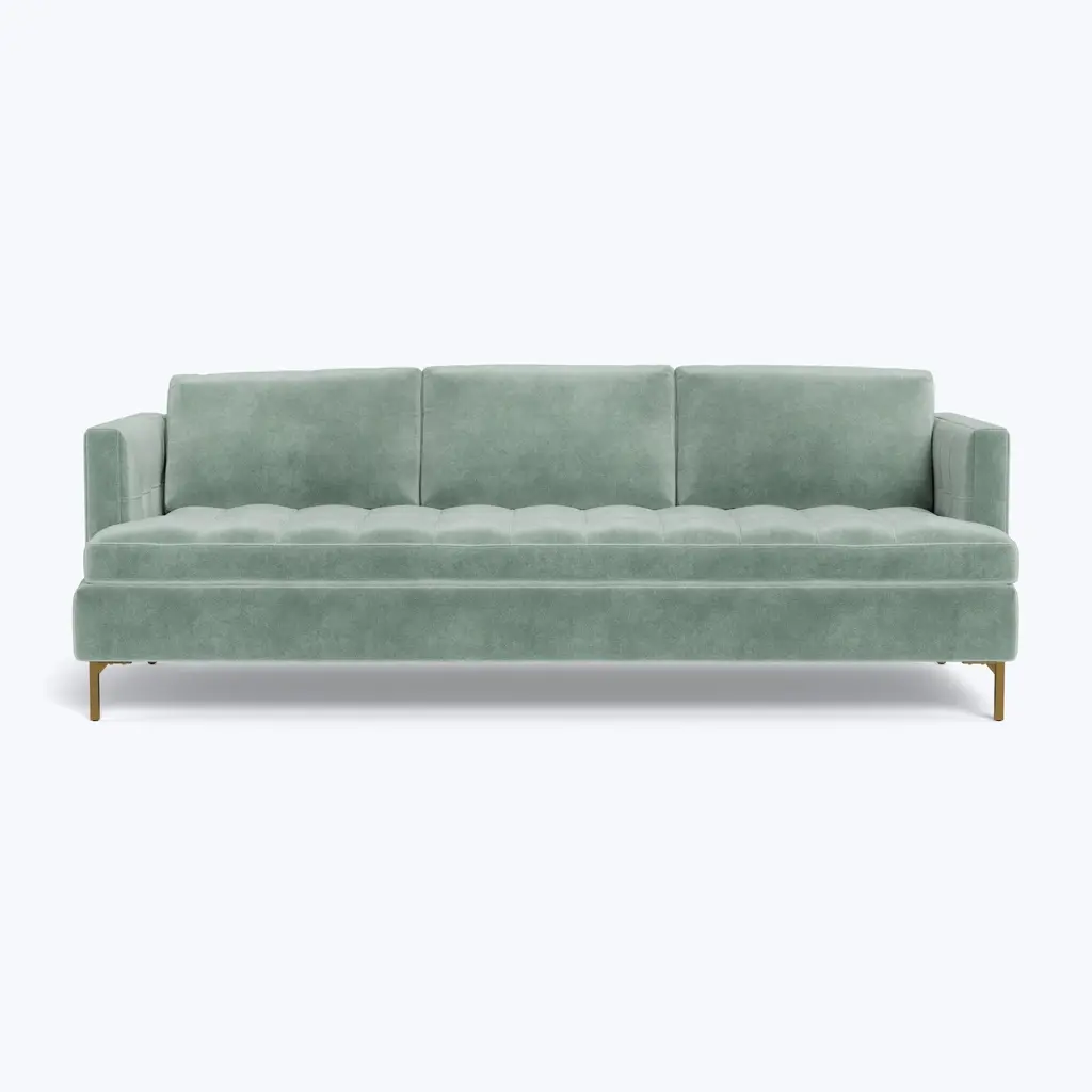 Exclusive to ABC Carpet & Home, the Boutique 88" Sofa is a perfect blend of timeless elegance and luxurious comfort. Its refined silhouette and brass legs create a striking focal point, elevating any room with serene sophistication. Whether used in a spacious living room or as a statement piece in a contemporary loft, this sofa exudes grace while offering exceptional comfort for everyday use. The Boutique Sofa features a beautifully crafted biscuit-tufted bench seat that invites indulgence and relaxation. The unique reversible cushions are a standout design element, offering biscuit tufts on one side and button-tufted elegance on the other. This thoughtful feature allows you to easily refresh your room’s aesthetic, making it adaptable to your personal style and giving the flexibility to change the look with ease. The combination of exquisite detailing and plush comfort ensures that this sofa is both a visual masterpiece and a welcoming retreat. To complement the 88-inch Boutique Sofa, the collection includes a matching chair and ottoman, designed to bring additional charm and comfort to your home. Together, these pieces form a curated ensemble perfect for a modern urban setting or a serene, stylish retreat. With its artistic craftsmanship and understated beauty, the Boutique collection effortlessly enhances any space, providing a seamless blend of style and functionality. Crafted from sustainably sourced wood that adheres to ABC’s Goodwood Standards, the Boutique 88" Sofa reflects a commitment to eco-friendly manufacturing. Made in the USA as part of the Cobble Hill Collection, this sofa is not only stylish but also environmentally conscious. Its construction guarantees long-lasting durability while embracing the values of sustainability, offering an eco-conscious yet luxurious option for your home. Customization is at the heart of the Boutique 88" Sofa. With over 80 fabric options available, you can personalize the look to suit your décor. Whether you prefer the rich textures of velvet, the airy feel of linen, the softness of cotton, or the durability of performance fabrics, you can choose the perfect material to match your lifestyle. Each fabric is designed to withstand everyday wear while maintaining its elegance. Handcrafted with meticulous attention to detail, your custom Boutique Sofa will be delivered to your home within 8-10 weeks, bringing a touch of bespoke luxury and enduring comfort to your living space.