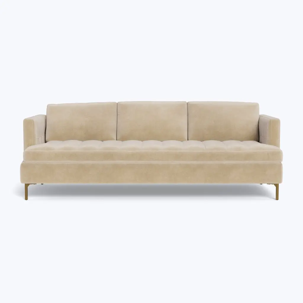 Exclusive to ABC Carpet & Home, the Boutique 88" Sofa is a perfect blend of timeless elegance and luxurious comfort. Its refined silhouette and brass legs create a striking focal point, elevating any room with serene sophistication. Whether used in a spacious living room or as a statement piece in a contemporary loft, this sofa exudes grace while offering exceptional comfort for everyday use. The Boutique Sofa features a beautifully crafted biscuit-tufted bench seat that invites indulgence and relaxation. The unique reversible cushions are a standout design element, offering biscuit tufts on one side and button-tufted elegance on the other. This thoughtful feature allows you to easily refresh your room’s aesthetic, making it adaptable to your personal style and giving the flexibility to change the look with ease. The combination of exquisite detailing and plush comfort ensures that this sofa is both a visual masterpiece and a welcoming retreat. To complement the 88-inch Boutique Sofa, the collection includes a matching chair and ottoman, designed to bring additional charm and comfort to your home. Together, these pieces form a curated ensemble perfect for a modern urban setting or a serene, stylish retreat. With its artistic craftsmanship and understated beauty, the Boutique collection effortlessly enhances any space, providing a seamless blend of style and functionality. Crafted from sustainably sourced wood that adheres to ABC’s Goodwood Standards, the Boutique 88" Sofa reflects a commitment to eco-friendly manufacturing. Made in the USA as part of the Cobble Hill Collection, this sofa is not only stylish but also environmentally conscious. Its construction guarantees long-lasting durability while embracing the values of sustainability, offering an eco-conscious yet luxurious option for your home. Customization is at the heart of the Boutique 88" Sofa. With over 80 fabric options available, you can personalize the look to suit your décor. Whether you prefer the rich textures of velvet, the airy feel of linen, the softness of cotton, or the durability of performance fabrics, you can choose the perfect material to match your lifestyle. Each fabric is designed to withstand everyday wear while maintaining its elegance. Handcrafted with meticulous attention to detail, your custom Boutique Sofa will be delivered to your home within 8-10 weeks, bringing a touch of bespoke luxury and enduring comfort to your living space.