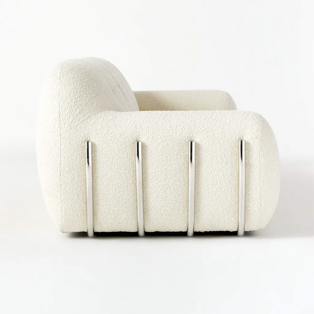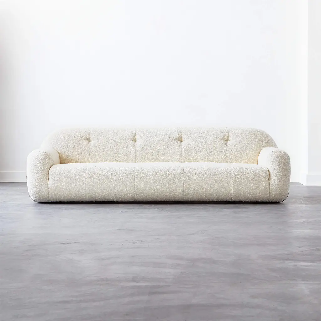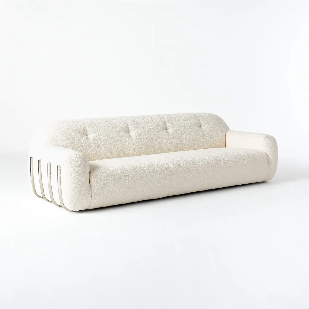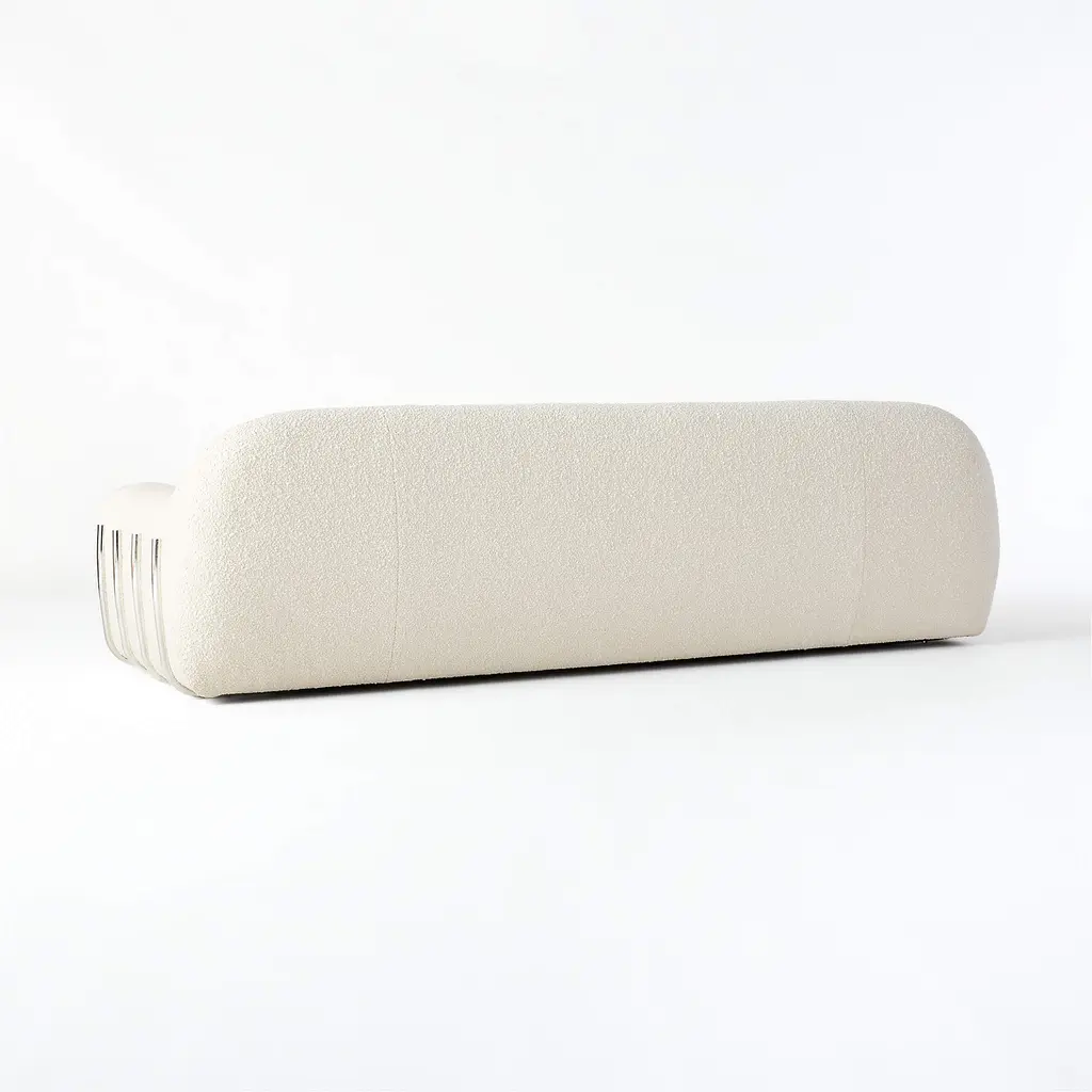 1970s Italian-inspired sofa designed by Jannis Ellenberger makes lounging look vintage. Curvaceous design is wrapped in a creamy ivory boucle that brings soft texture and dimension to the piece. Four metal braces add structural detail to each end. Luxe sofa is low, deep and so easy to sink into. Learn more about Jannis Ellenberger on our blog. CB2 exclusive.
