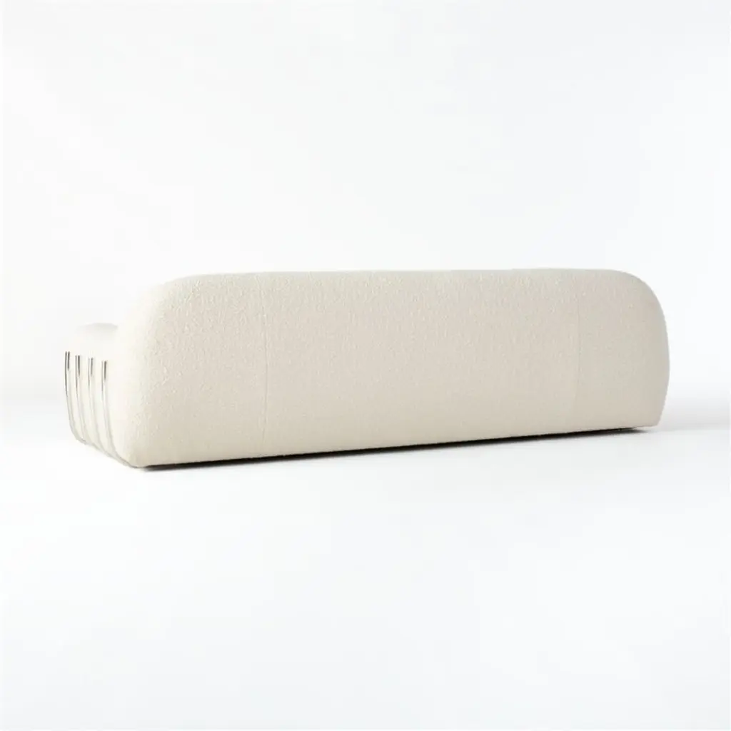 1970s Italian-inspired sofa designed by Jannis Ellenberger makes lounging look vintage. Curvaceous design is wrapped in a creamy ivory boucle that brings soft texture and dimension to the piece. Four metal braces add structural detail to each end. Luxe sofa is low, deep and so easy to sink into. Learn more about Jannis Ellenberger on our blog. CB2 exclusive.