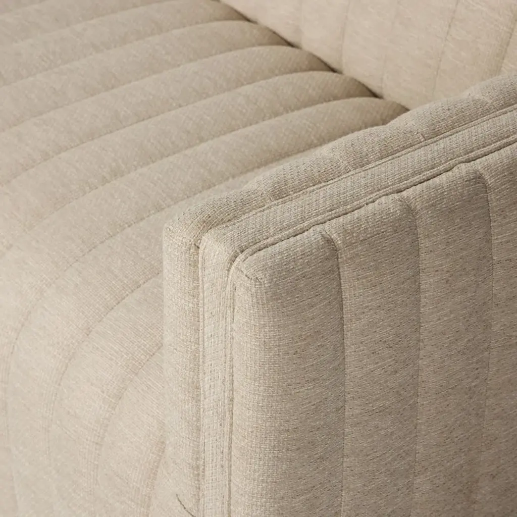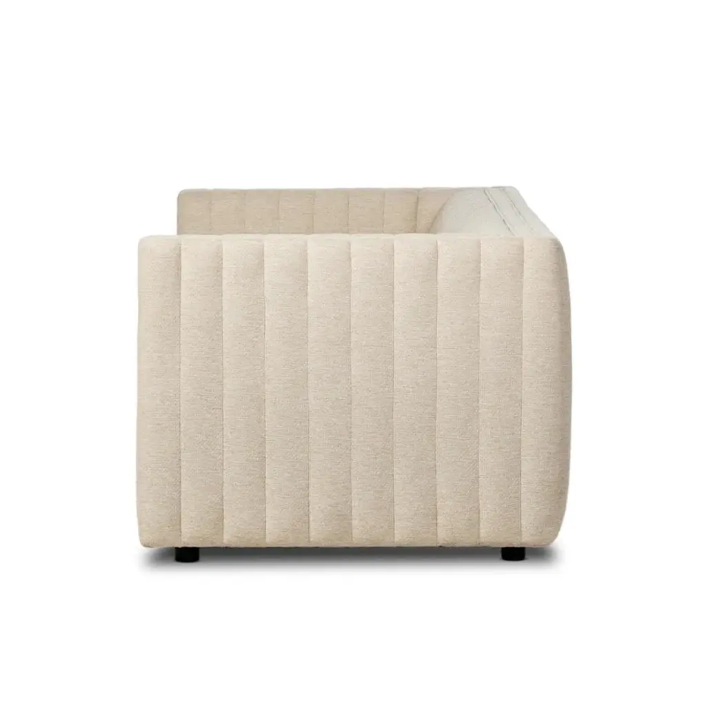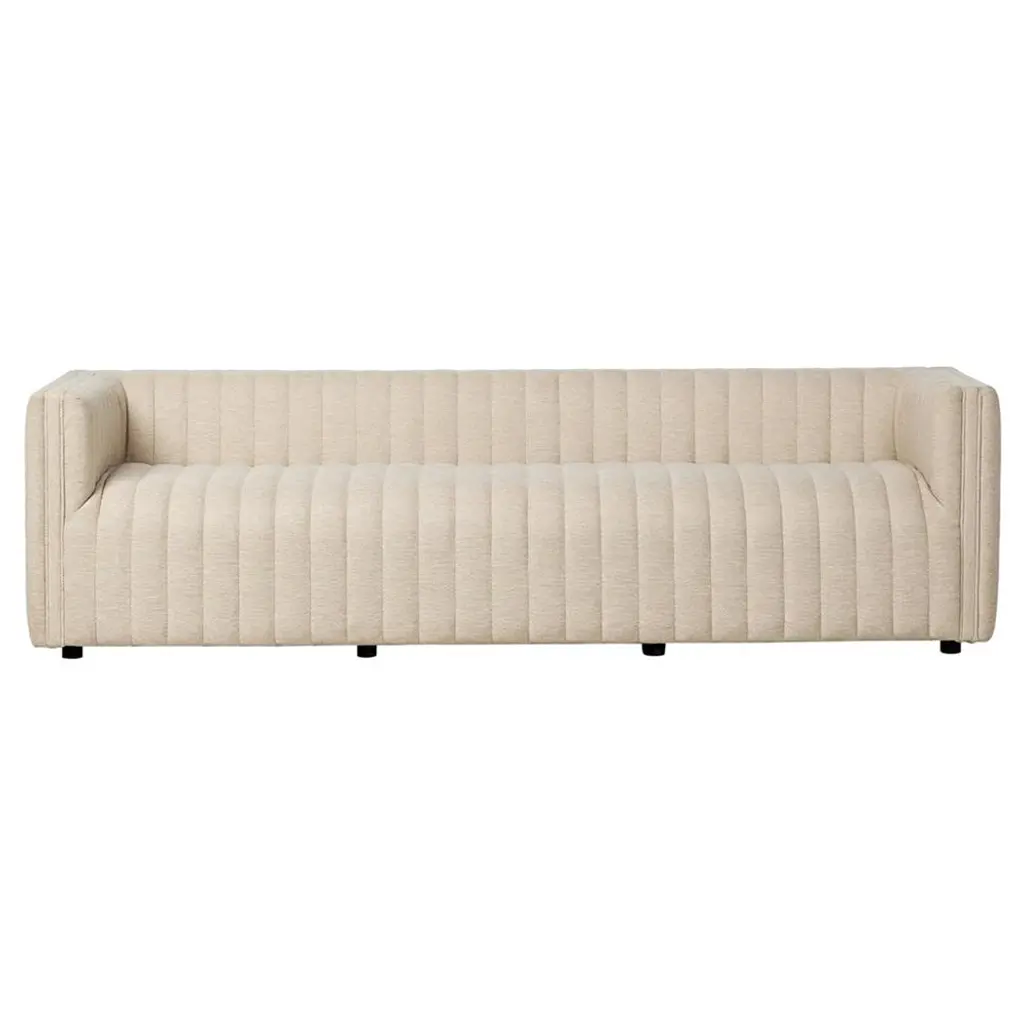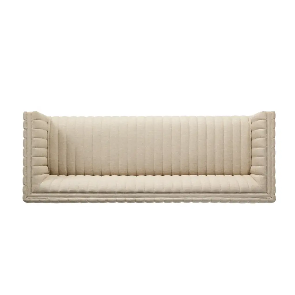 A dramatically channeled outdoor sofa with subtly textured upholstery for a clean, inviting look. Cover or store indoors during inclement weather and when not in use.