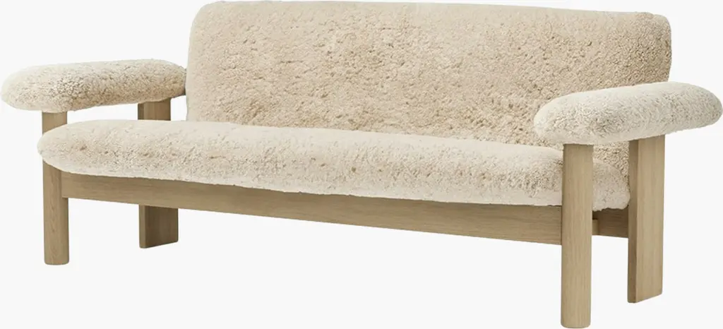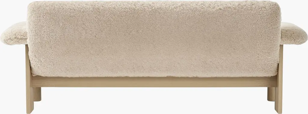 Brazilian modernism meets midcentury Scandinavian design in the Brasilia Sofa (2024.) Its low-profile frame and gently contoured cushions create a harmonious sense of balance. The exaggerated armrests and pillowy seat come luxuriously upholstered in highly tactile fabric or sheepskin. Brasilia's walnut or oak frame is subtly angled for lounge-like comfort, while chunky wood legs add an air of play and lightness. Designed by Norwegian studio Anderssen & Voll, the sofa's bold spirit and refined profile transcends trends making it an elegant addition to both contemporary interiors and more traditional settings. Made in Mexico.