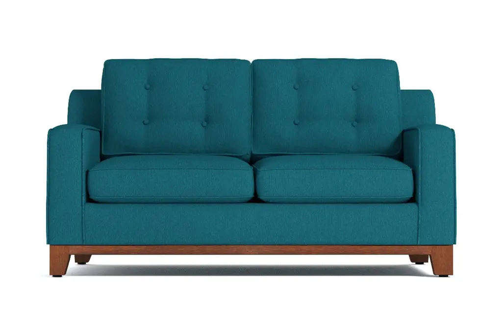 Is your current couch looking a little drab? Upgrade to something that even the most discerning designer would approve of with the Brentwood apartment size sofa. Talk about stylish seating - the button-tufted seat cushions, track arms and wood frame make this an elegant accent you'll love to show off to your guests. It's even cozy too thanks to the ultra-plush cushions, so it's great for entertaining guests, and entertaining yourself with a Netflix binge. Named for the famous L.A. neighborhood, it's no surprise that this sofa looks fit for a VIP. It even comes with some pretty sweet perks, including a limited lifetime warranty. The couch is made in the USA according to your customizations, including your choice of leg finish and fabric color. Get the celebrity treatment every time you sit down to watch TV or hang with your squad by getting the Brentwood apartment size sofa for your pad.