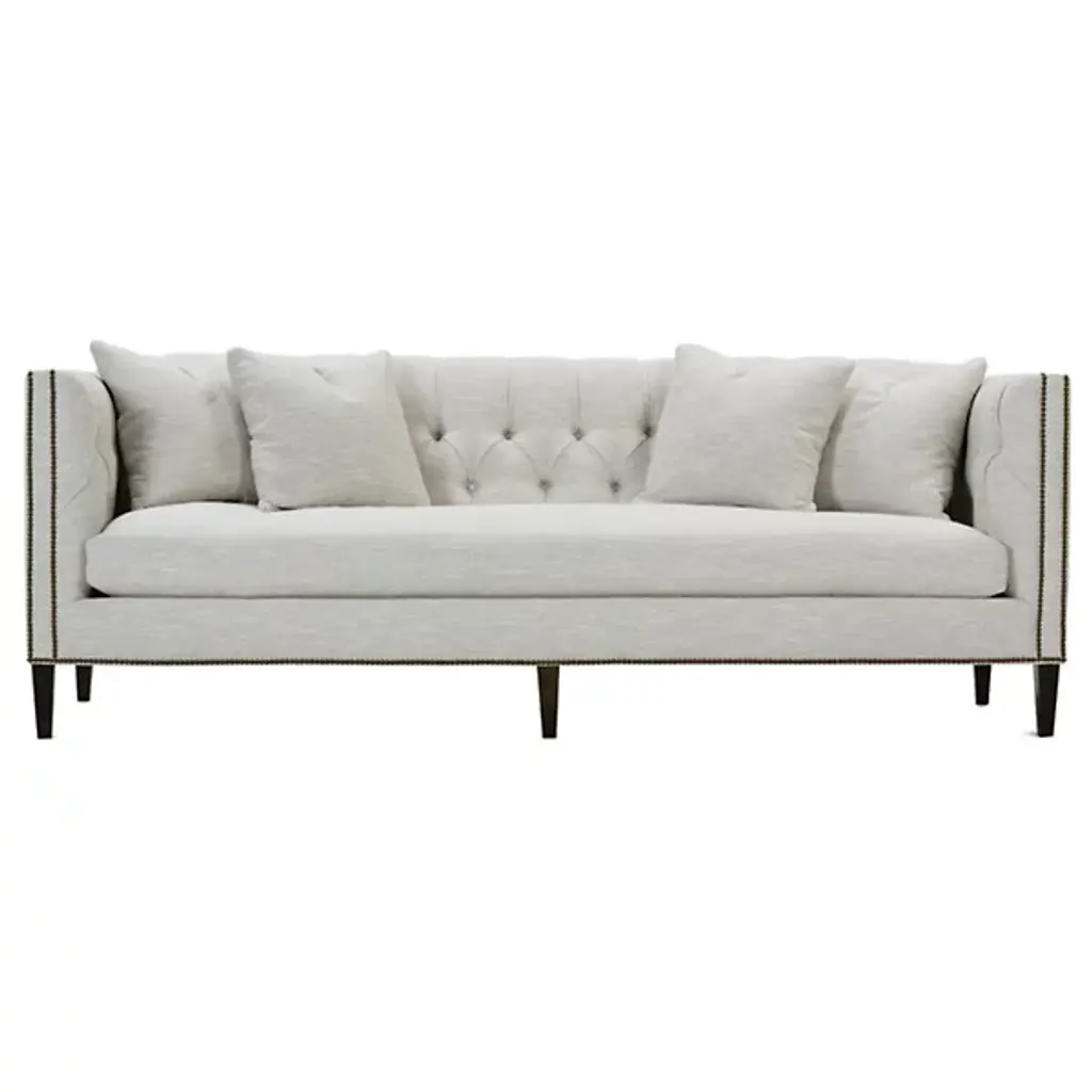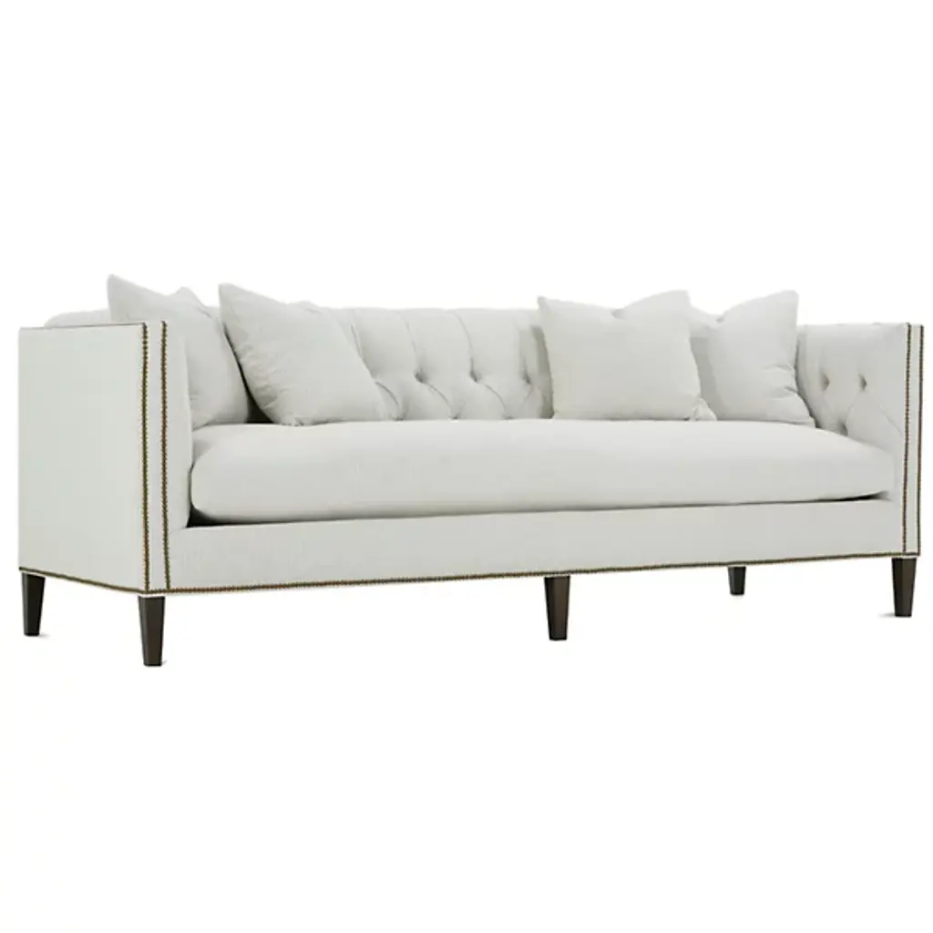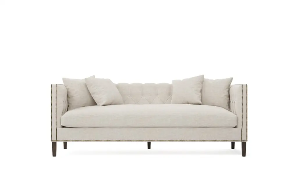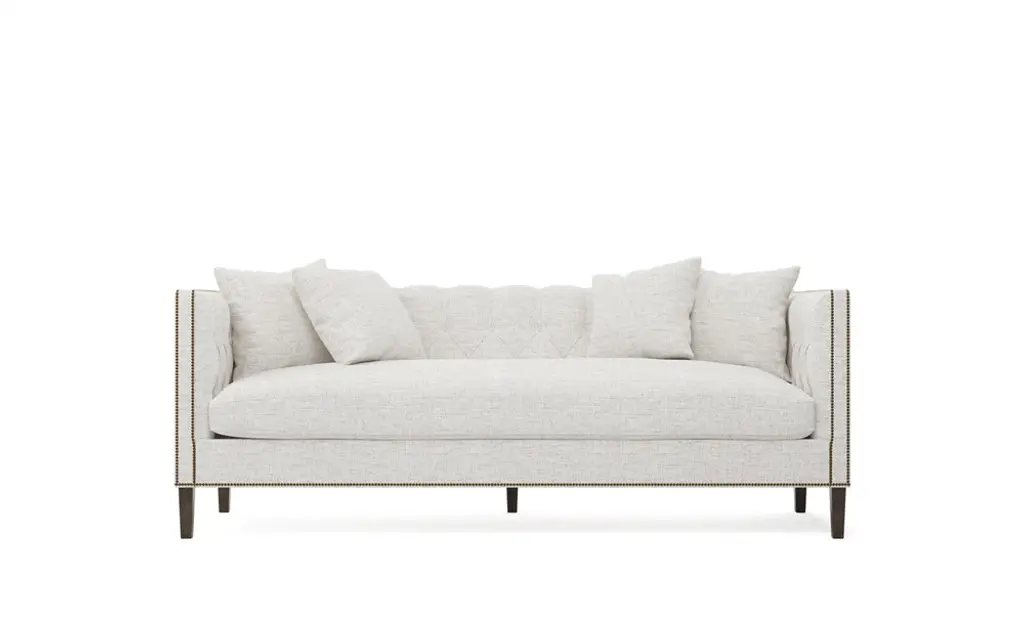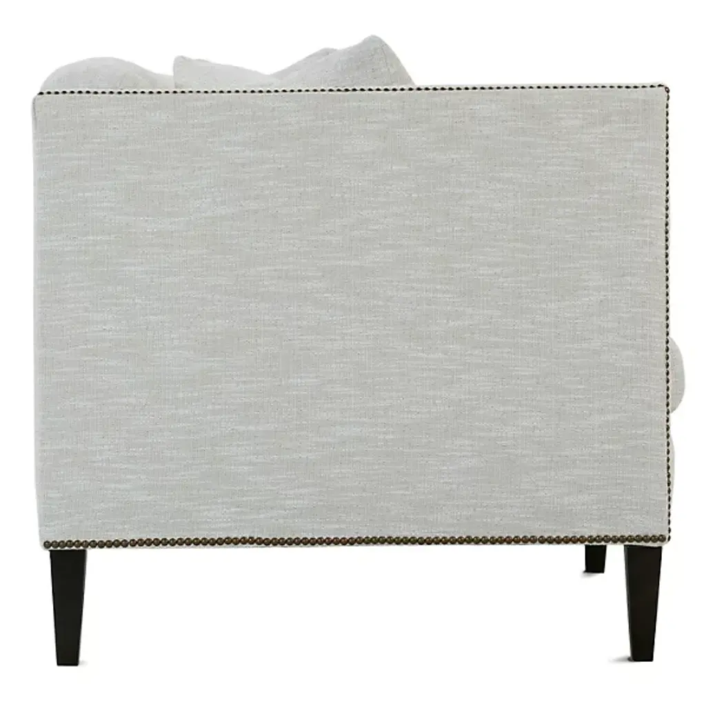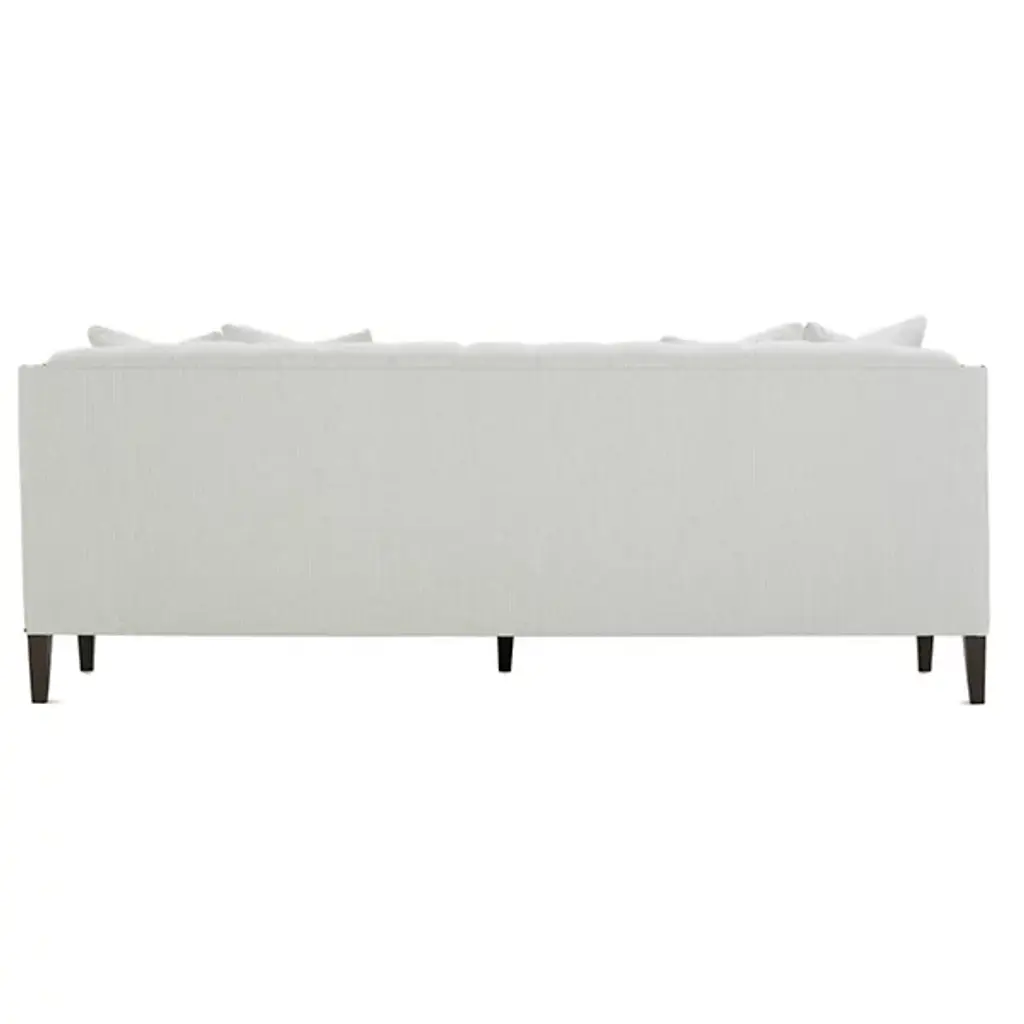 The Brette Sofa from Rowe Furniture stands out with its distinctive tuxedo-style frame accentuated by diamond tufting and nailhead trim. The high-resiliency foam cores ensure sustainable comfort while being environmentally responsible, containing no PBDEs or flame retardants. The cloud cushion design requires regular maintenance through fluffing and rotation to preserve its appealing shape. The straight lines of the frame create a structured foundation that works in both formal and casual settings.