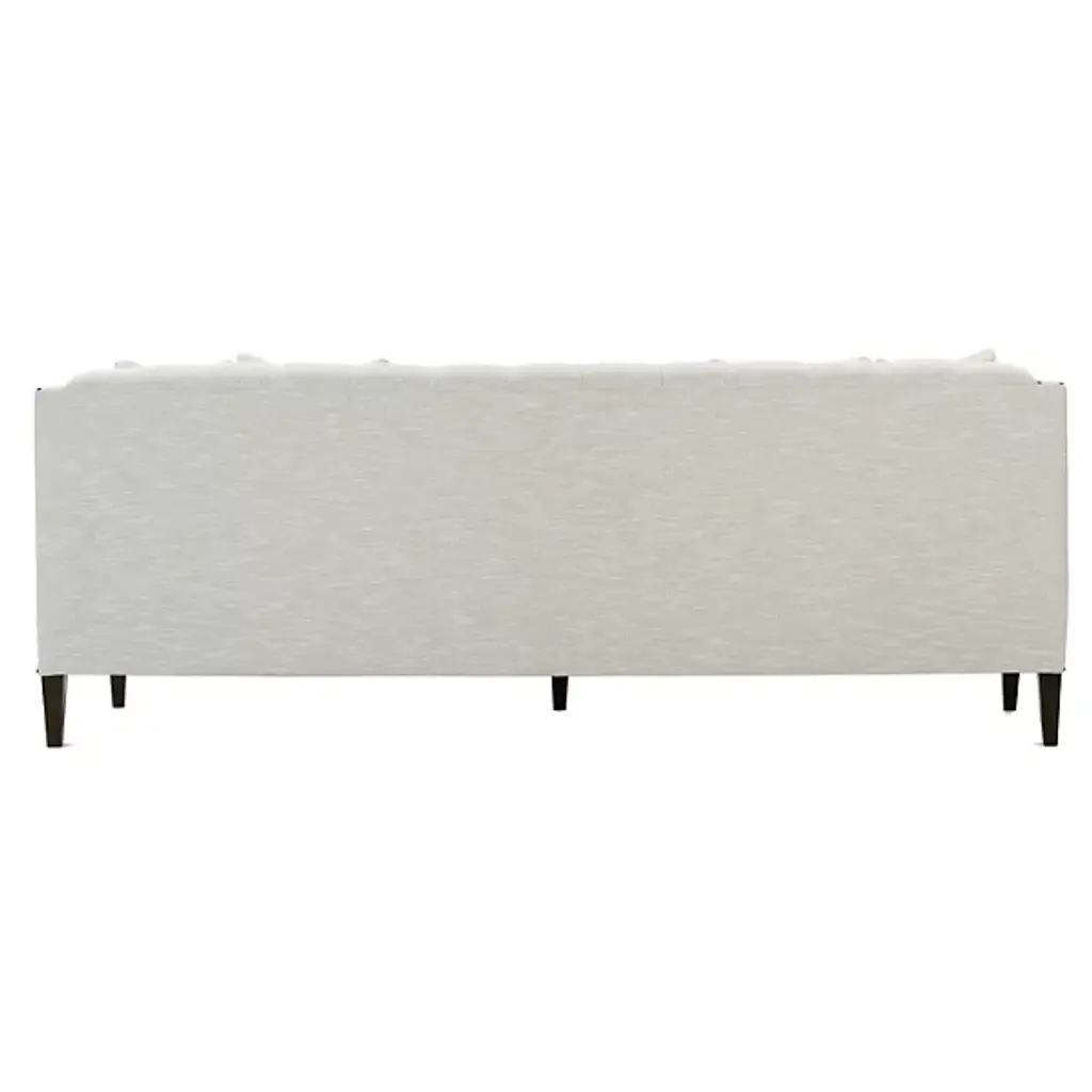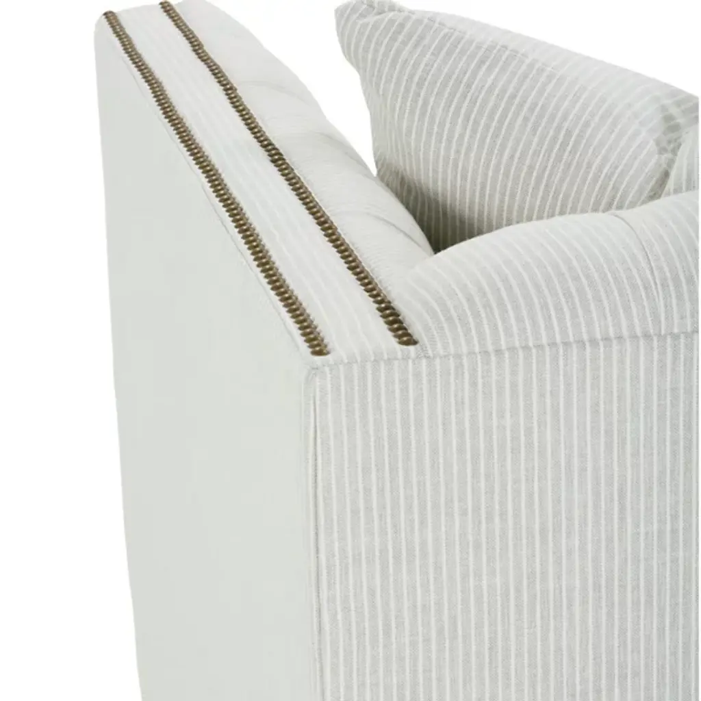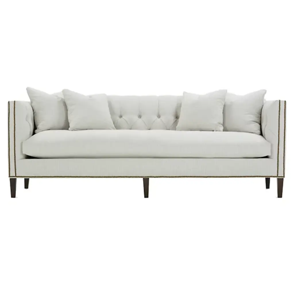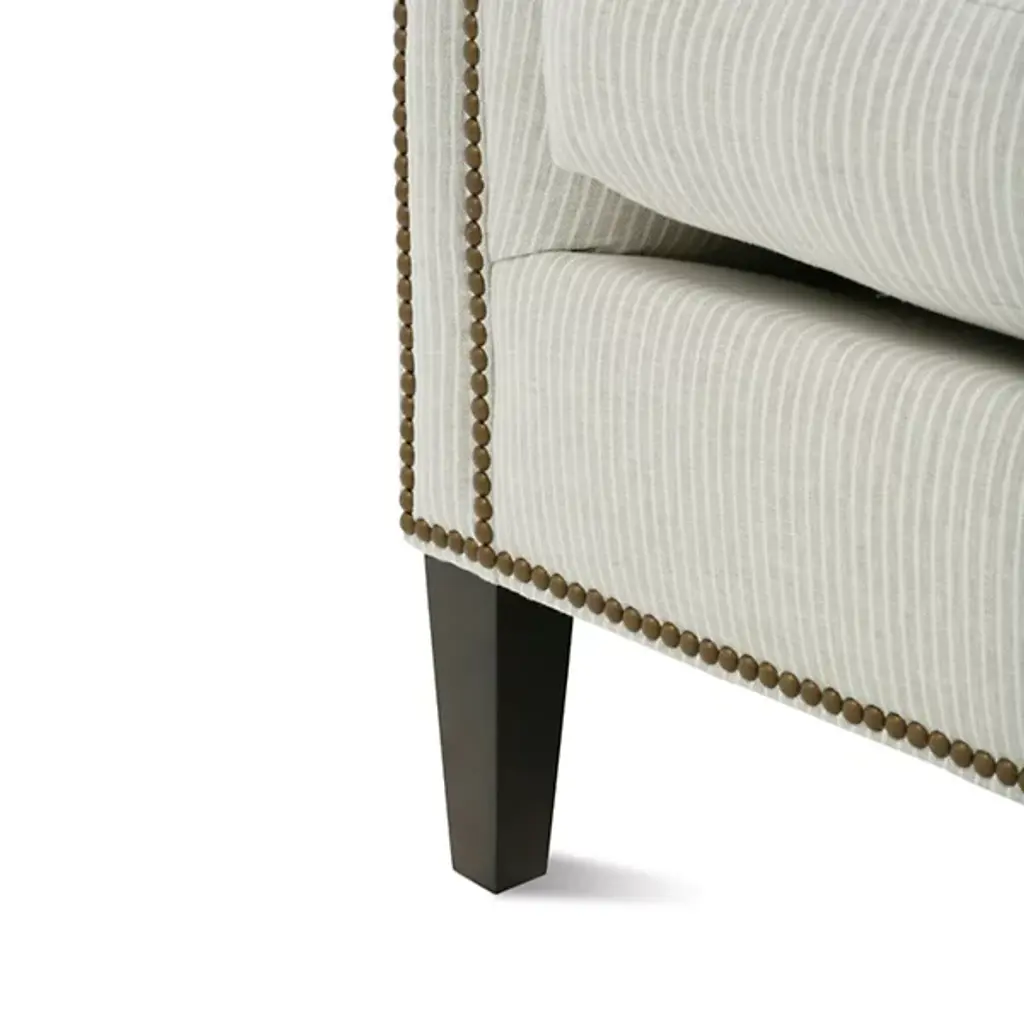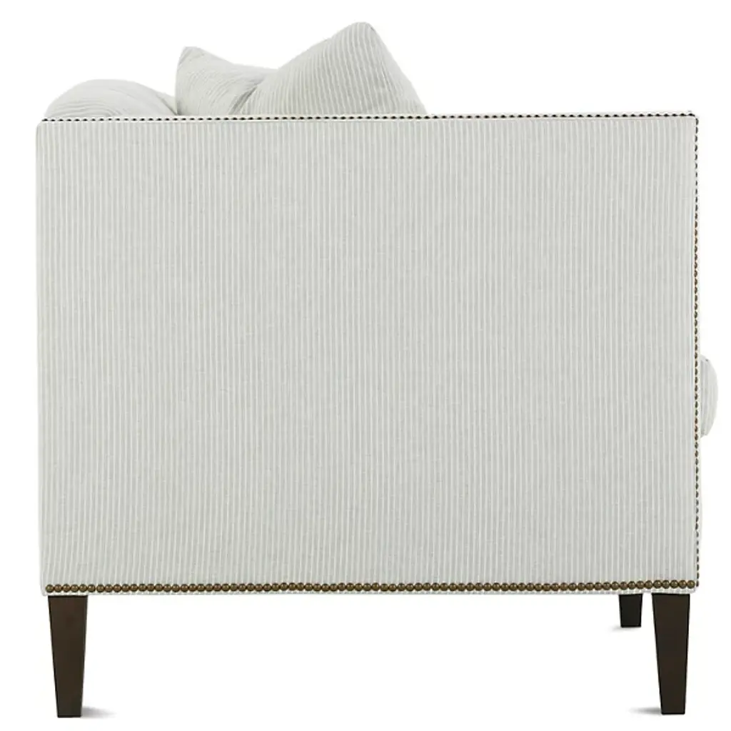 The Brette Sofa from Rowe Furniture stands out with its distinctive tuxedo-style frame accentuated by diamond tufting and nailhead trim. The high-resiliency foam cores ensure sustainable comfort while being environmentally responsible, containing no PBDEs or flame retardants. The cloud cushion design requires regular maintenance through fluffing and rotation to preserve its appealing shape. The straight lines of the frame create a structured foundation that works in both formal and casual settings.