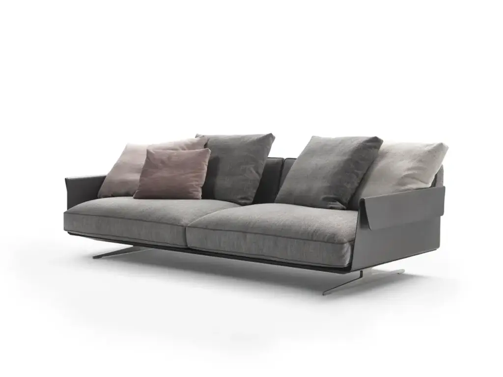The concept for the Bretton sofa places cowhide at the heart of the design. This quintessential, timeless material is a favorite at Flexform and the company has consistently refined the craftsmanship techniques that make it a customer favorite.The roomy seat and backrest cushions are generously padded and feature elegant details – like the grosgrain piping – that contrast with the exquisite simplicity of the metal armrest clad in cowhide, available in an array of colors or in suede.The sofa rests on a refined metal base, also clad in cowhide, while the cast aluminum feet feature a sleek design and are available in a number of sophisticated finishes.An amazingly versatile sofa, Bretton offers countless combinations between the cowhide structure and the upholstered parts, which can be covered in fabric or in leather.Seat frame in metal clad in cowhide in the following colors: white (5007), grey (5003), dark brown (5004), extra dark brown (5013), black (5005), olive (5006), Bulgarian red (5008), sand (5001), tobacco (5015), dark brown suede (6004), black suede (6005), olive suede (6003), sand suede (6001). With polyurethane foam mattressBackrest in metal with molded polyurethane padding, covered with a protective laminated fabricArmrest in metal clad in cowhide in the following colors: white (5007), grey (5003), dark brown (5004), extra dark brown (5013), black (5005), olive (5006), Bulgarian red (5008), sand (5001), tobacco (5015), dark brown suede (6004), black suede (6005), olive suede (6003), sand suede (6001)Seat cushions in polyester fiber with insert in single-density crushproof material. Premium seat cushions in sterilized goose down (Assopiuma Certified, Gold Label) with insert in high resilience crushproof materialBackrest cushions in sterilized goose down (Assopiuma Certified, Gold Label)Optional cushions in sterilized goose down (Assopiuma Certified, Gold Label); upon request, with upchargeFeet in cast aluminum with grey, bronze 820, satin, chrome, burnished, black chrome, or gun metal finish. Rests on tips made of thermoplastic materialUpholstery is removable in both the fabric and leather versions.Upholstery piping, fine tailoring includes grosgrain piping that can be crafted in all the colors on the sample board.