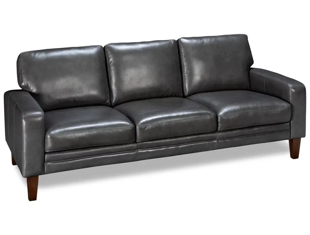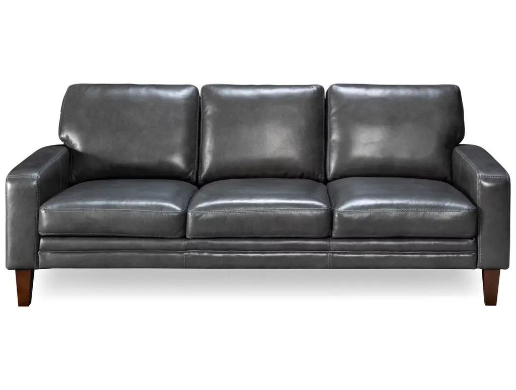 A stylish update to your living space, the Simon Li Brewster Leather Sofa is the perfect spot to unwind. Upholstered in a smooth dark grey leather with stitching details, sleek track arms, and supported by tall tapered wooden legs, this contemporary leather sofa will make a luxurious addition to your living room.