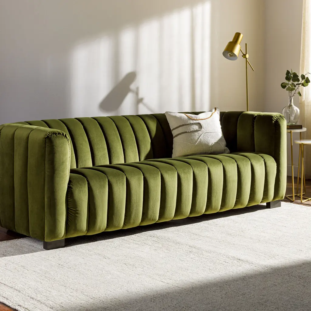 This luxurious Brionne Sofa is the perfect addition to any modern living space. Crafted from high-quality velvet, this sofa is both comfortable and stylish. The durable construction of Dacron, polyester, foam and wood ensures that it can hold up to 793.66 pounds of weight with ease. For effortless maintenance, spot clean only. Add a touch of sophistication and comfort to your home with this elegant piece today