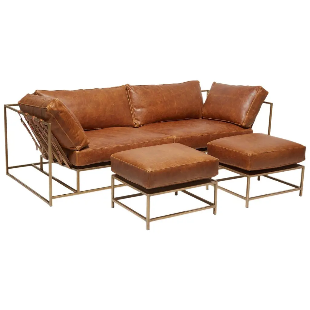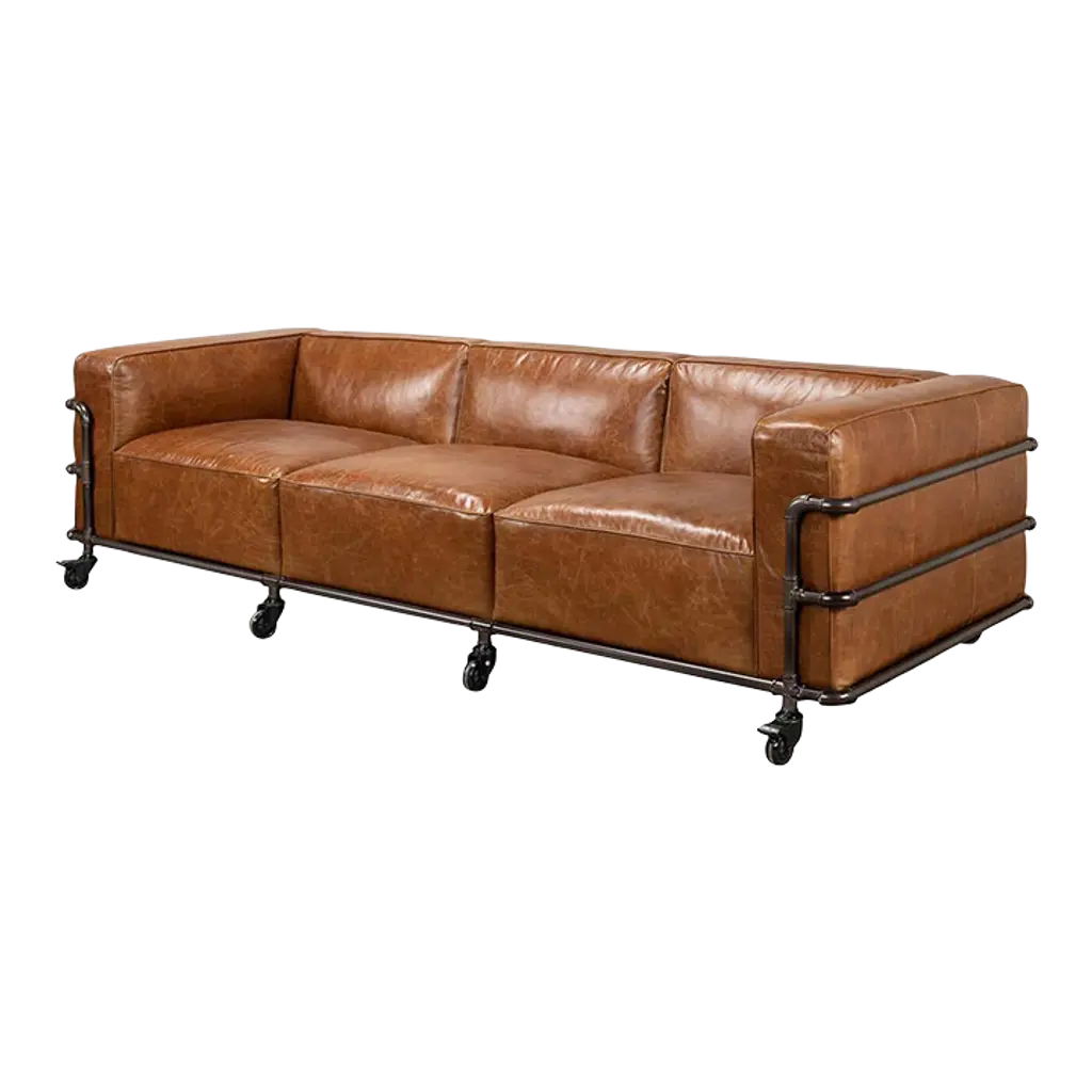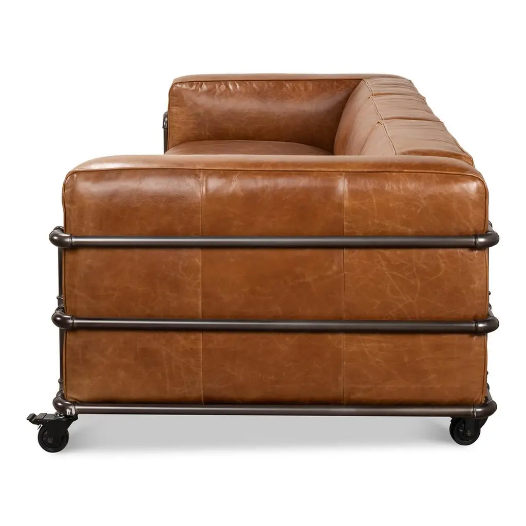 A modern British Industrial style triple sofa, with an Industrial exterior frame and large Industrial wheels. The sofa upholstered with vintage-style high-grade aniline brown leather. Dimensions: 102" W x 40" D x 28" HInterior seat - 82" W x 26" D x 20" HSome color variation is common and acceptable on vintage leather.