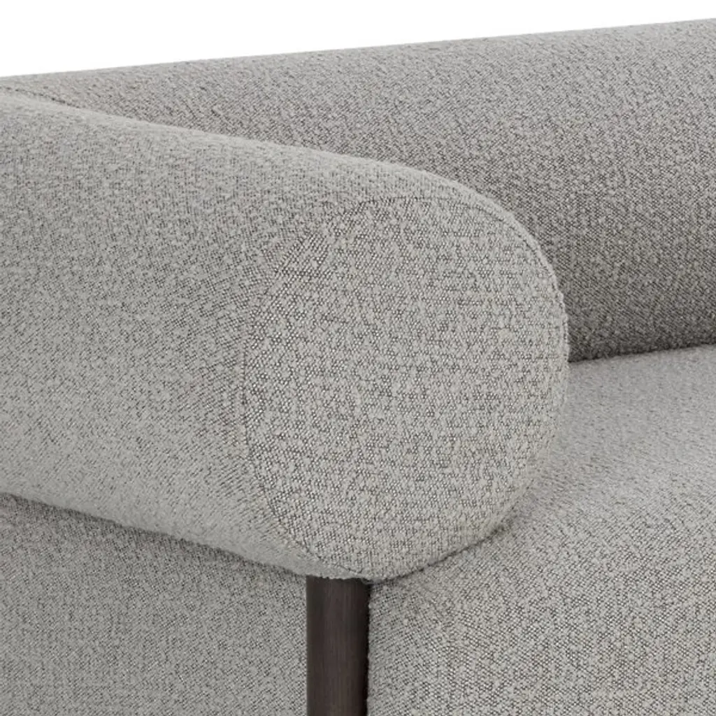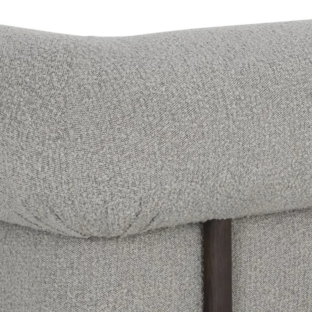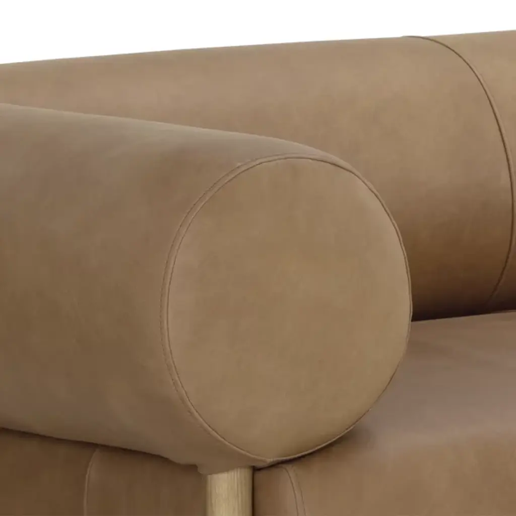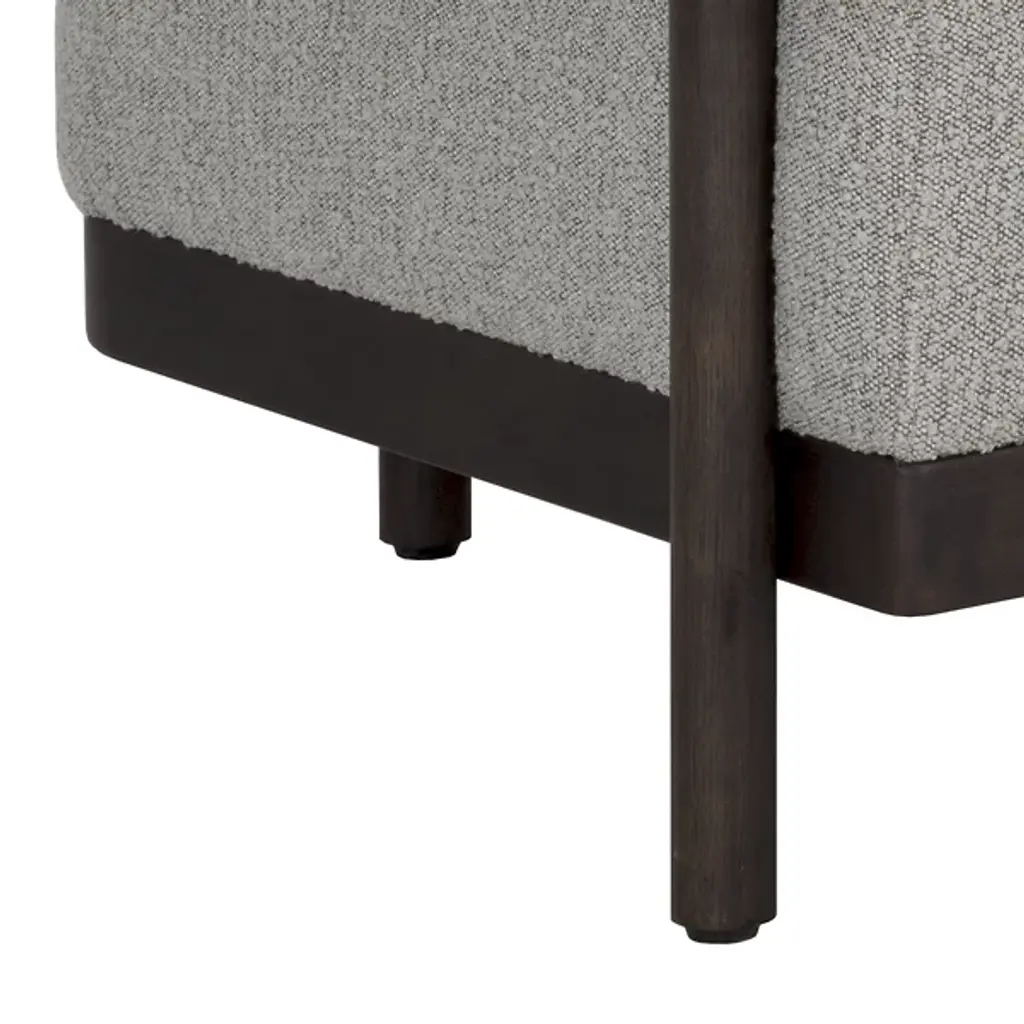 The Bromley Sofa from Sunpan makes a striking statement in any living space with its voluminous contours and inviting design. Upholstered in a luxurious fabric, this sofa offers wide arms and backrests for enhanced comfort. The oak wood base and detailing introduce a rustic touch, adding warmth to the overall aesthetic. Crafted from organic, porous wood, each piece features unique variations in texture, color, and grain, along with fine indentations, cracks, visible knots, and burls, all contributing to the sofa's distinctive character and charm.