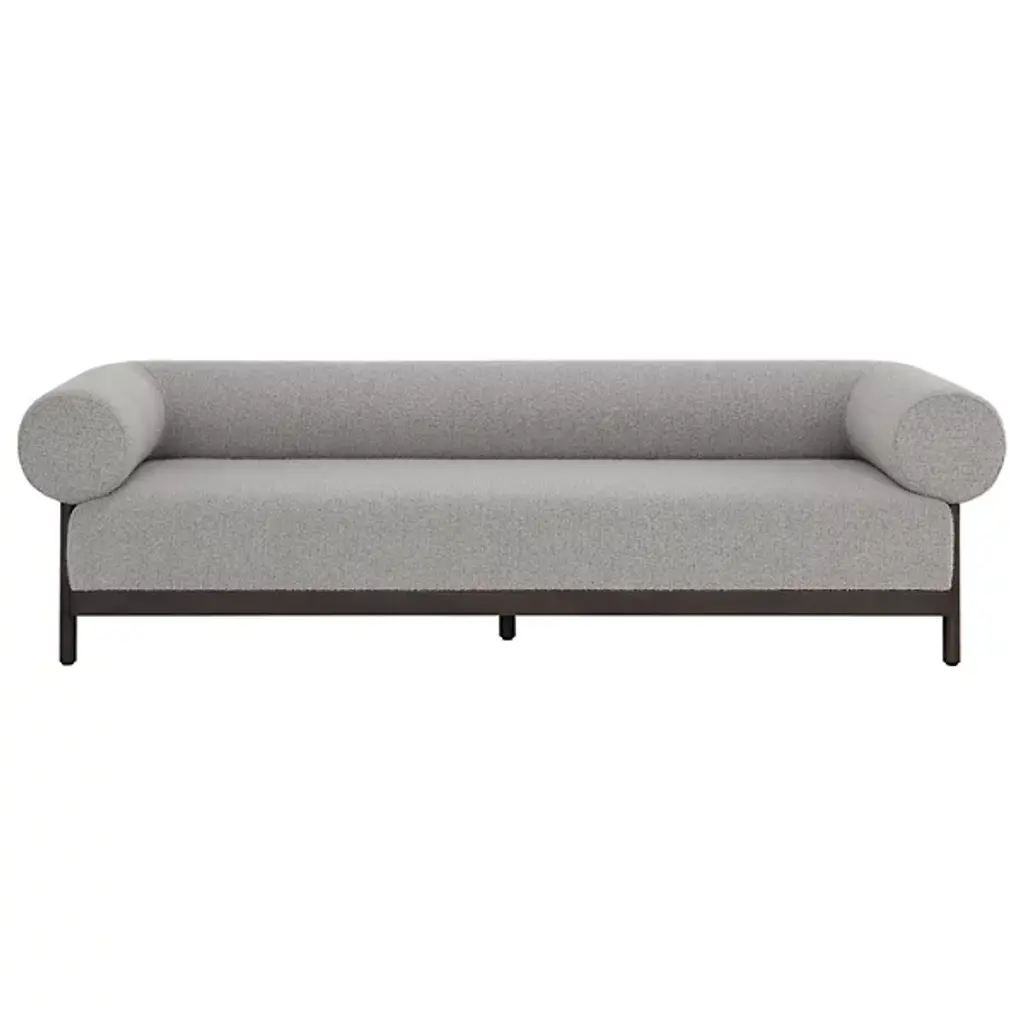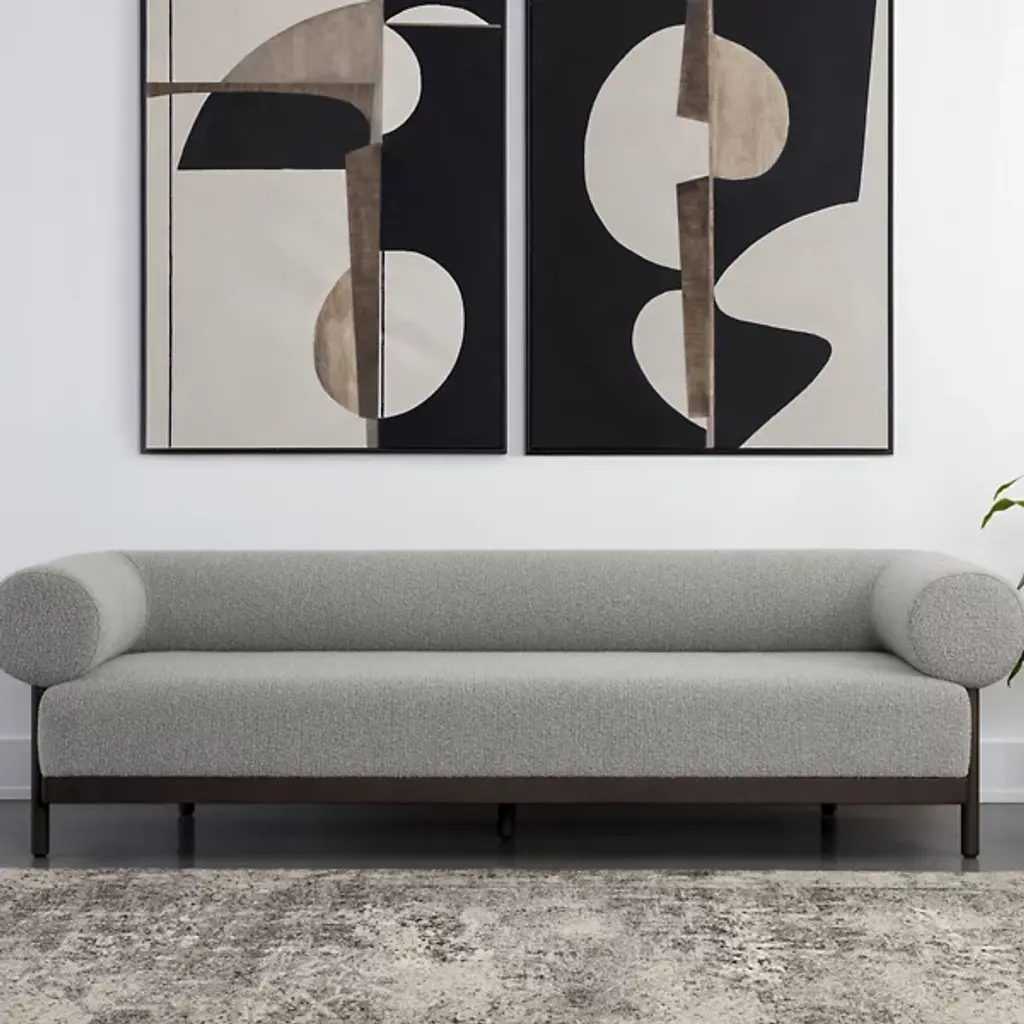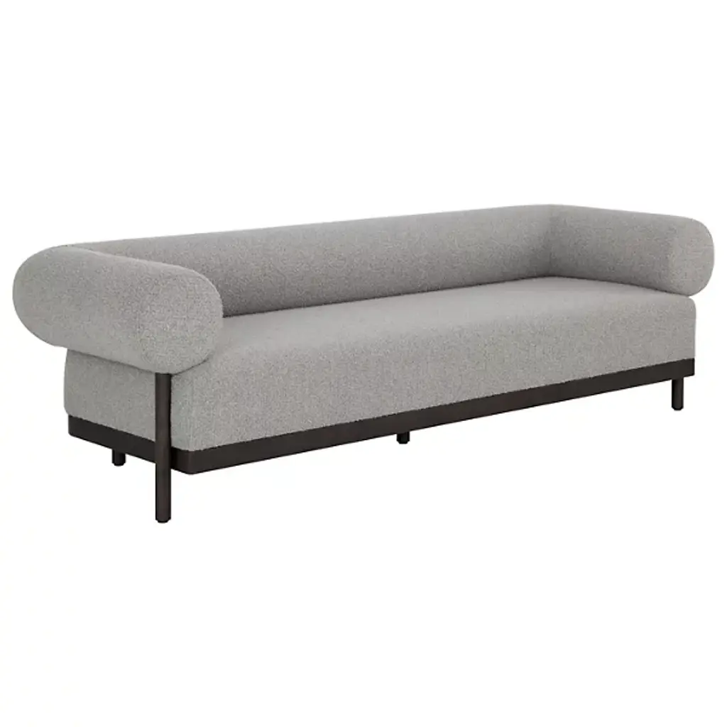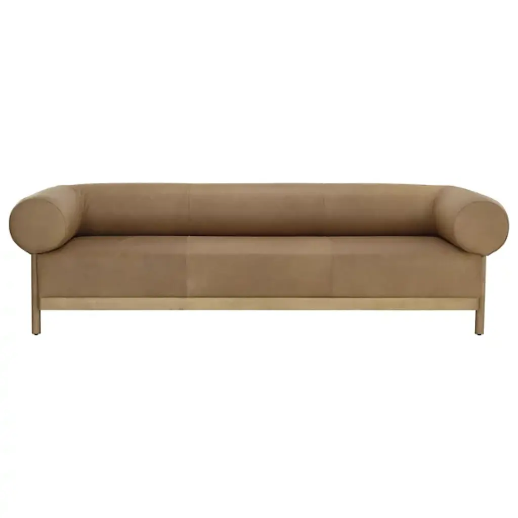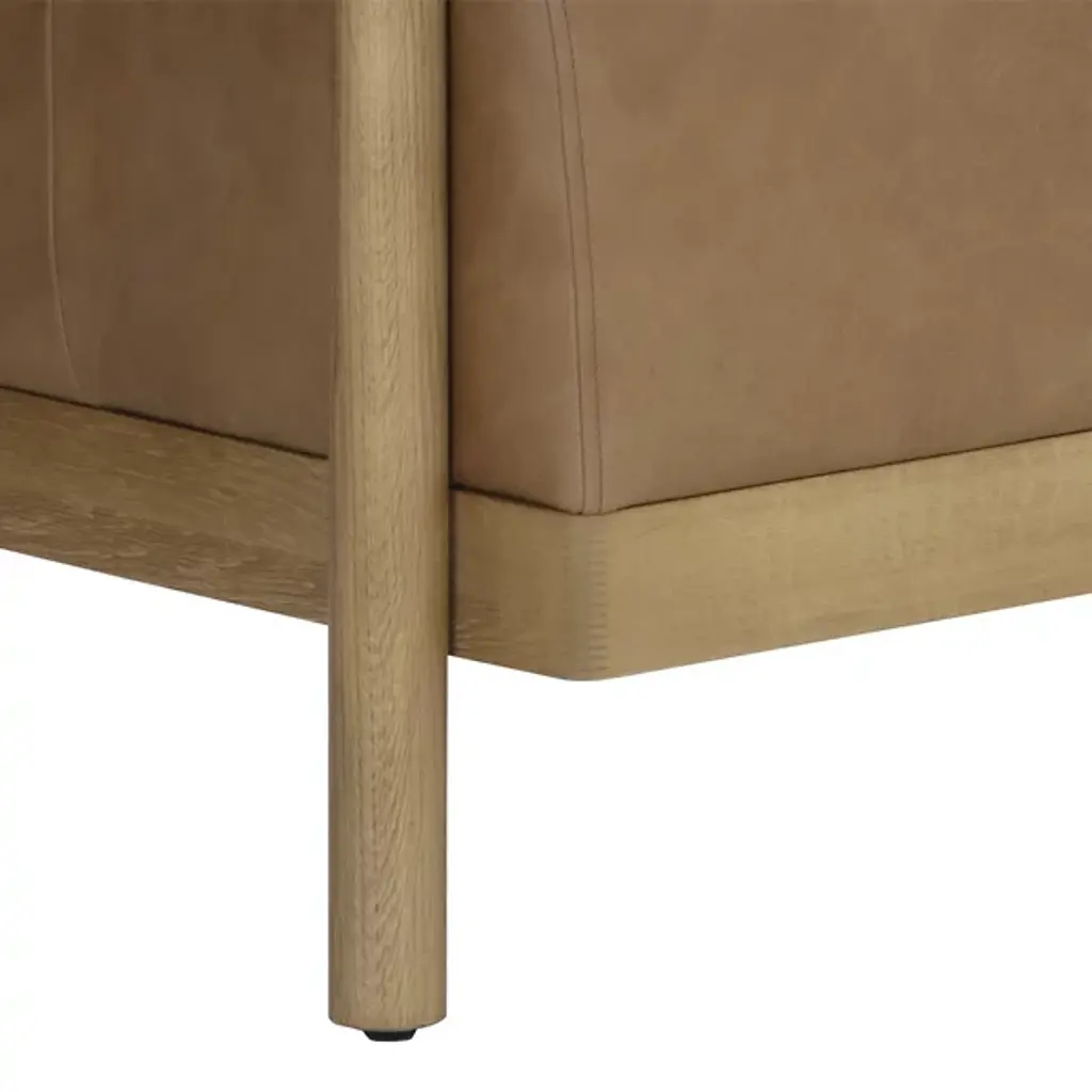 The Bromley Sofa from Sunpan makes a striking statement in any living space with its voluminous contours and inviting design. Upholstered in a luxurious fabric, this sofa offers wide arms and backrests for enhanced comfort. The oak wood base and detailing introduce a rustic touch, adding warmth to the overall aesthetic. Crafted from organic, porous wood, each piece features unique variations in texture, color, and grain, along with fine indentations, cracks, visible knots, and burls, all contributing to the sofa's distinctive character and charm.