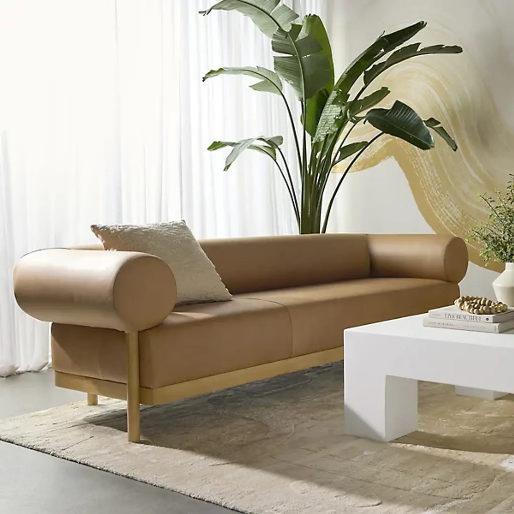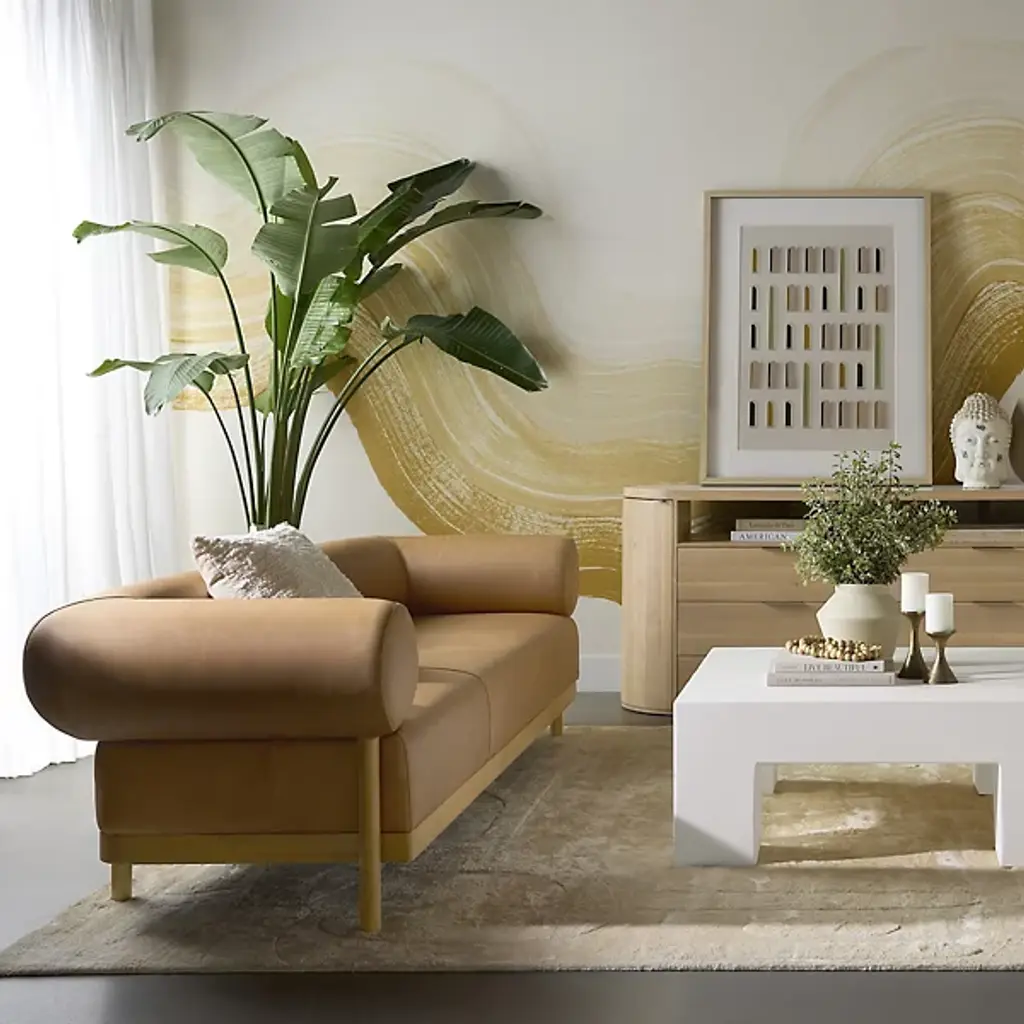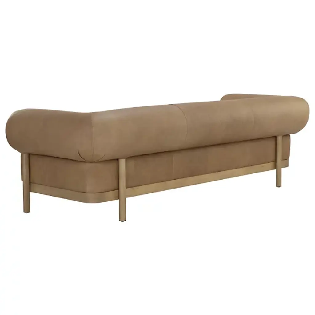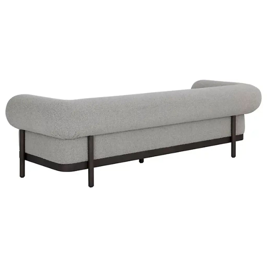 The Bromley Sofa from Sunpan makes a striking statement in any living space with its voluminous contours and inviting design. Upholstered in a luxurious fabric, this sofa offers wide arms and backrests for enhanced comfort. The oak wood base and detailing introduce a rustic touch, adding warmth to the overall aesthetic. Crafted from organic, porous wood, each piece features unique variations in texture, color, and grain, along with fine indentations, cracks, visible knots, and burls, all contributing to the sofa's distinctive character and charm.