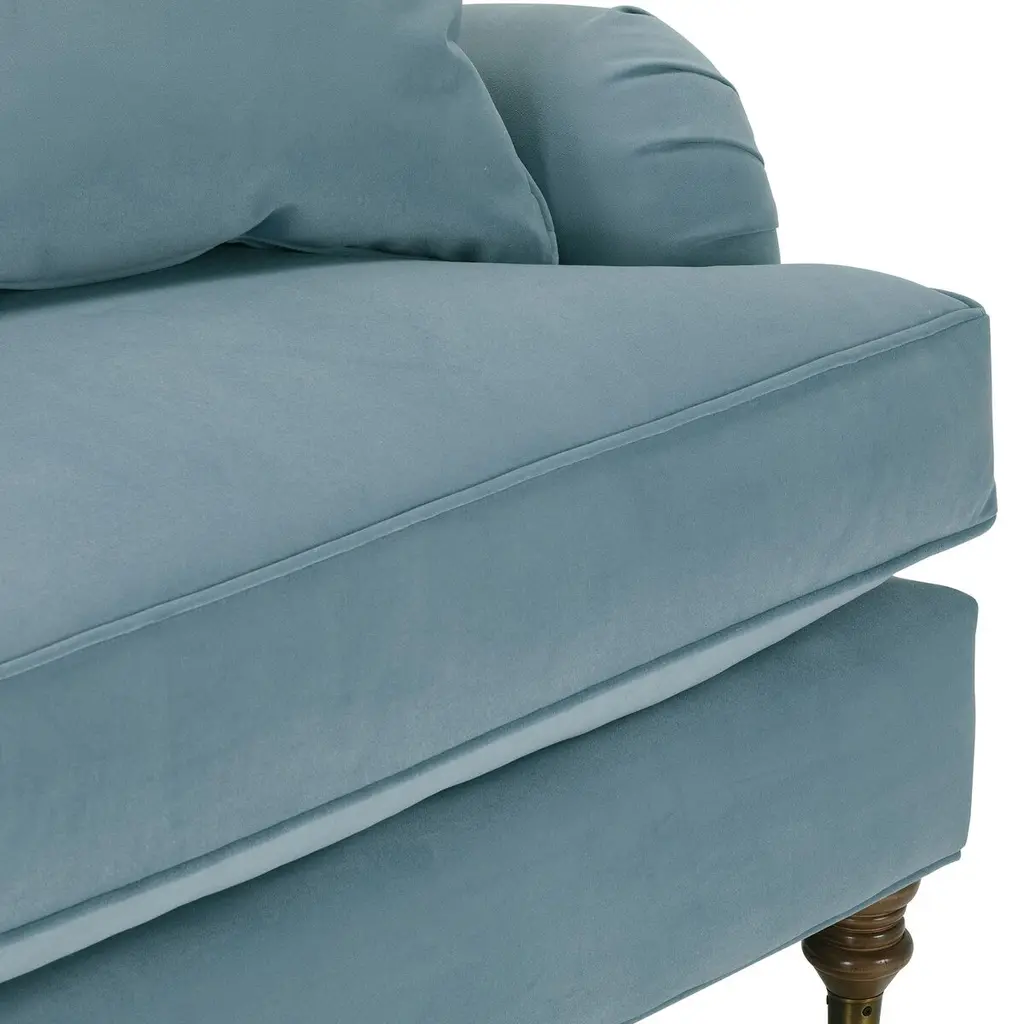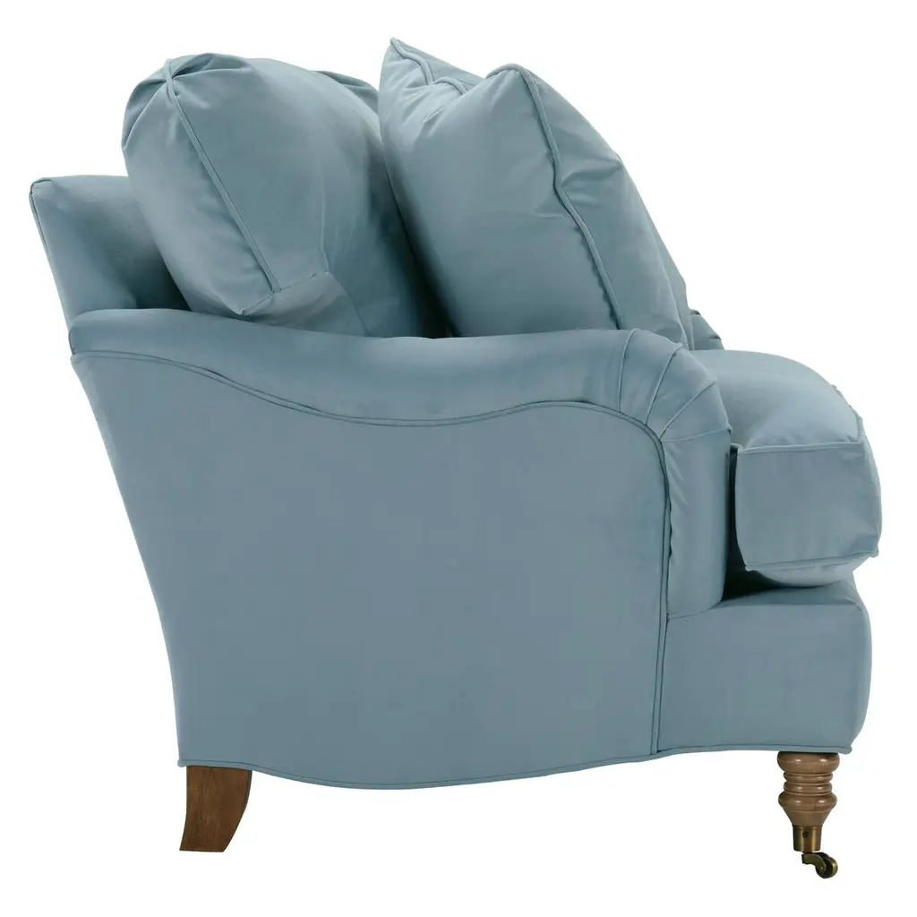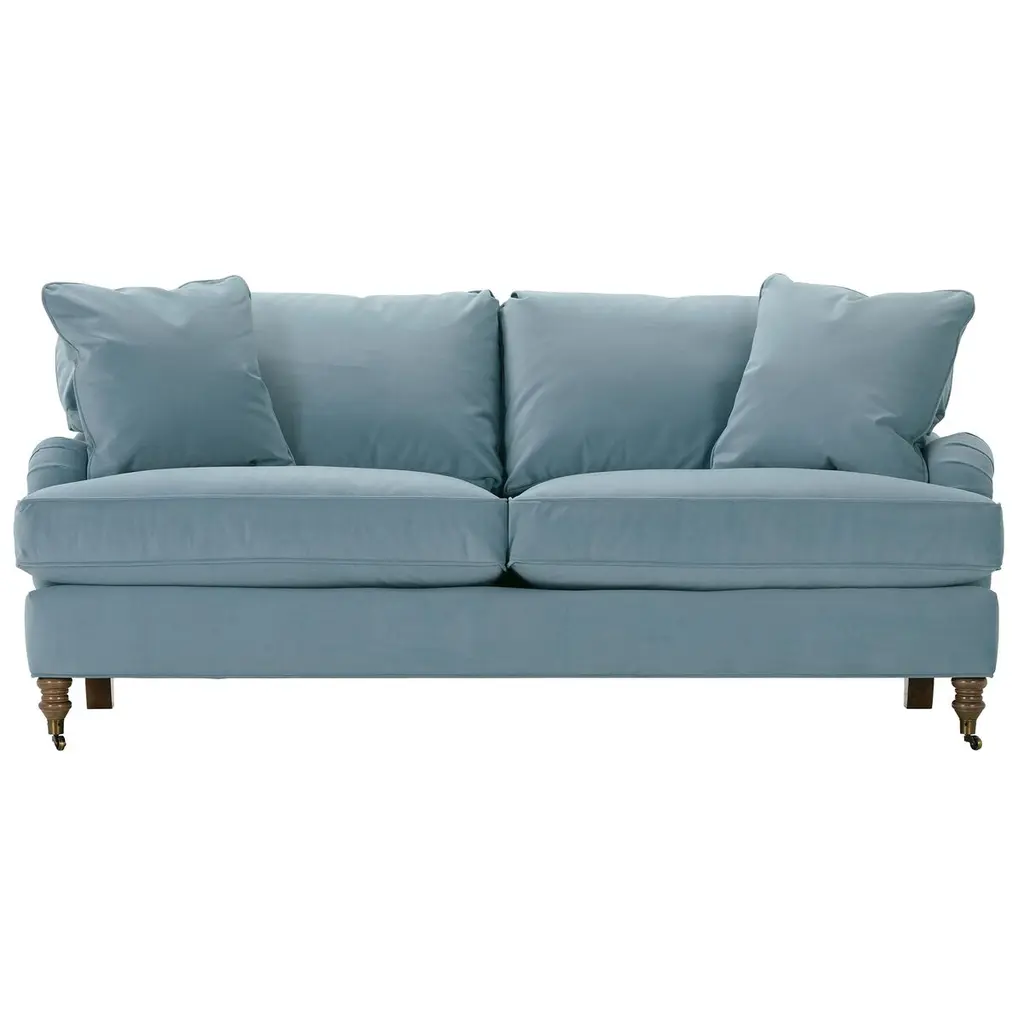 Designed by us and available only at One Kings Lane: This English-arm sofa is made elegant and inviting with a relaxed silhouette framed in kiln-dried hardwood, finely turned front legs capped with brass casters, and a lofty down-and-feather fill.