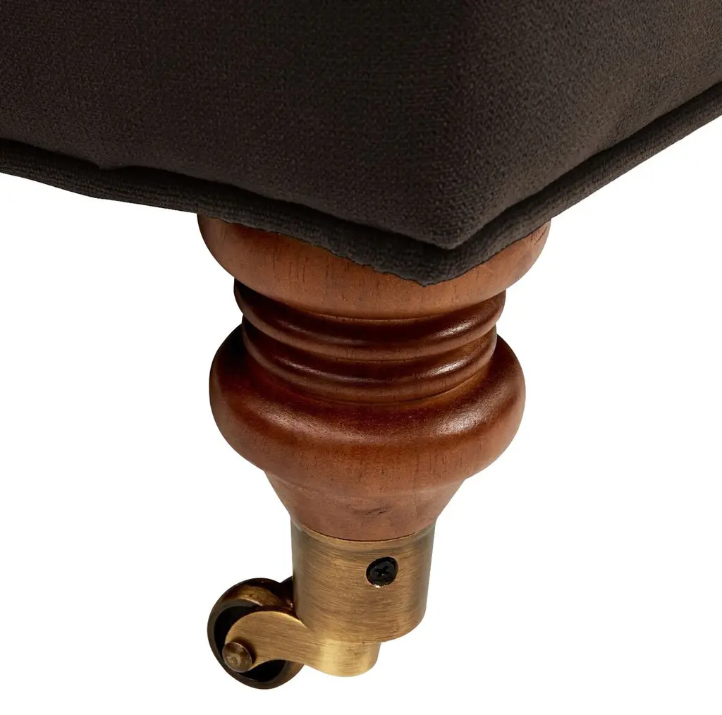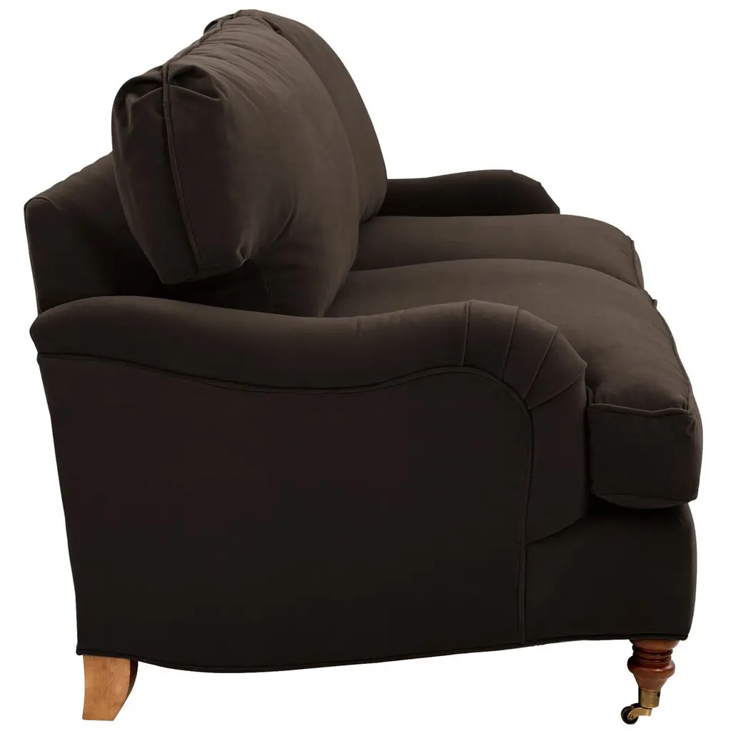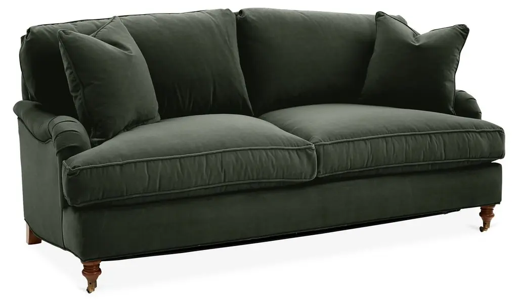Designed by us and available only at One Kings Lane: This English-arm sofa is made elegant and inviting with a relaxed silhouette framed in kiln-dried hardwood, finely turned front legs capped with brass casters, and a lofty down-and-feather fill.