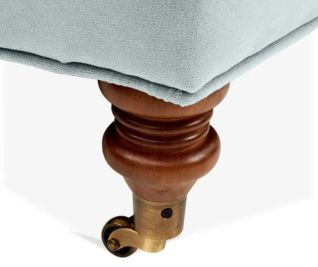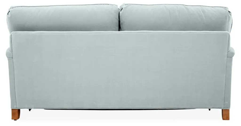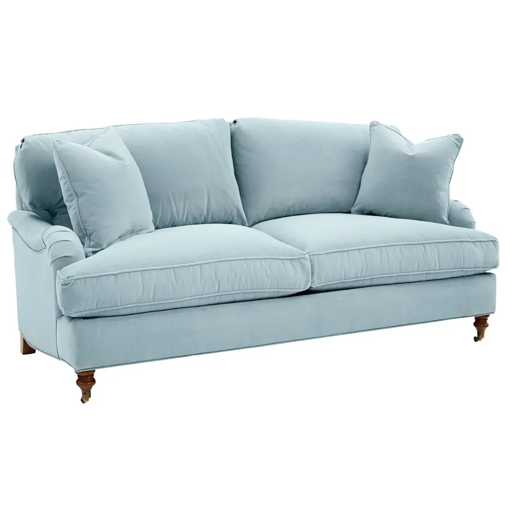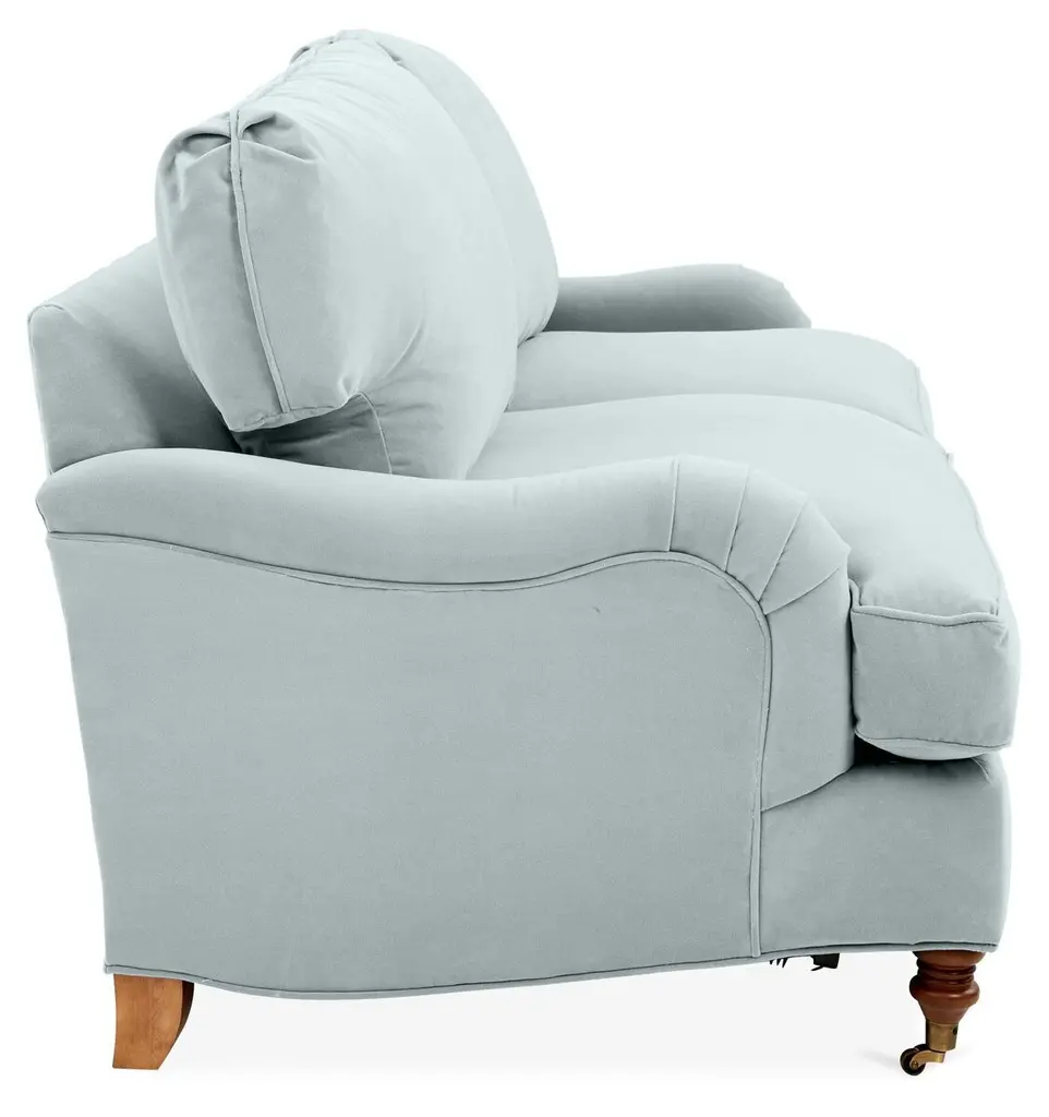 Designed by us and available only at One Kings Lane: This English-arm sofa is made elegant and inviting with a relaxed silhouette framed in kiln-dried hardwood, finely turned front legs capped with brass casters, and a lofty down-and-feather fill.